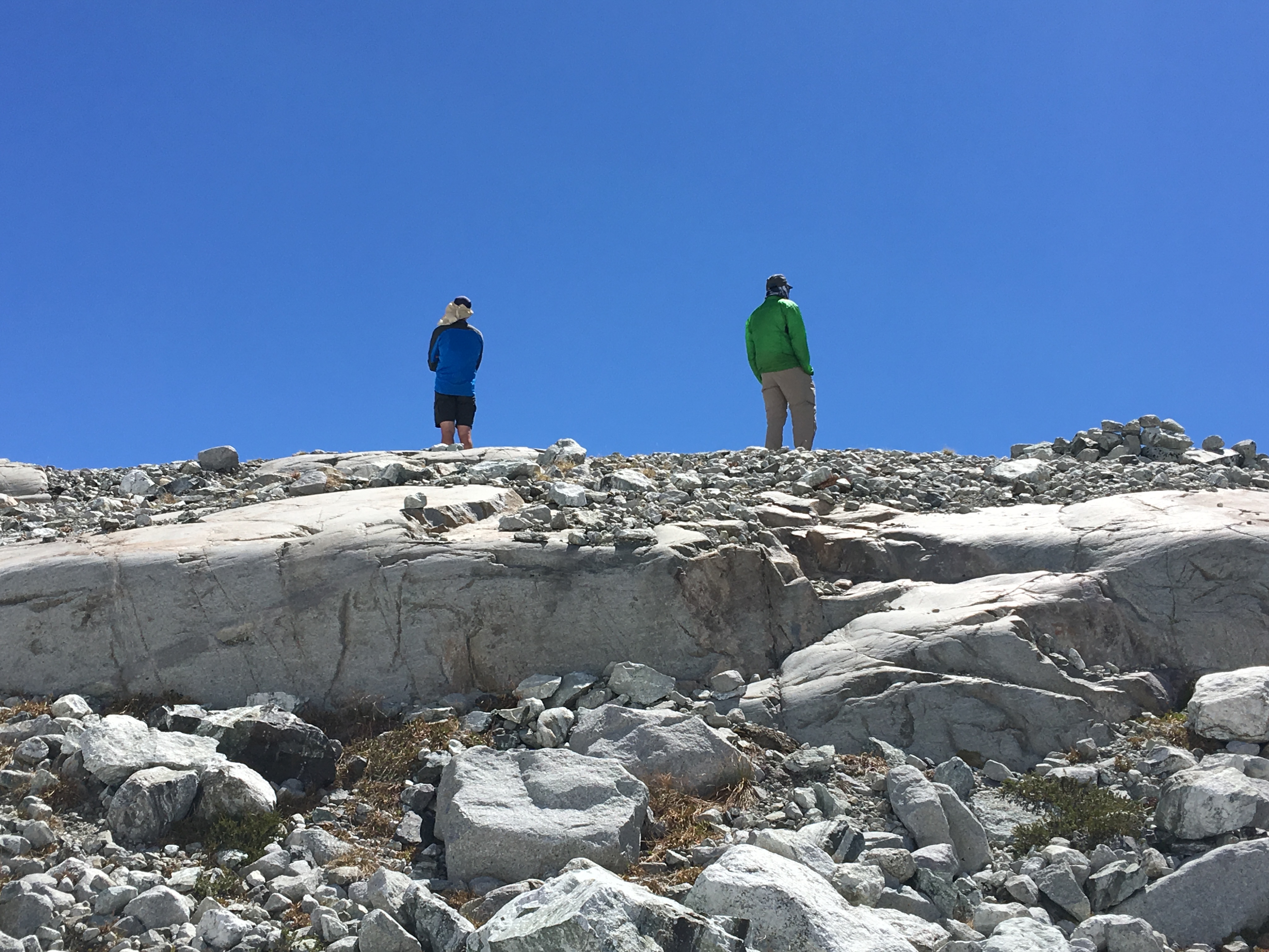 What we had forgotten was the loose, rock bands that ran through the snow field. We were making good time and I was actually feeling pretty good. I had found a stride where I could just swing my left leg along. Thank goodness, my left leg was also on the downhill side. Then we hit the first rock band.