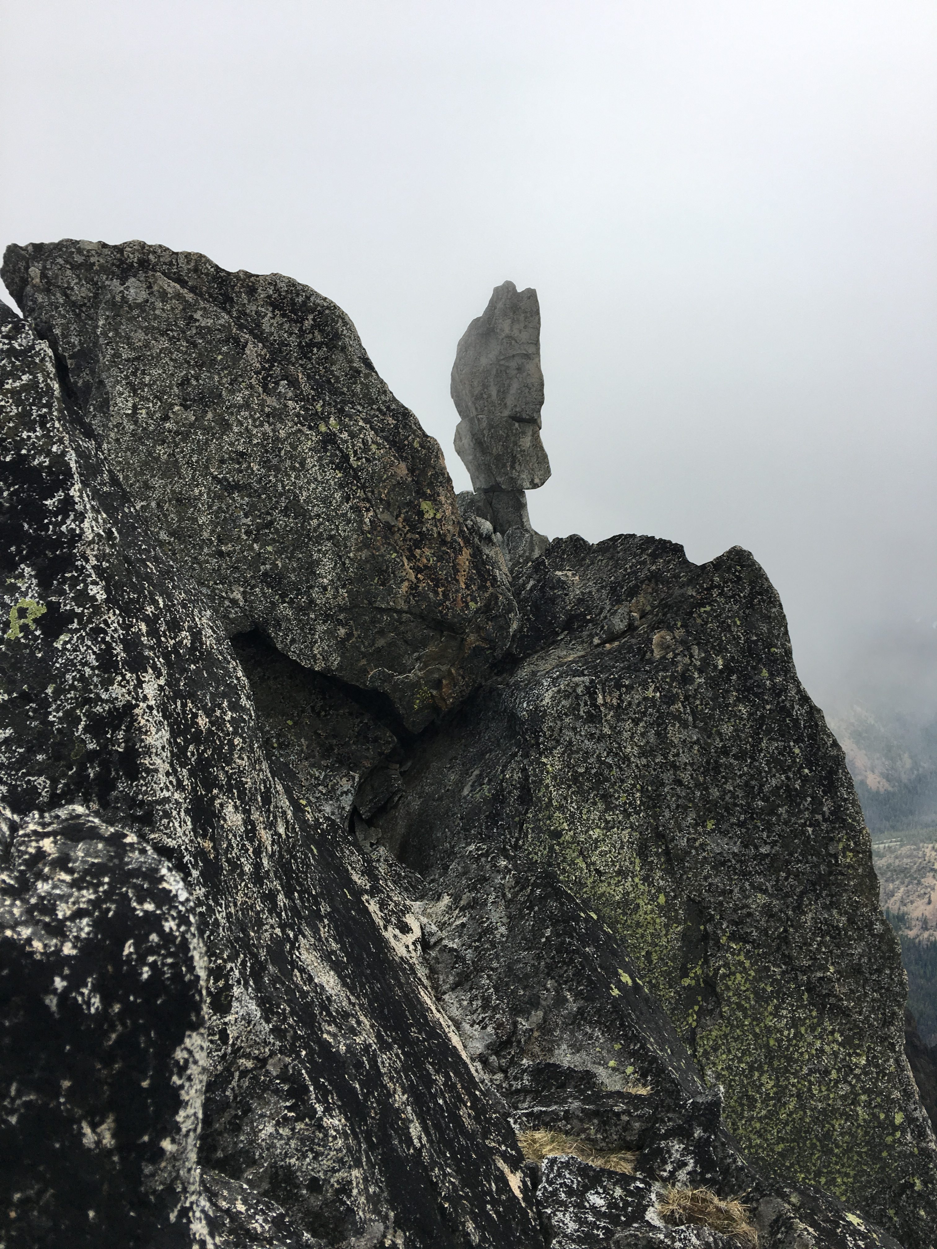 The next morning was beautiful. We quickly gained the remaining 500 feet to cross over the ridge to the basin below Sherpa. The balanced rock is unbelievable. Jim and I were thankful that the balanced rock is not the high point.