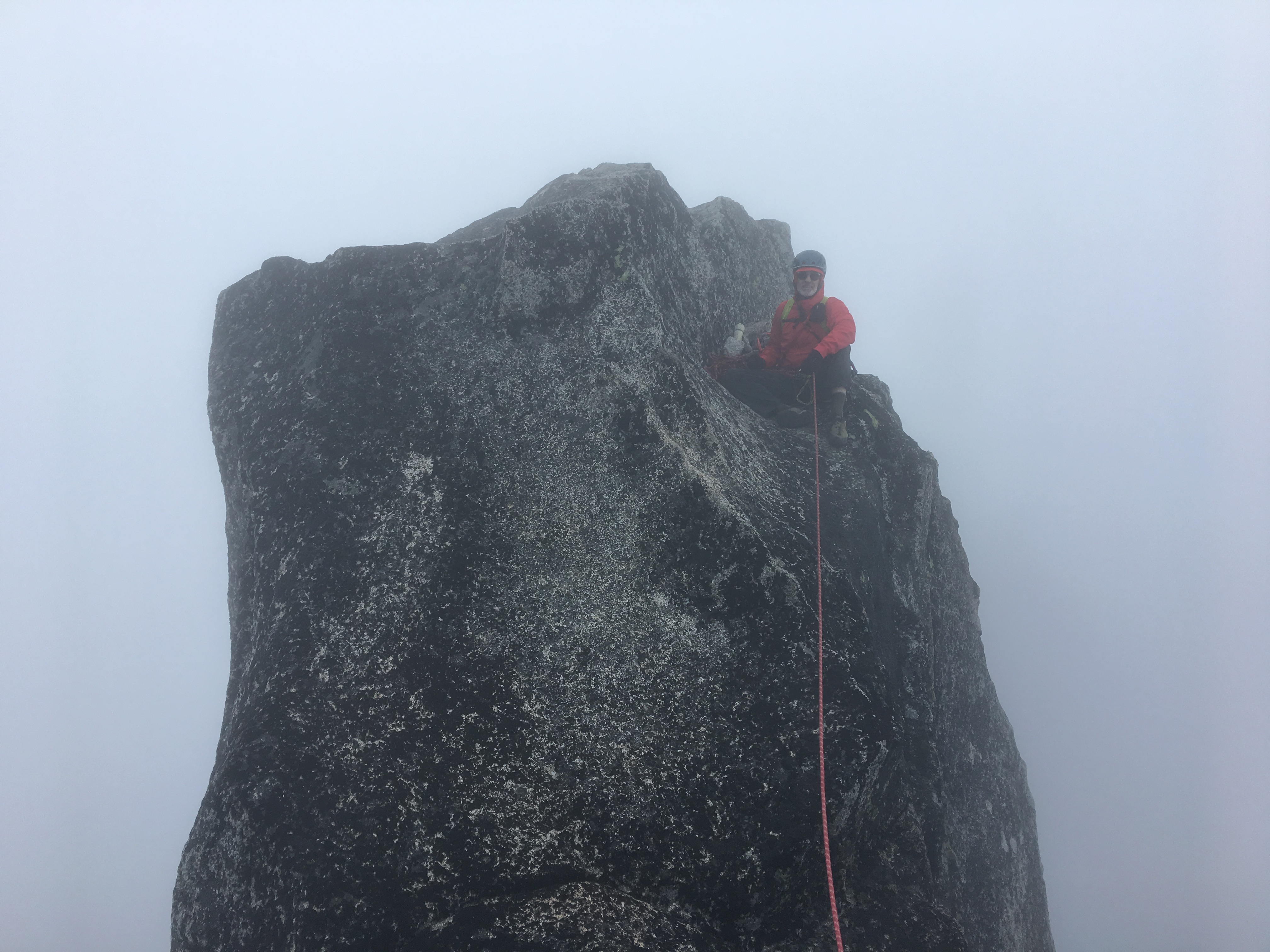 We did 4 rappels (2 were over hanging) and 1 running belay. Standing and waiting to rappel was brutally cold. We were both so glad to glad off the east ridge and return to the gully leading down. The dense cloud cover made everything go so slow. We had to navigate off memory.