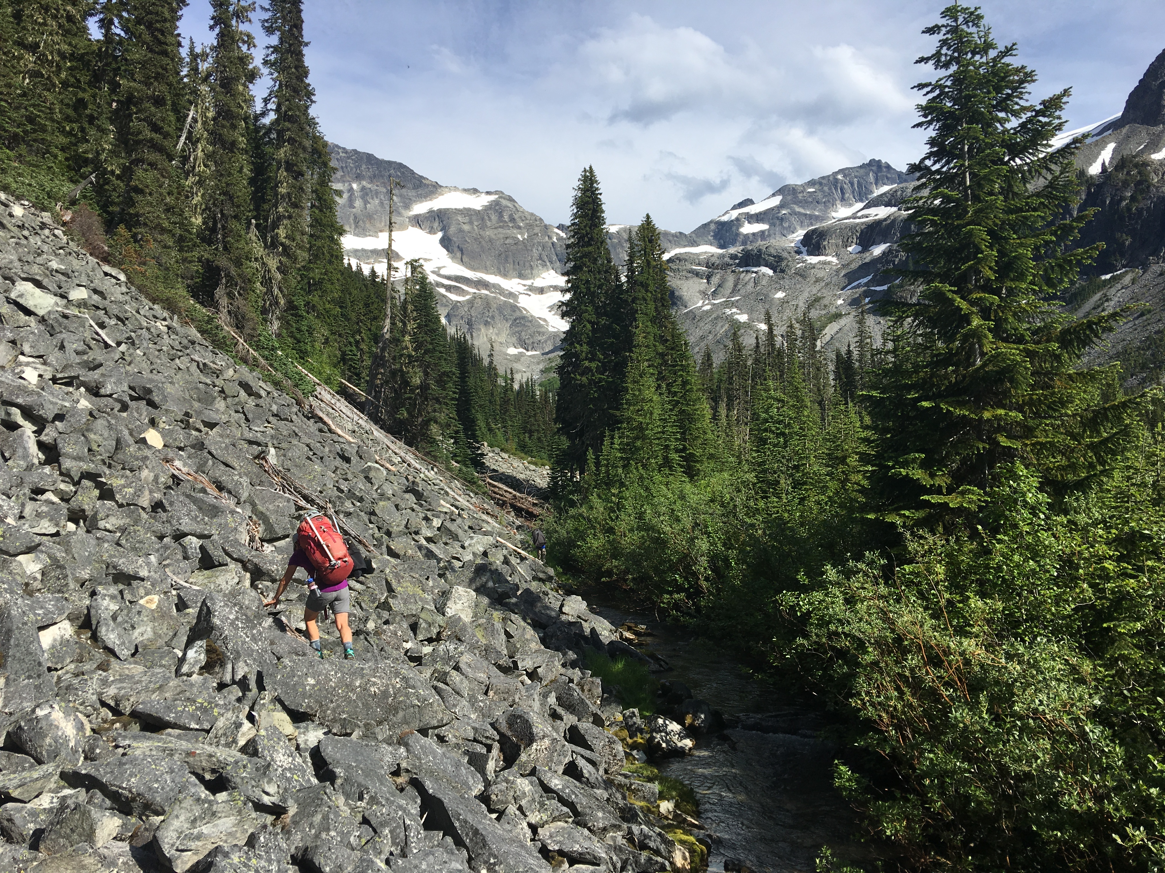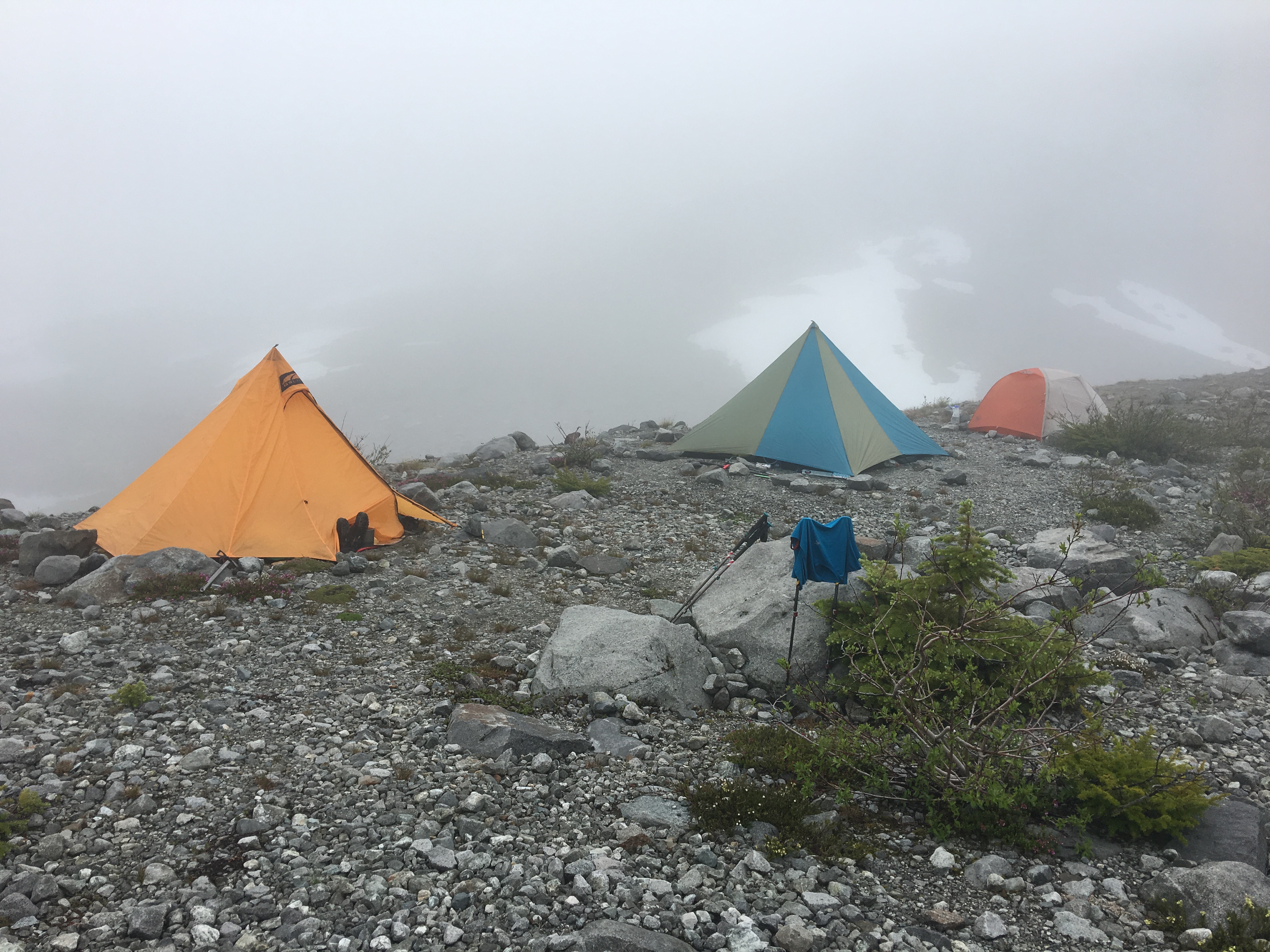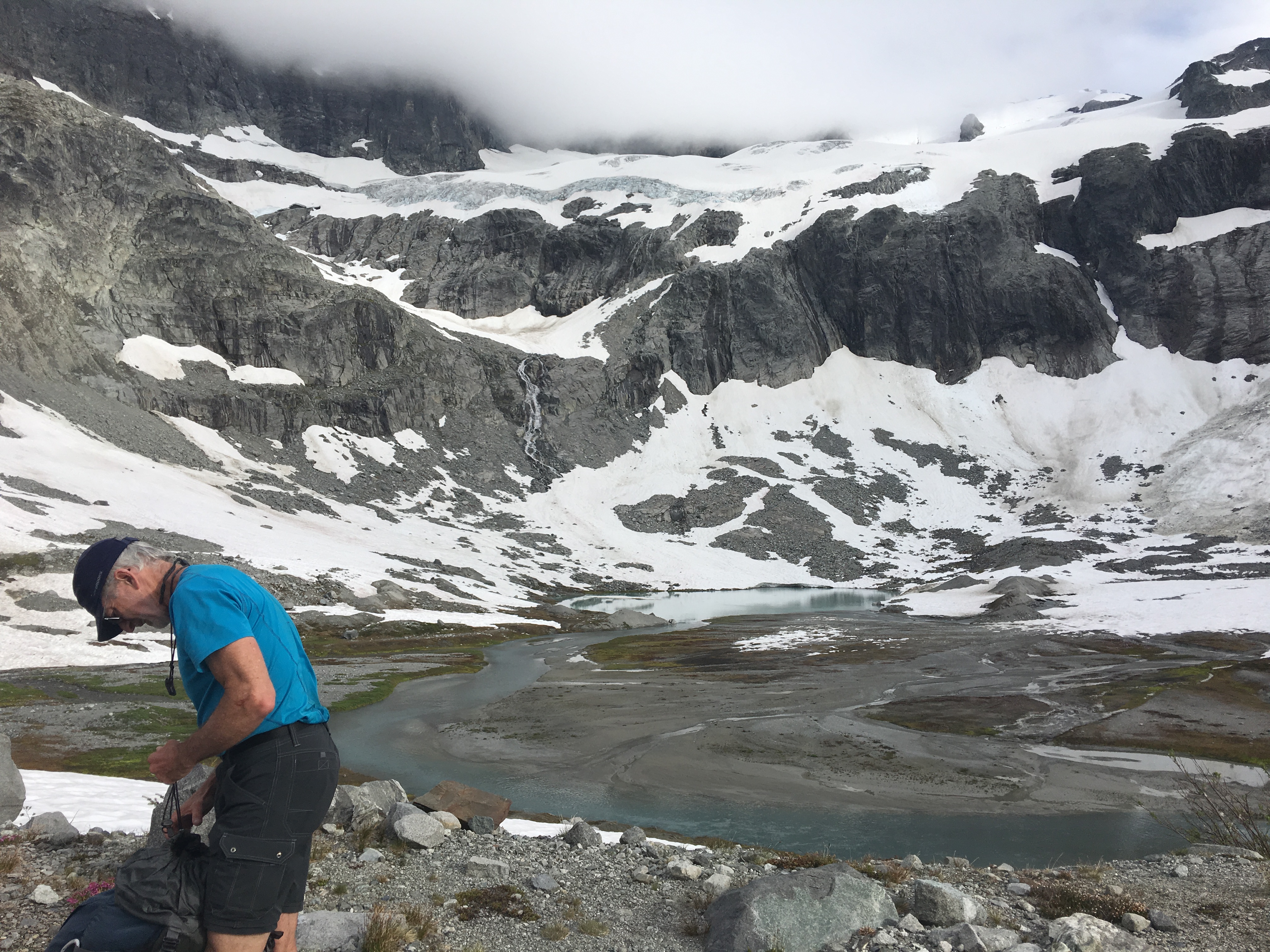 Eventually, we came to the lake which was not completely melted out. We found nice dry camping on the moraine with near by running water. As we set up camp, the clouds began to come in.