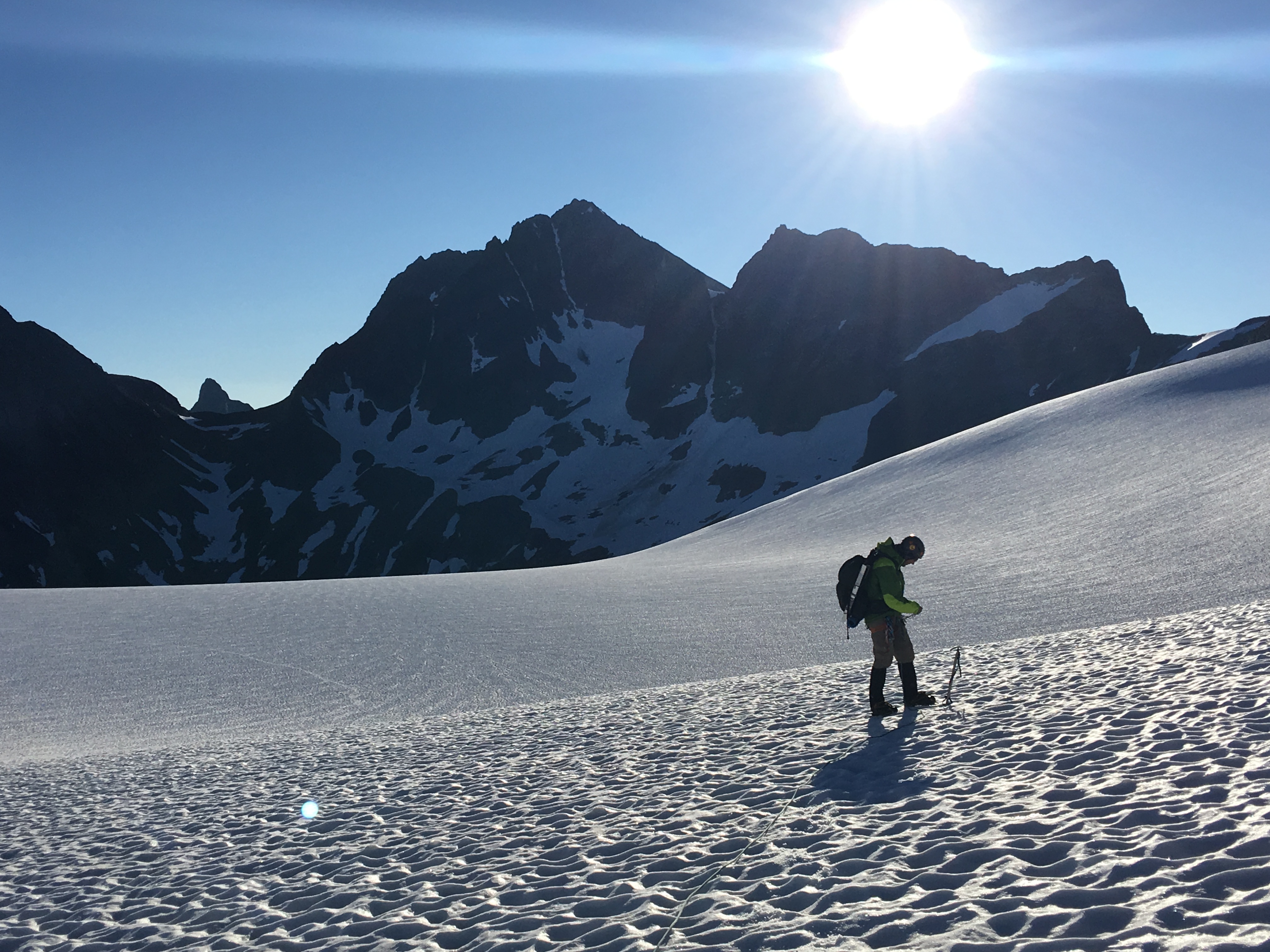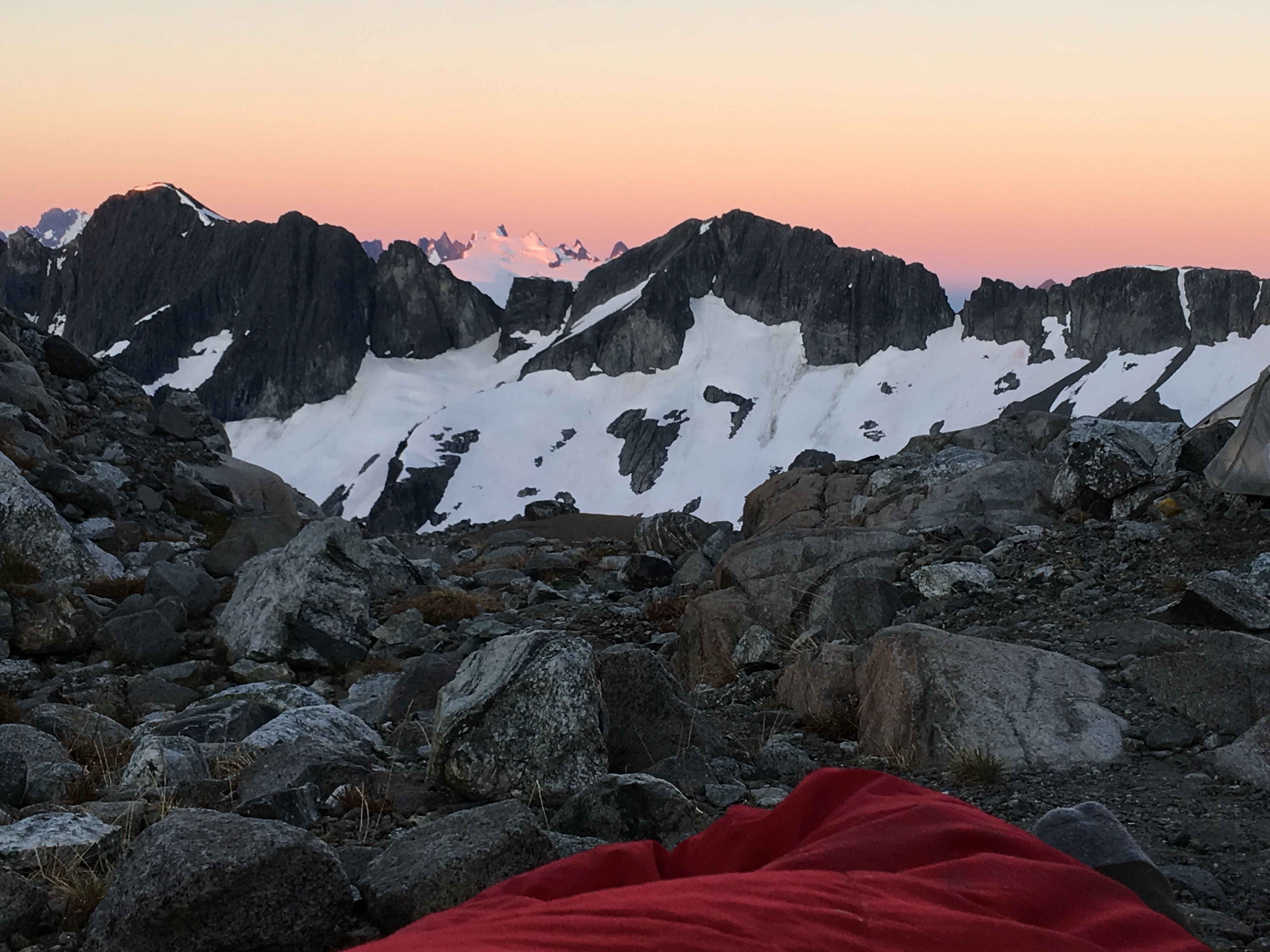 From the low spot, we were able to reach the glacier with a single, double rope rappel. We got back to camp just before dark. As we ate dinner, we discussed the next day.