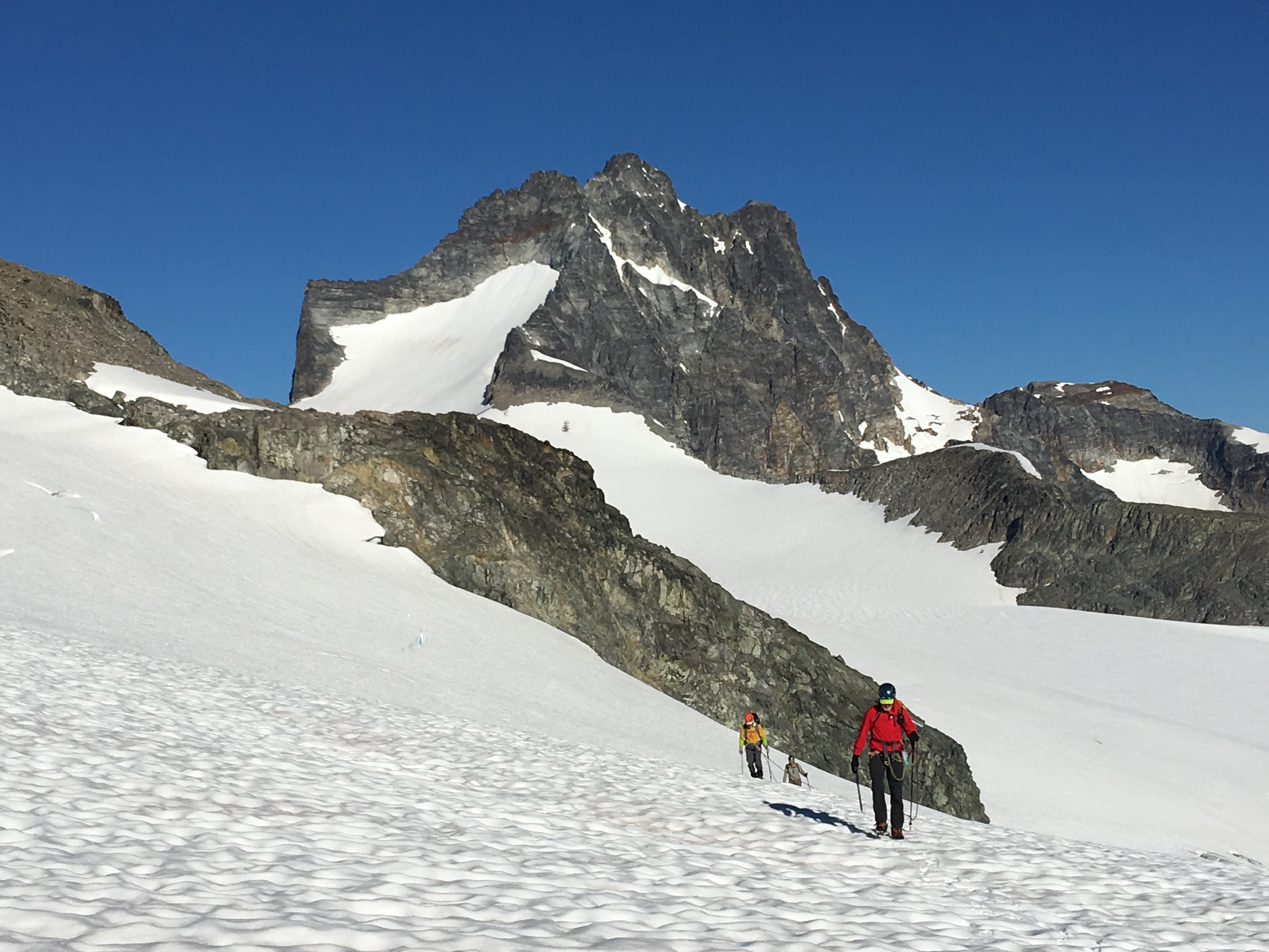 We were able to get back to the low spot on the ridge with one very long running belay. In the end, Jim had to get very creative with protection. One piece involved placing an ice axe tightly in a rock crack.