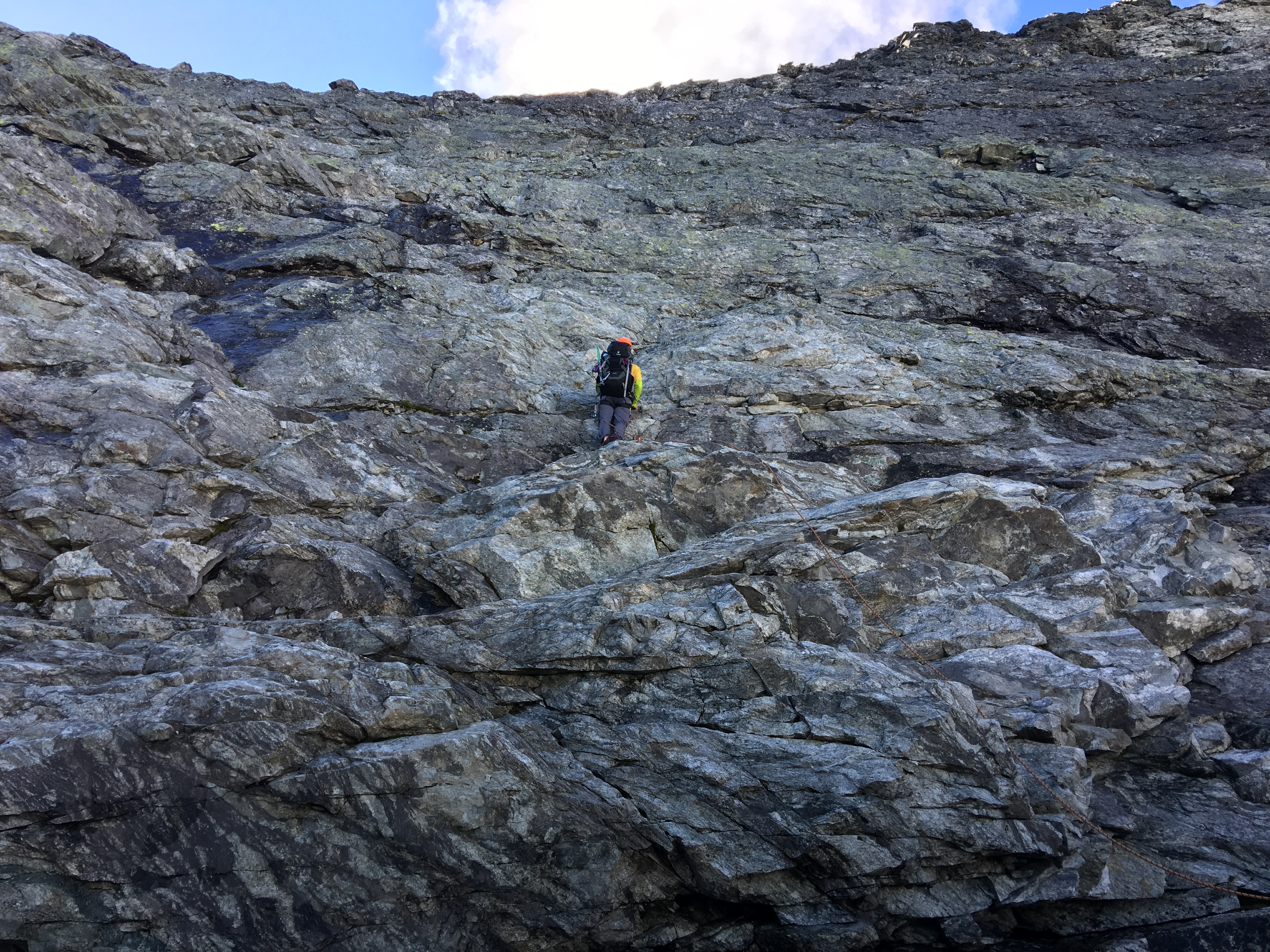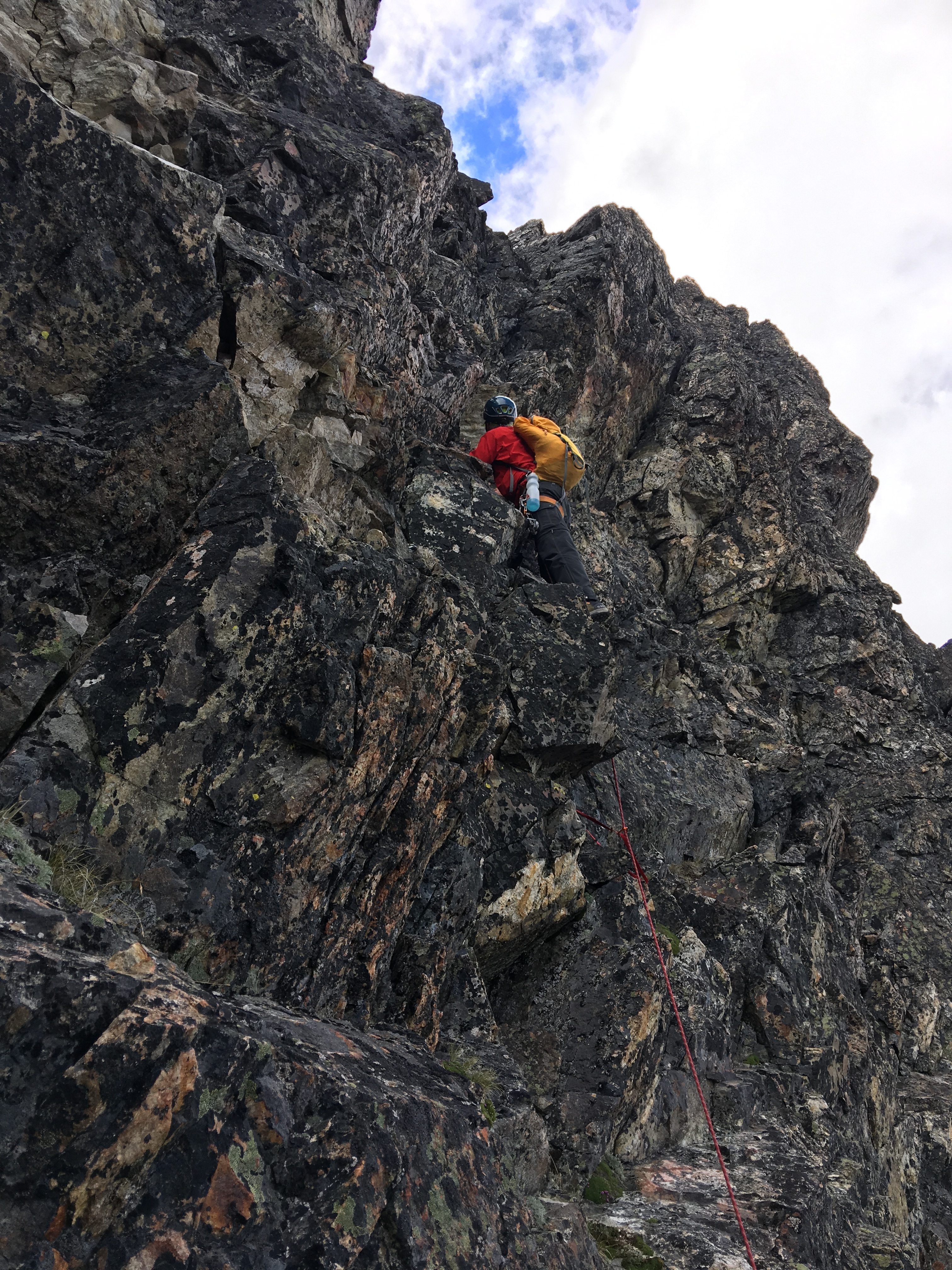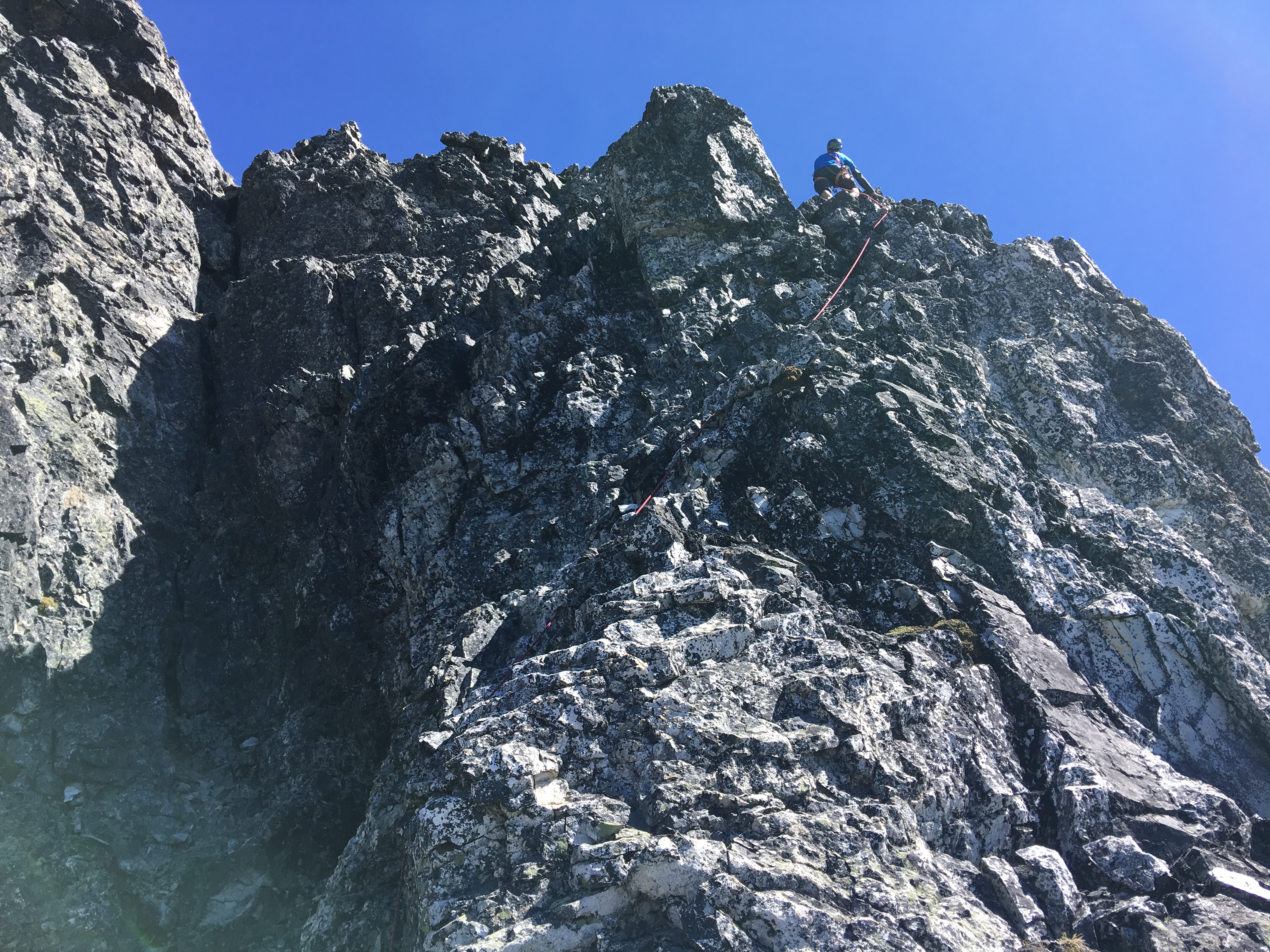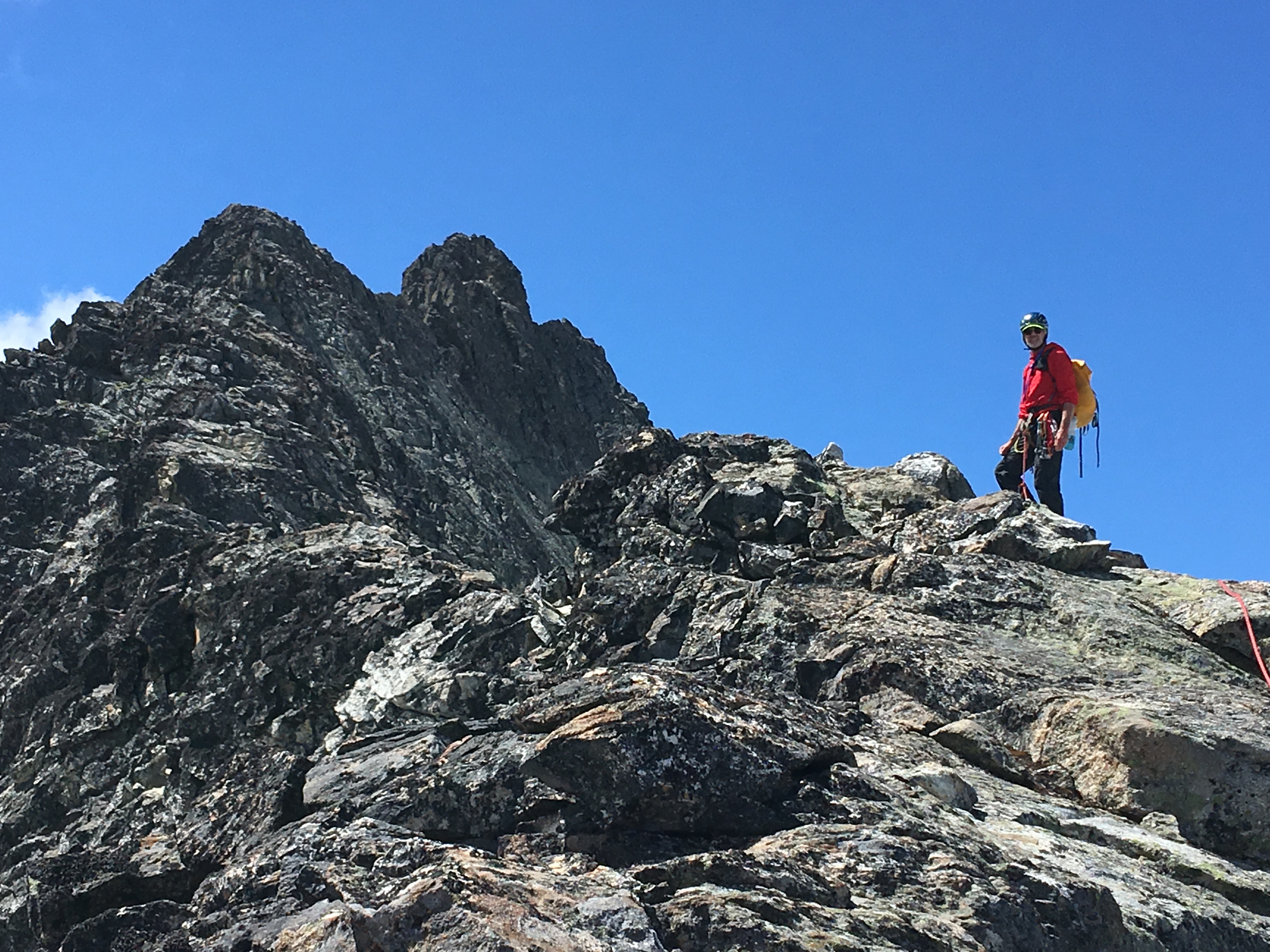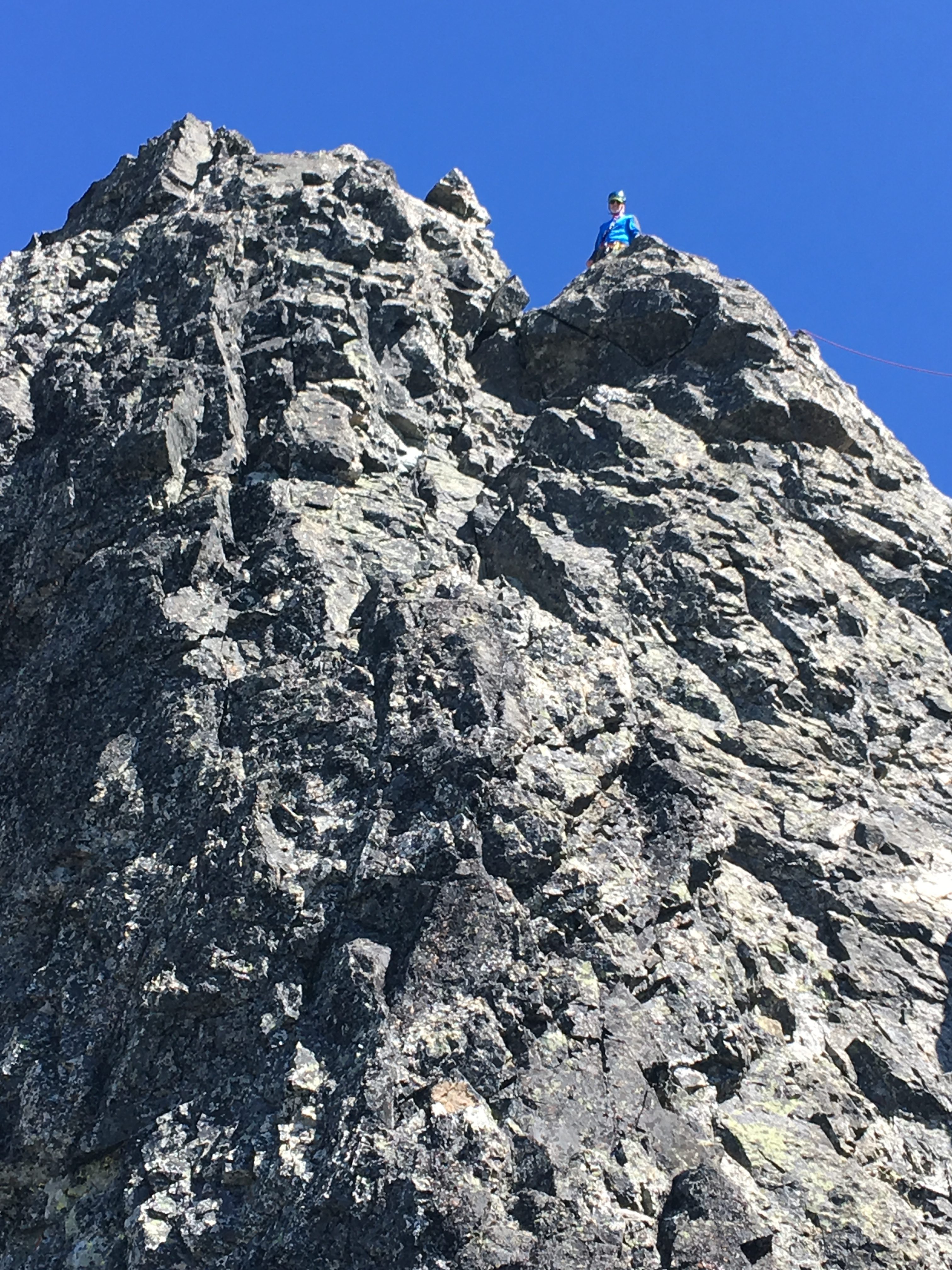 The final pitch was a short, exposed class 3 scramble. We stayed roped.
