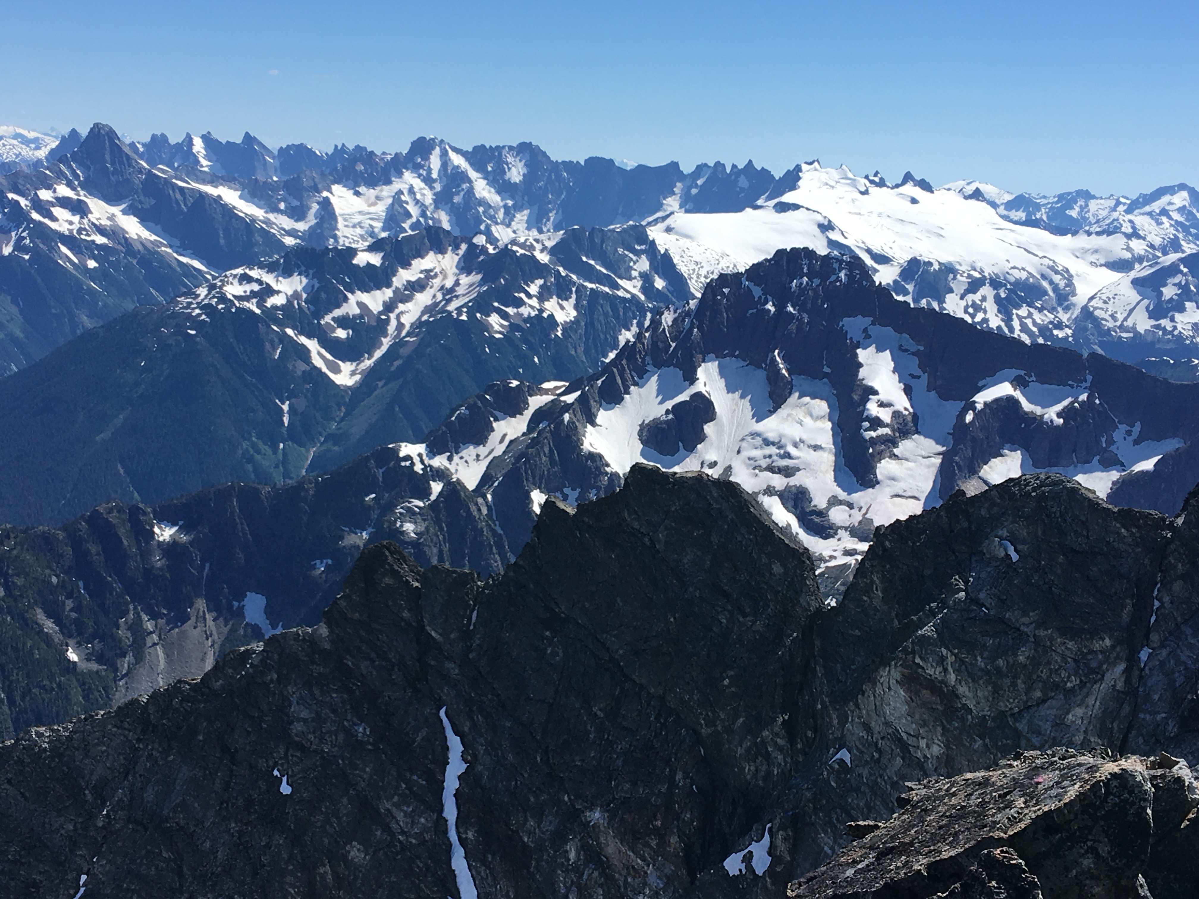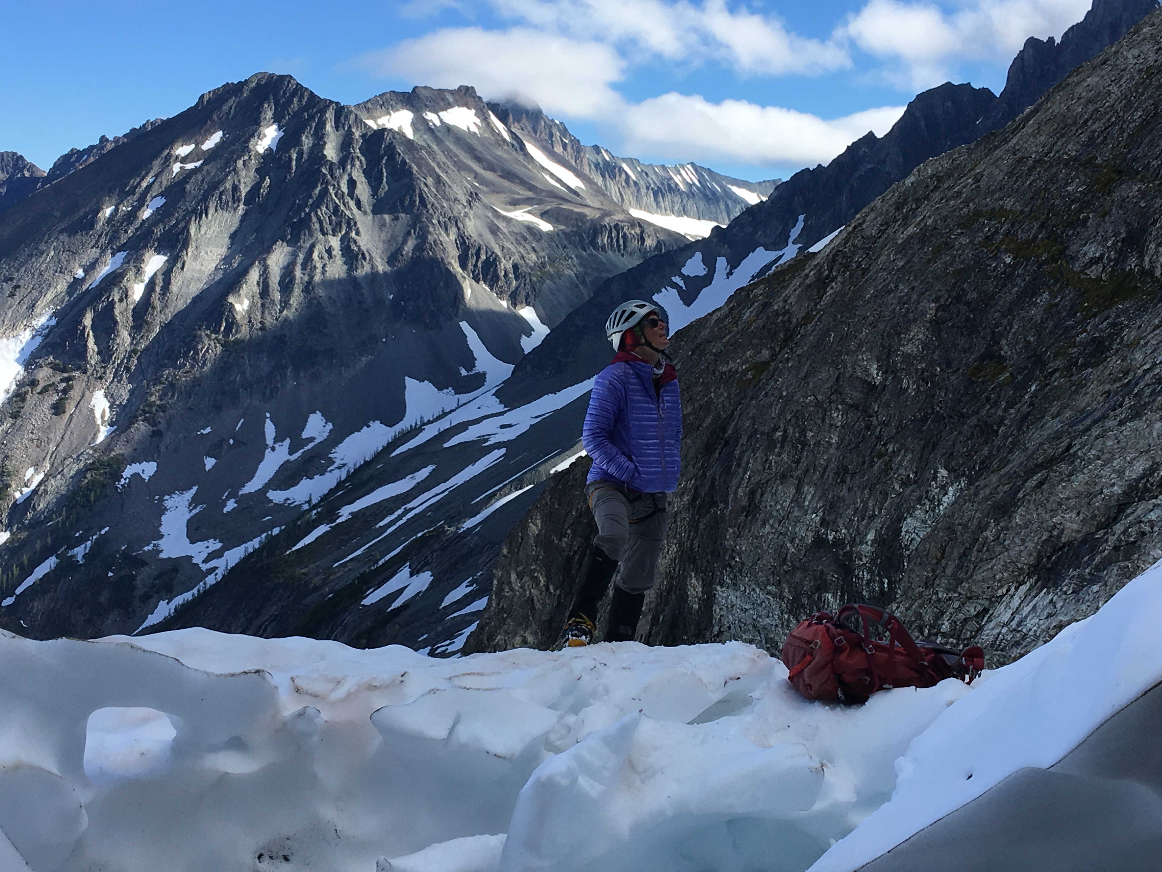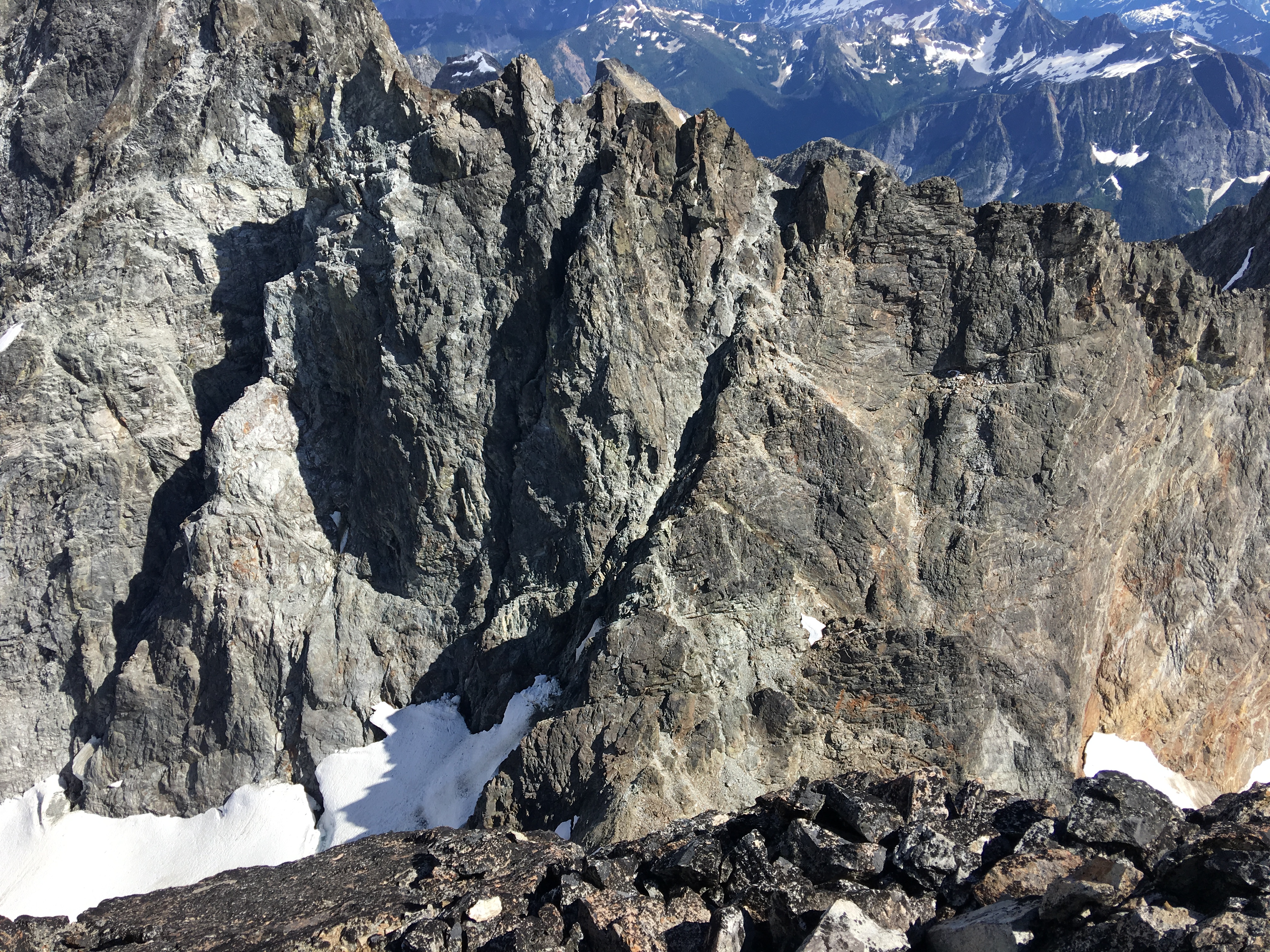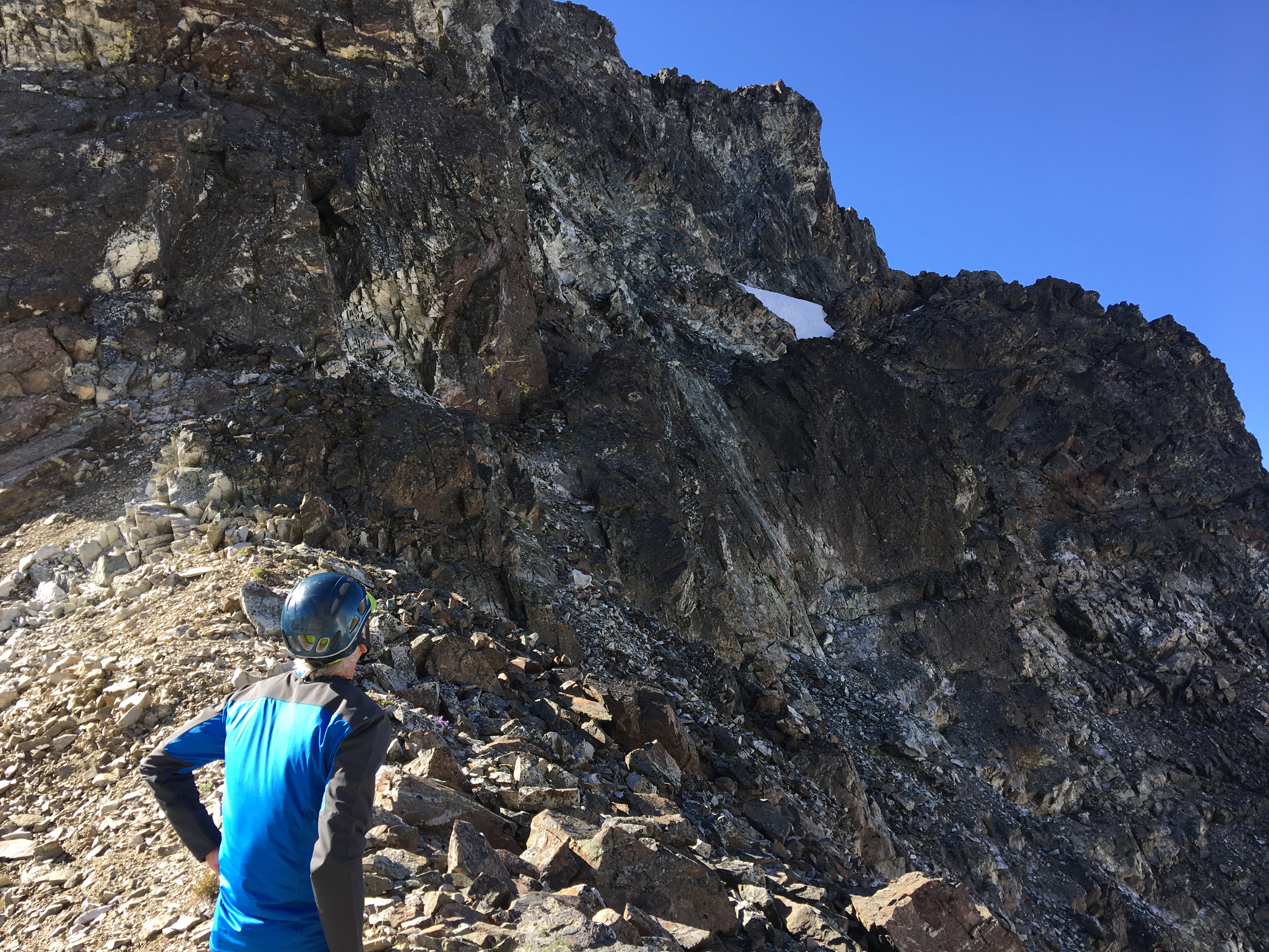 The final 100 feet of ridge contained horns that we needed to work around so we downclimbed the ridge to a lower ledge…
