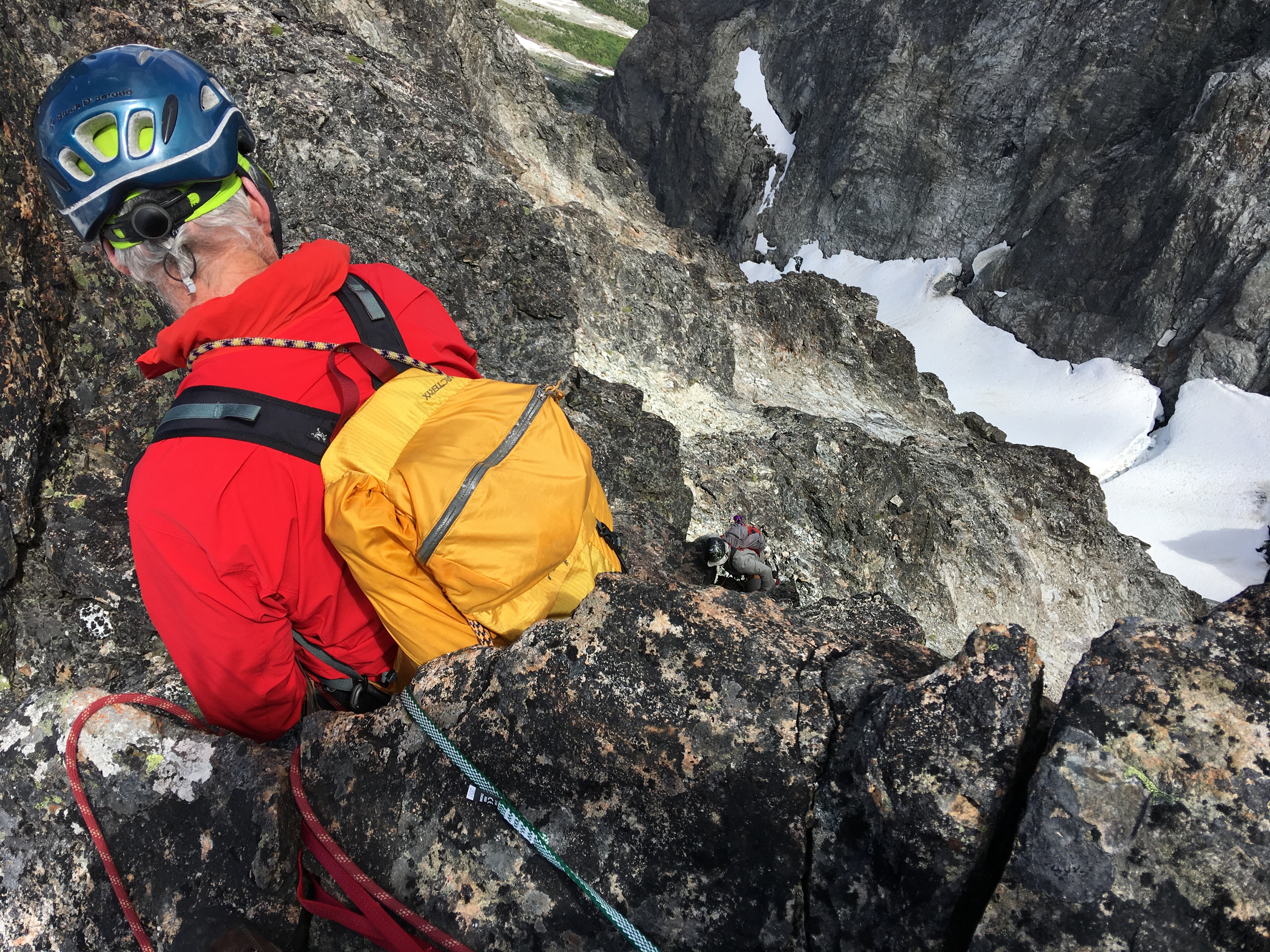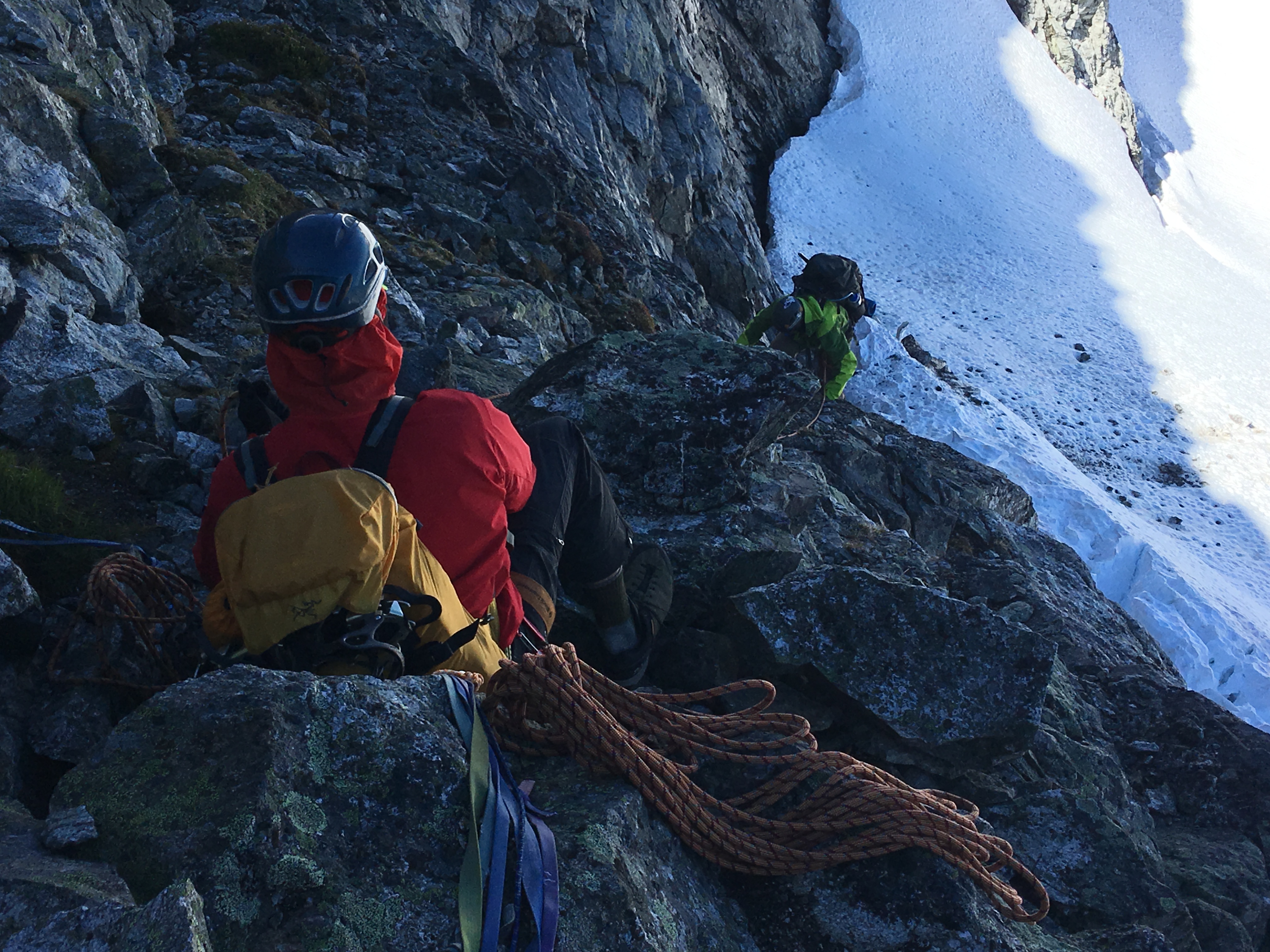 From here, everyone was belayed back up the ridge…