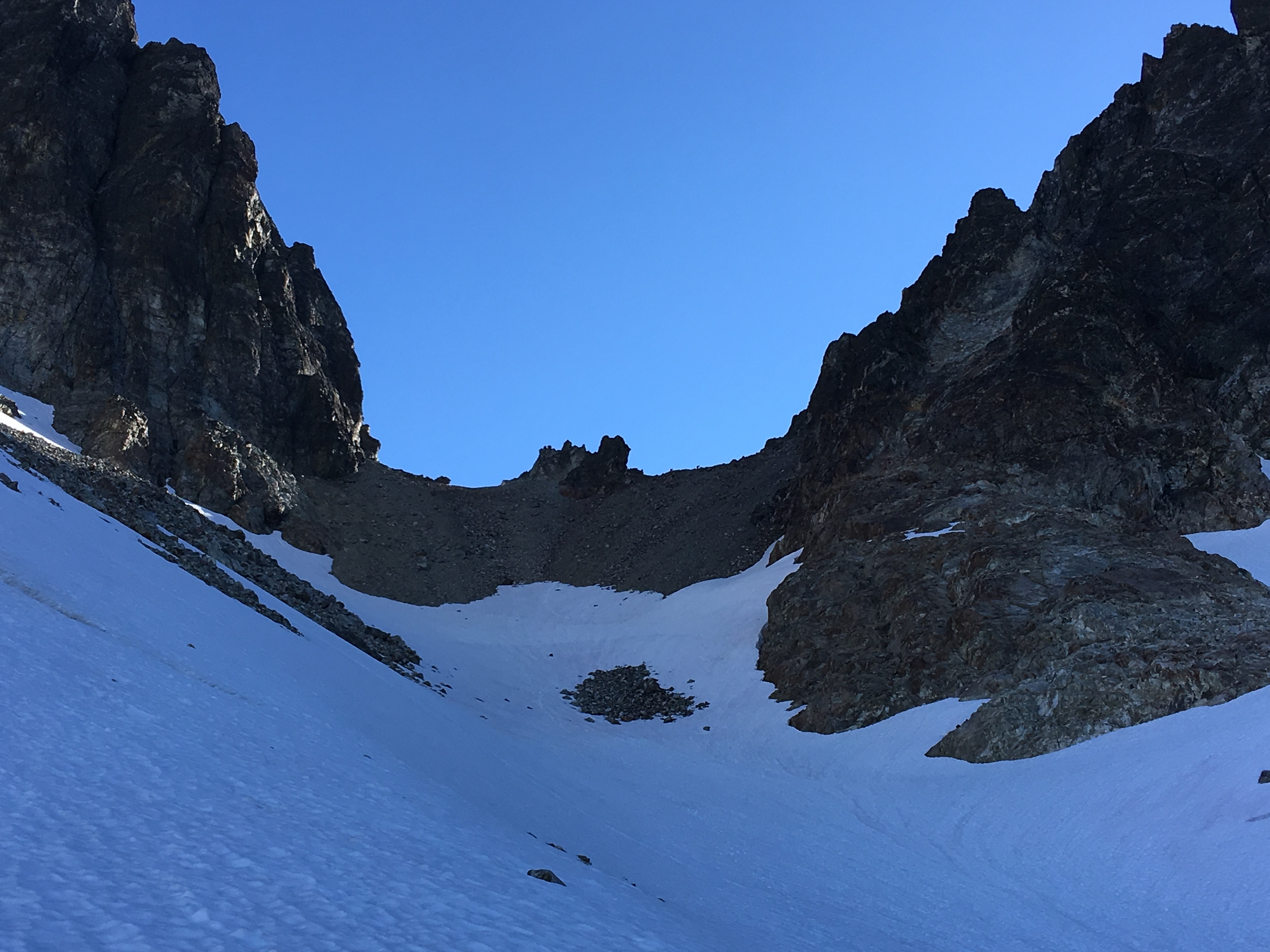 We took the ramp leading to the right out of Col of the Wild passed the snow patch described in Fay’s trip report. Entered a gully where we began scrambling up and right towards a notch in the Ridge of Gendarmes. We did rope for a class 4 wall. I was tired from the day before and did not want to make a climbing mistake.