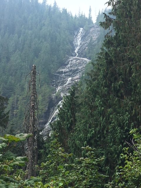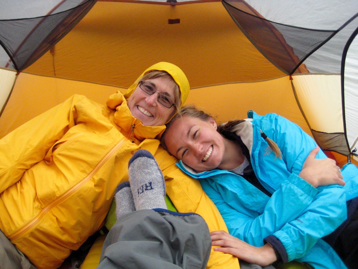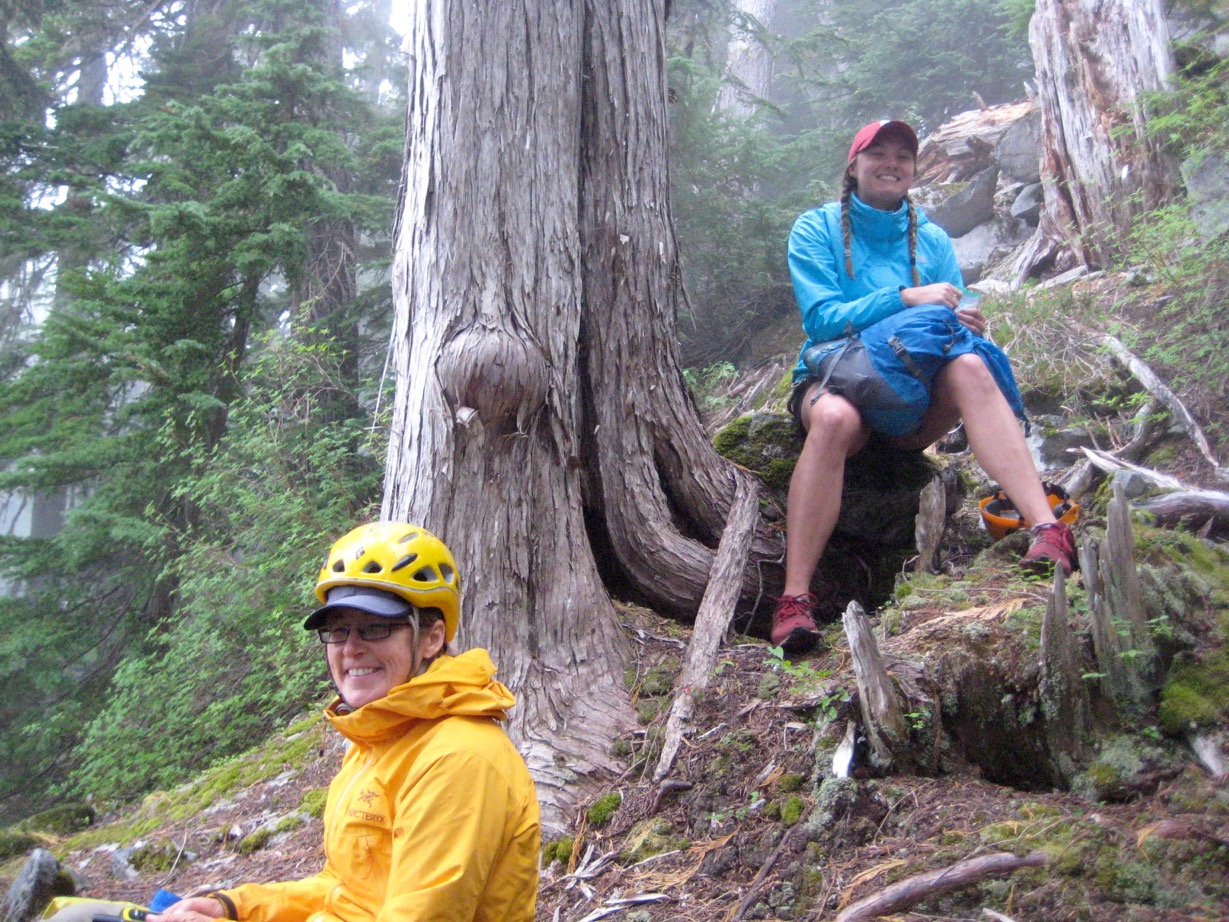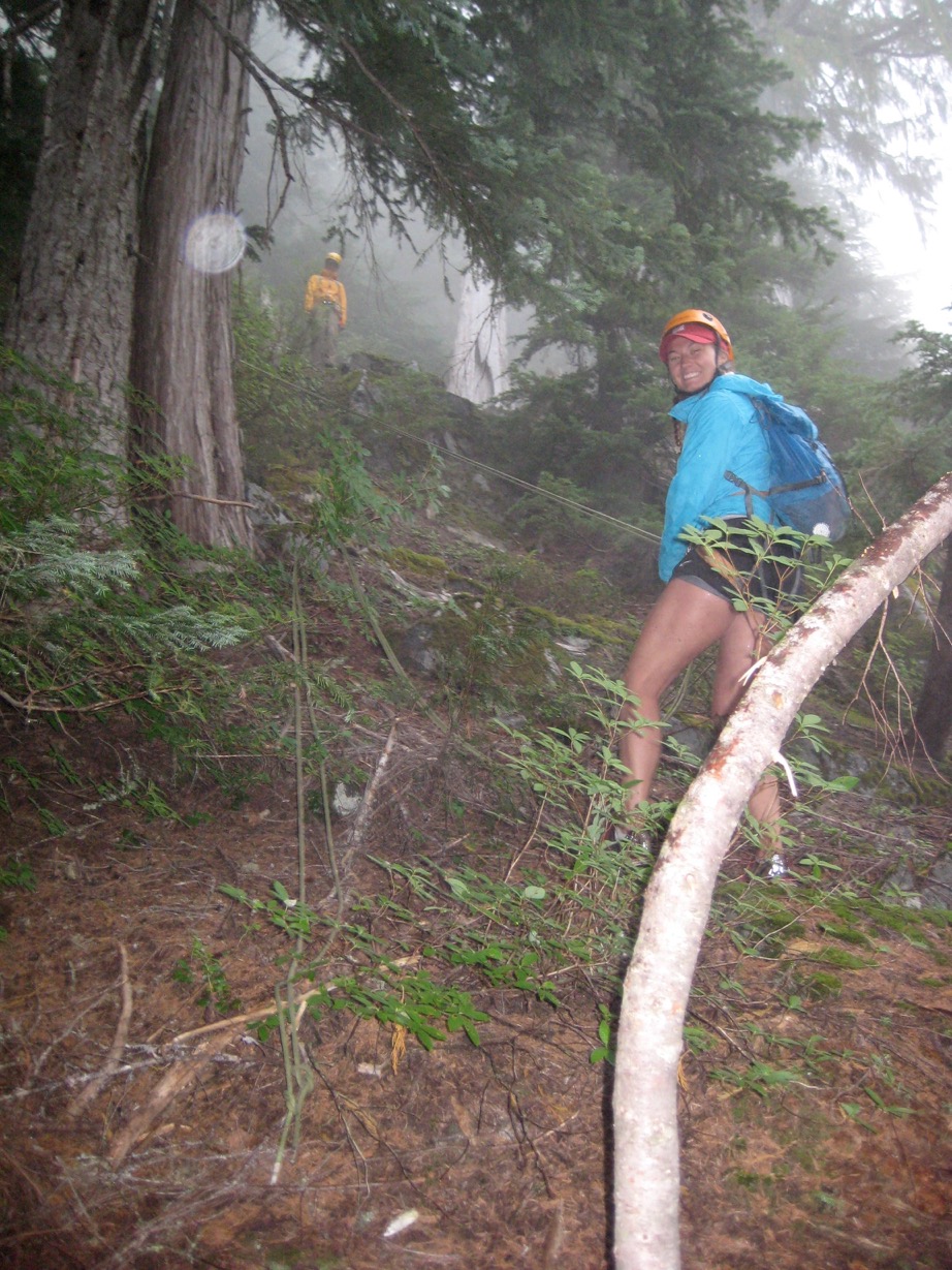 So we turned around and took the opportunity to teach Erika how to rappel. Then I didn’t have to downclimb the steep slope. Once back in camp, we realized it had rained off and on most of the afternoon. Good thing we were off in the trees.