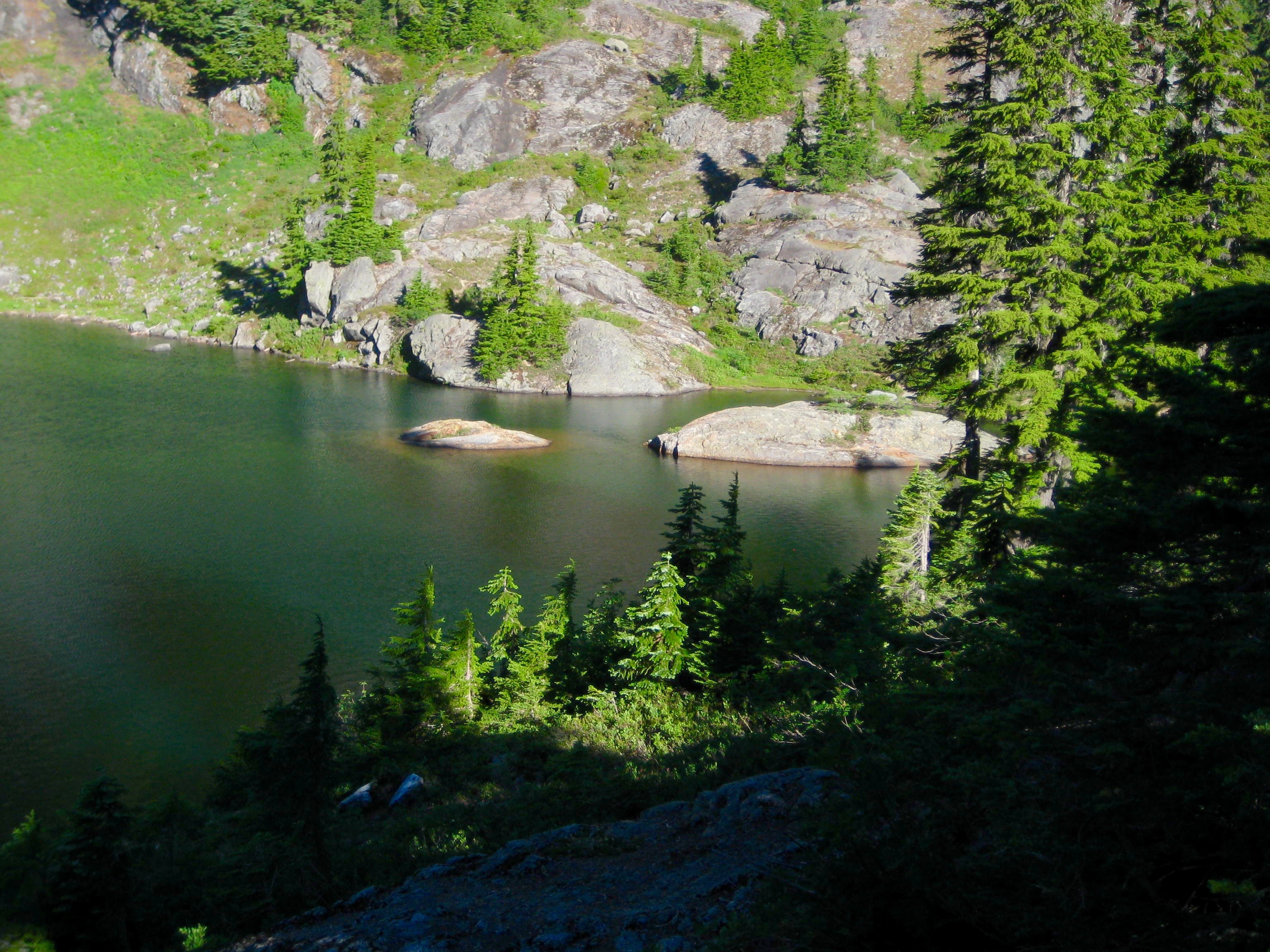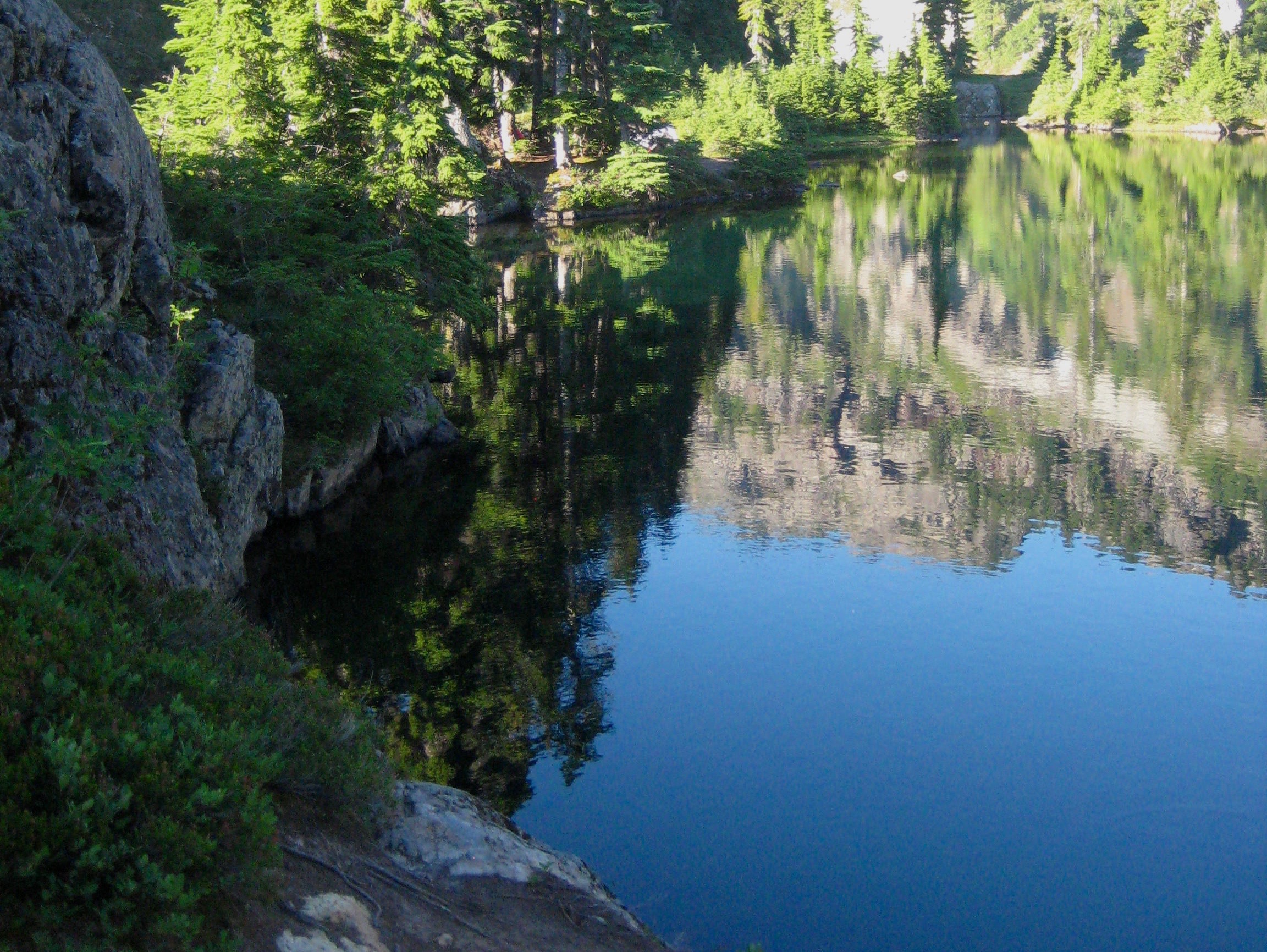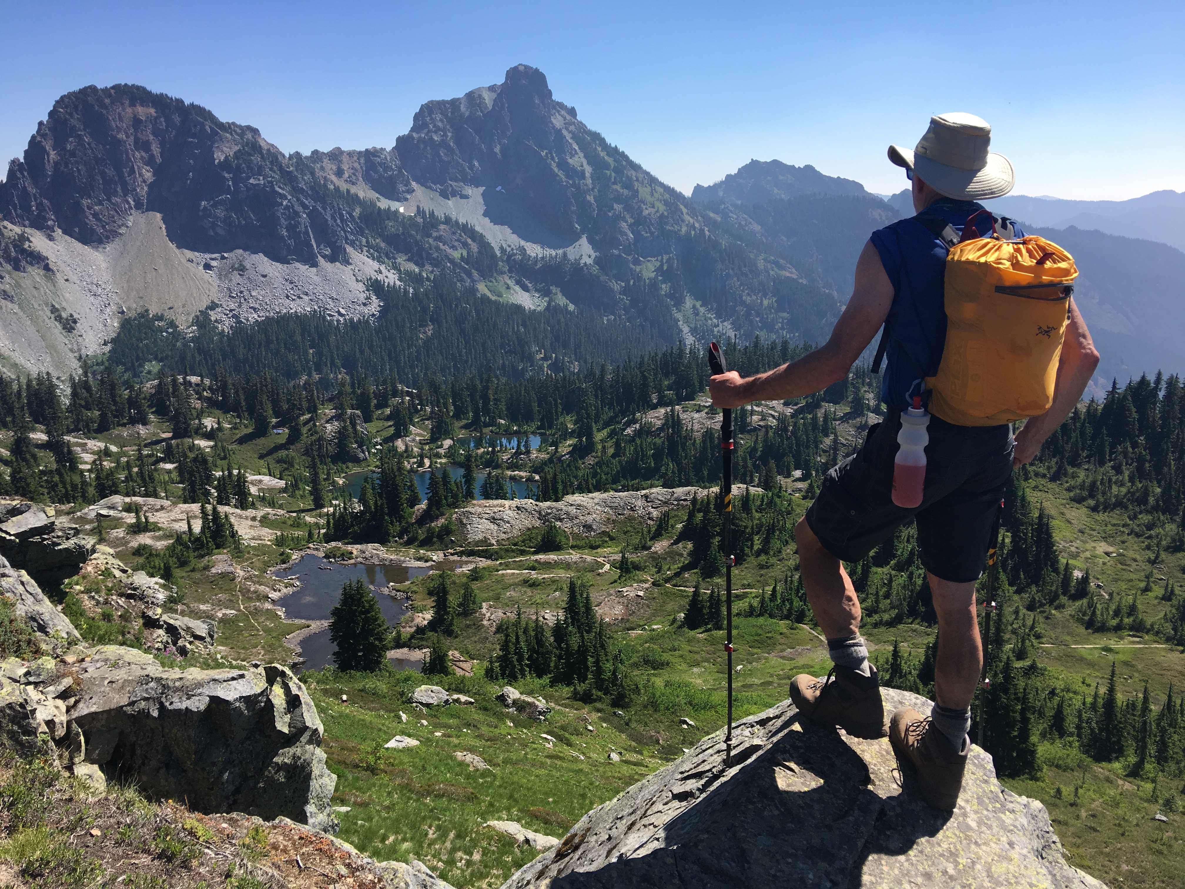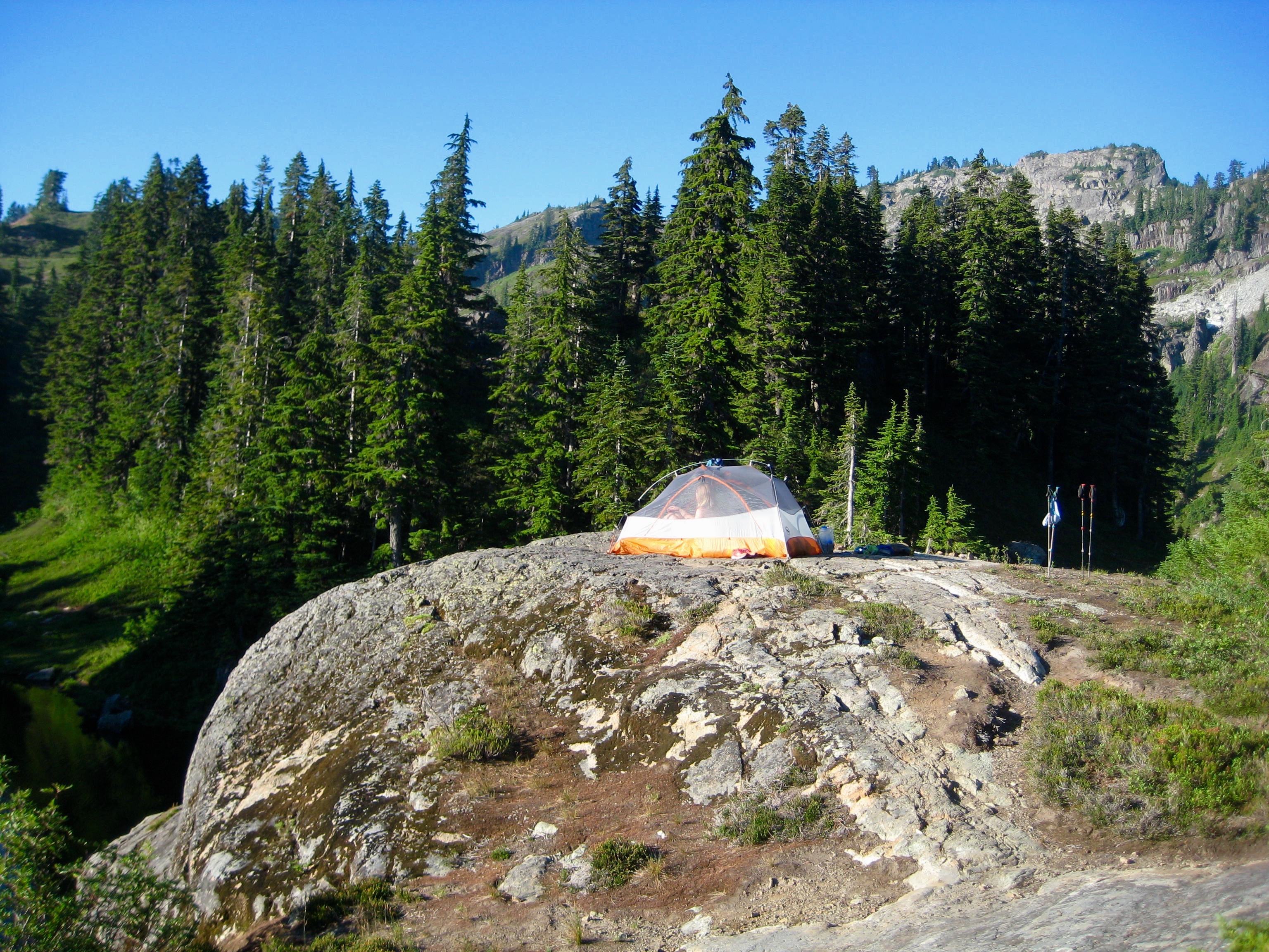 On Monday, we started hiking around noon. Jim had frozen a plastic container so I had an ice pack at our first break after almost 2 hours of hiking. After that, all breaks included a creek crossing where I could soak. We arrived Rampart Lakes before 6pm. On a weekend, this place would be crowded. But since we were mid-week, we shared the area with only one other tent. Jim found us a fabulous camp on top of a rock overlooking three of the four lakes.