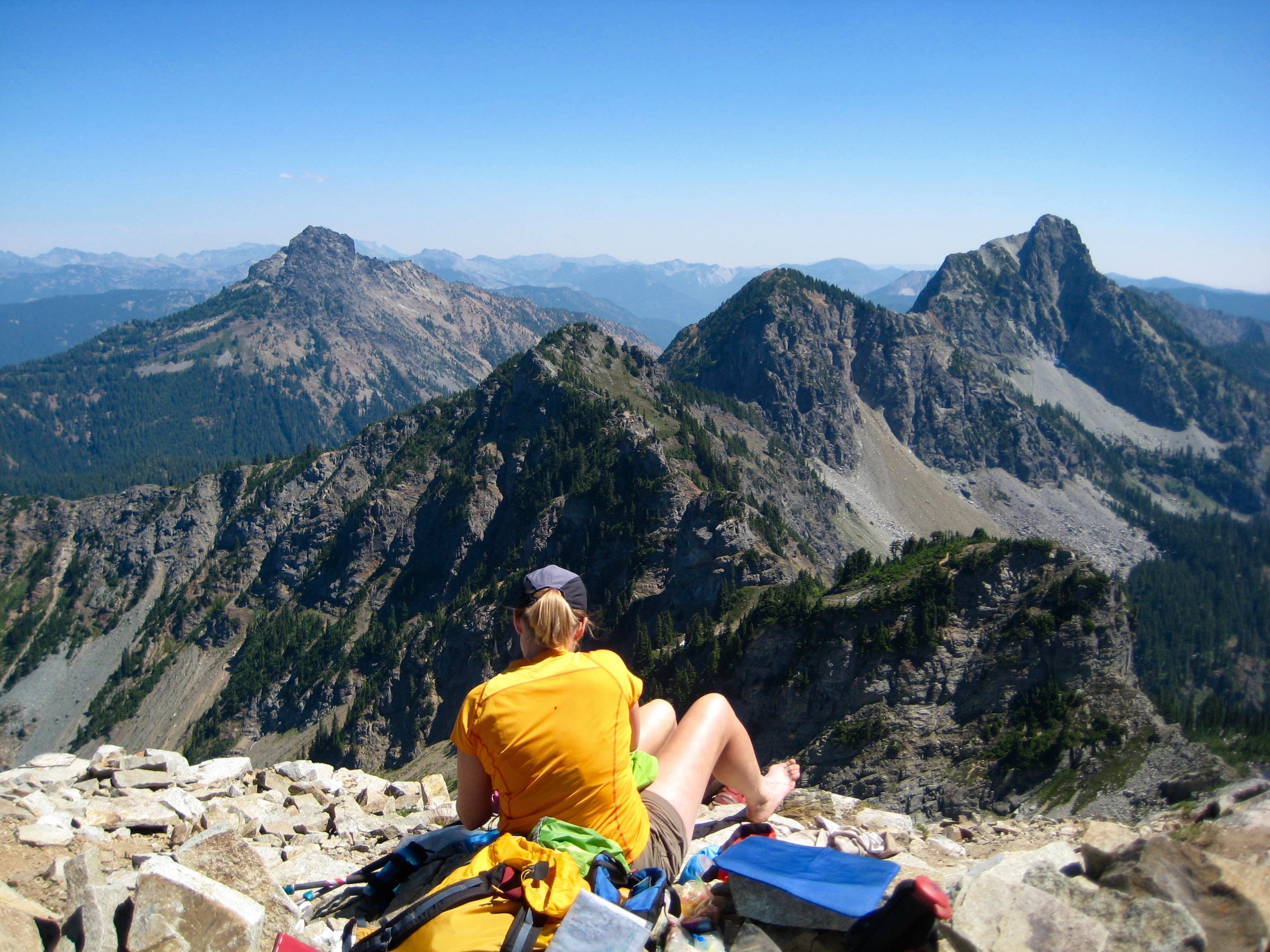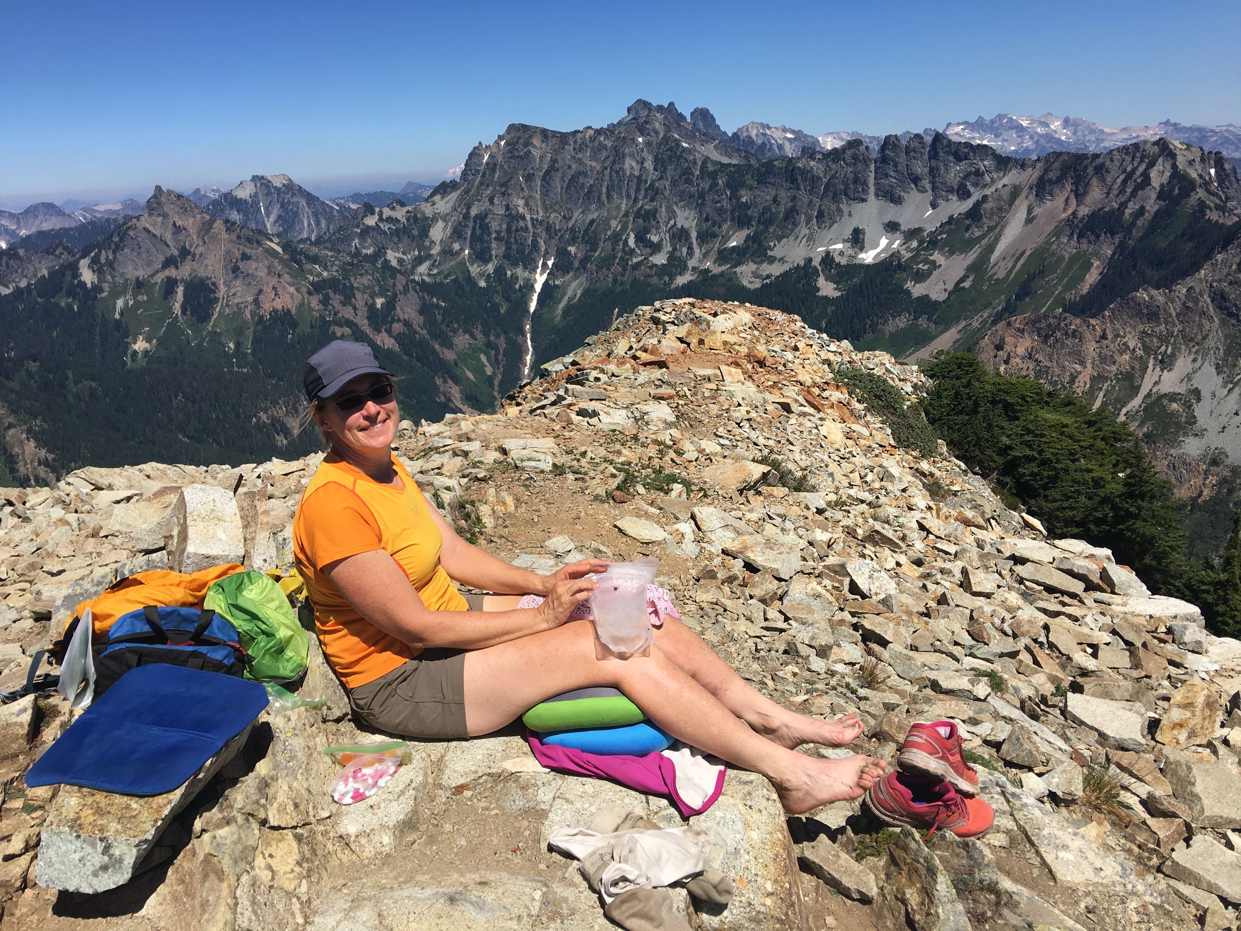Our evening was filled with appetizers, mountain margaritas, and mosquitoes. We woke at 7:30 am when the sun hit our tent with full force and baked us out within minutes. My knees felt pretty good so we headed out from Alta Mountain. There was a trail to the top but we forgot how bad the trail was. This turned out to be a great test of my abilities.