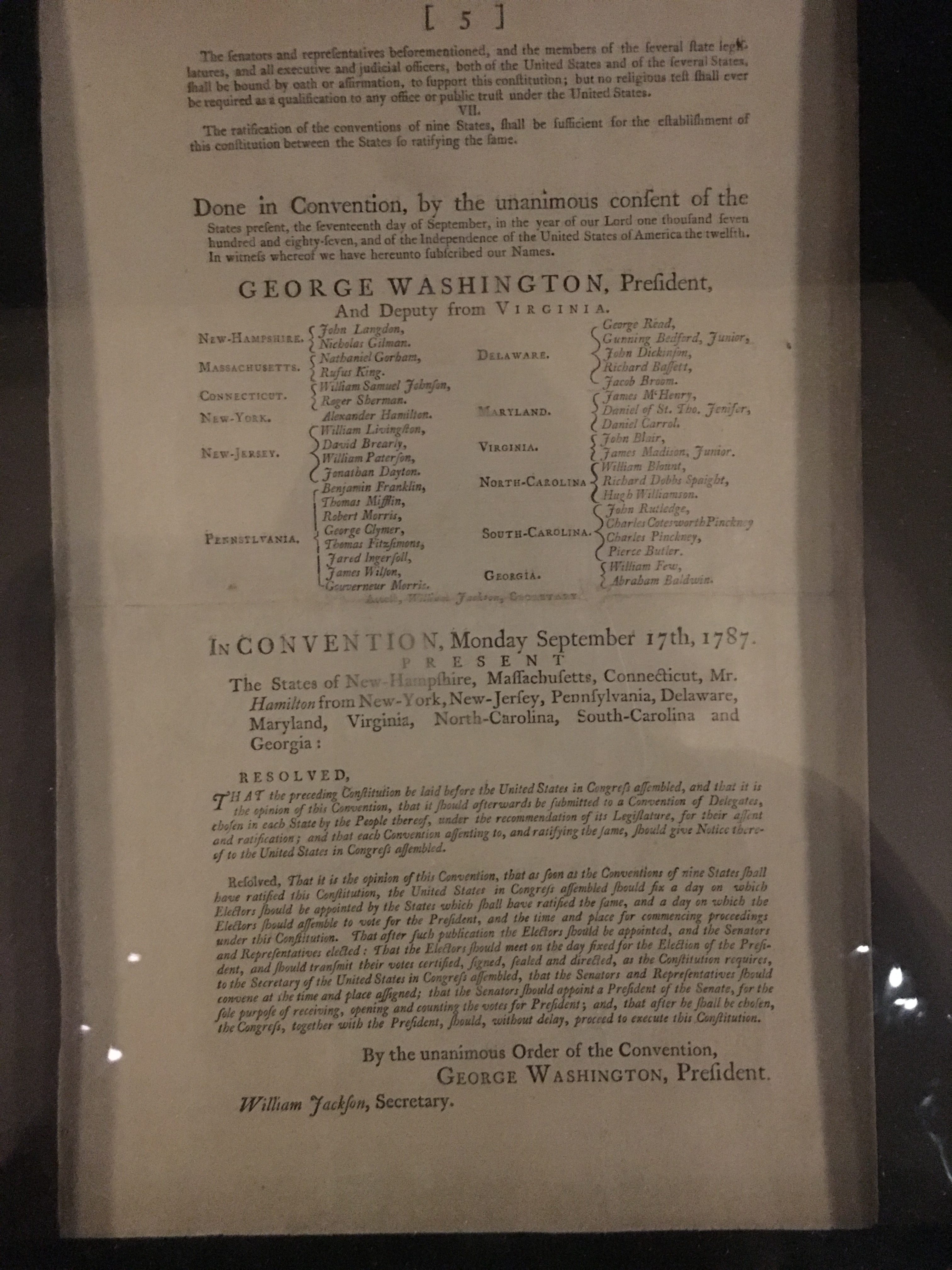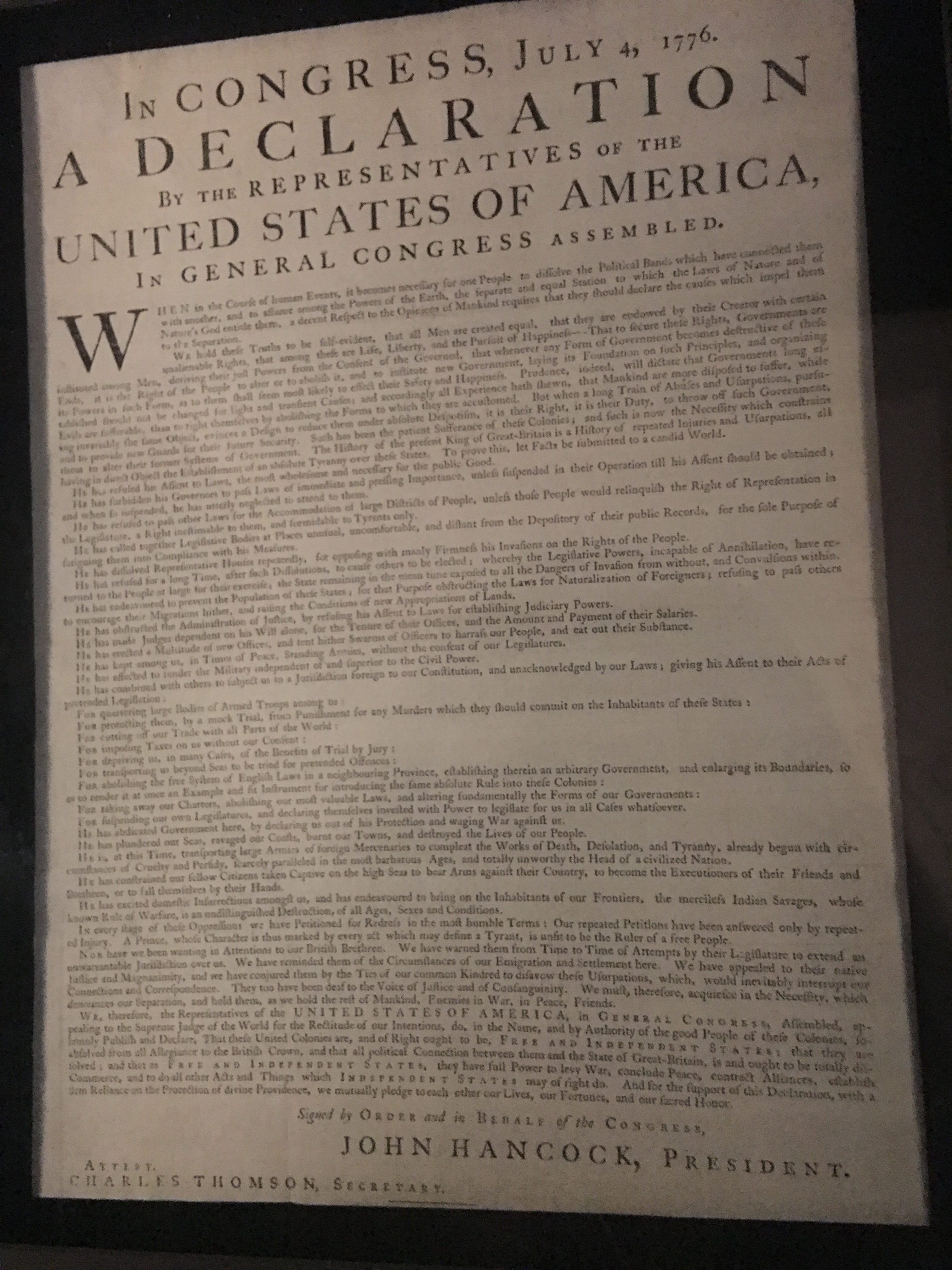 The exhibits and tour guides stressed that no one got it exactly the way they wanted it. Even in the earliest of days, politicians were cutting deals. “I will vote for that if you vote for this”. Even the vote for the Declaration of Independence involved political maneuvering. The vote had to be unanimous. New York was a “NO” vote so they were encouraged behind the scenes to be a no show and another state abstained. The country was divided between people who wanted revolution, those that wanted to make peace with the King, and those that just wanted to be left alone… sound familiar?