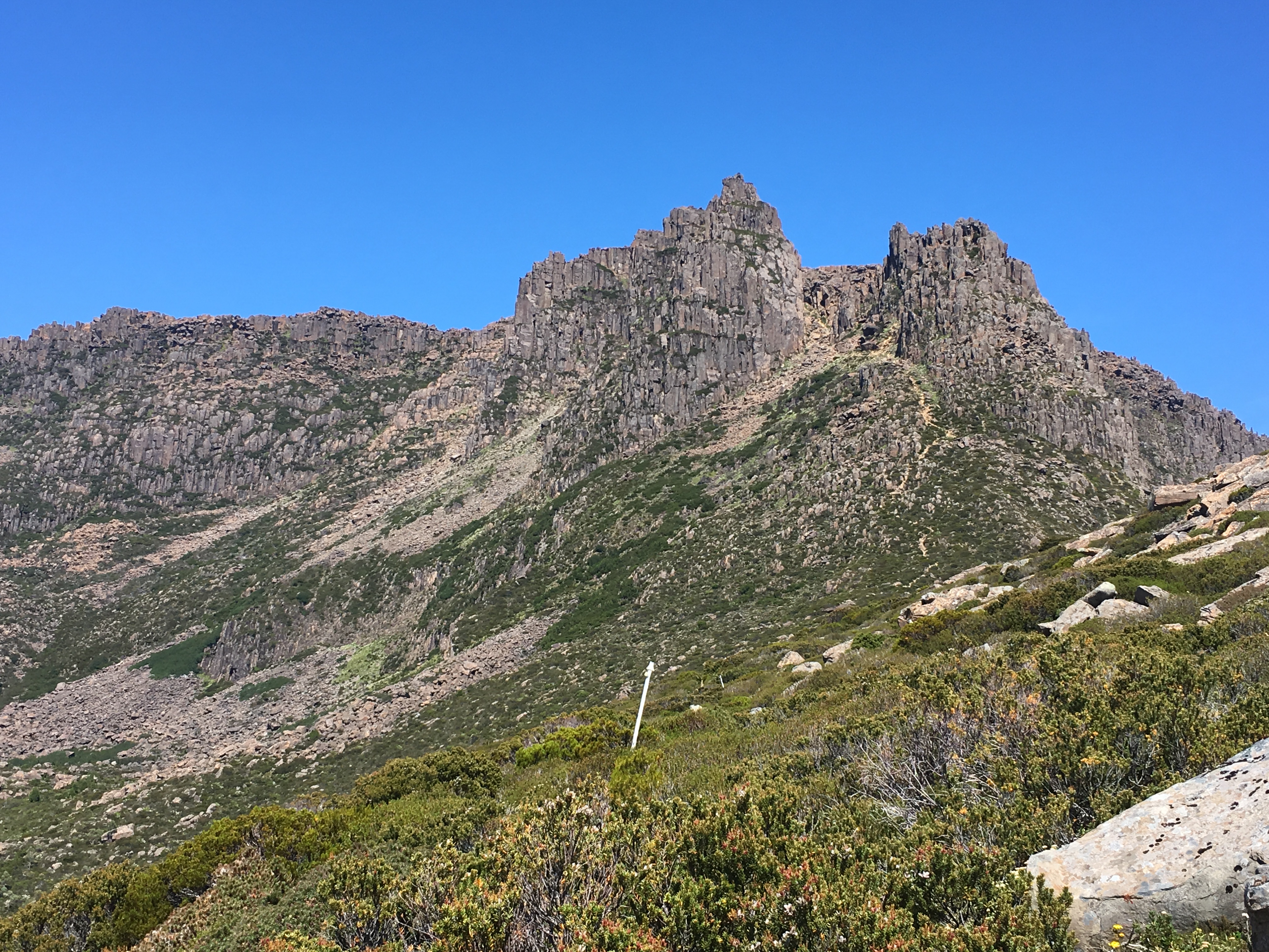 At the gap, Jim and I dropped our backpacks, loaded our summit packs, and head off to climb Mt Ossa, the tallest peak in Tasmania.