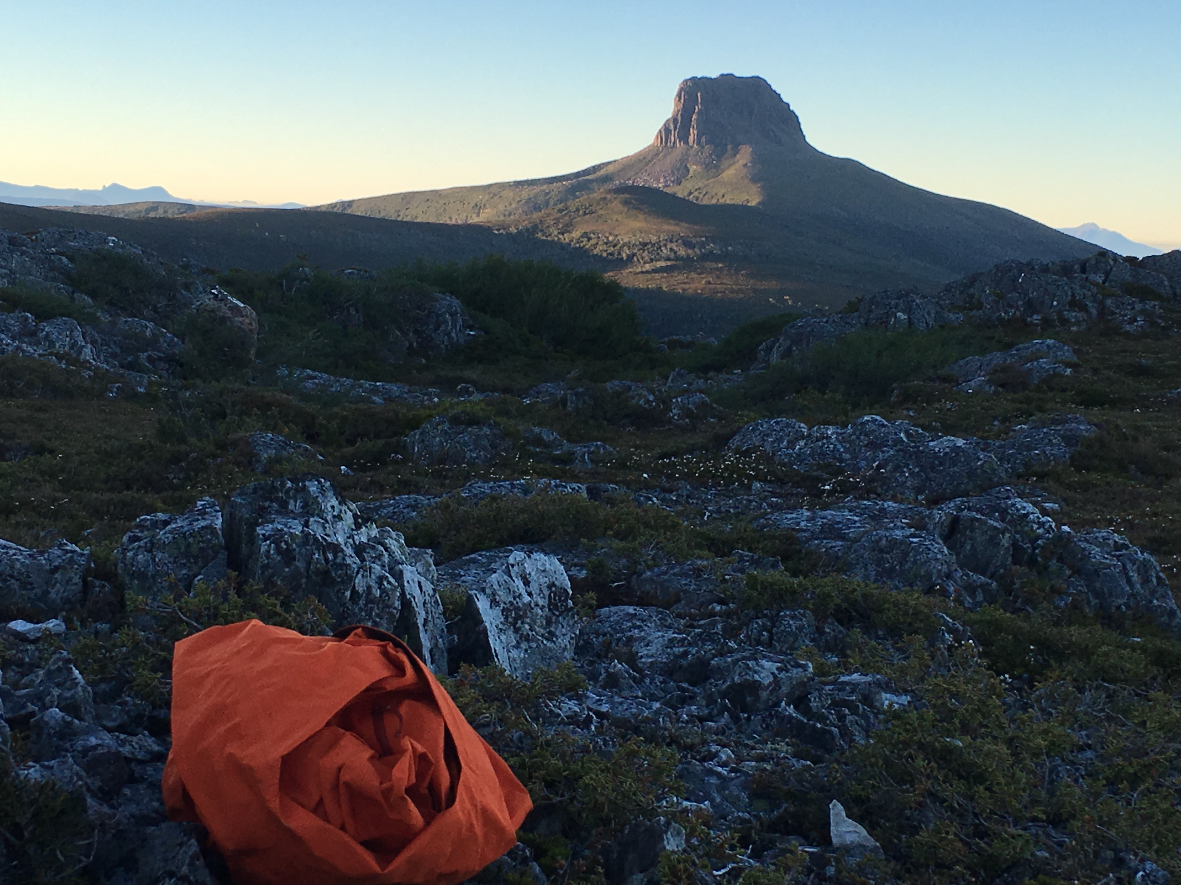 We decided our best course was to camp immediately so Brooke could get off her foot. We wouldn’t know how bad the ankle was until morning. There just happened to be a couple of tarns at the base of the mountain. Jim and I scooted around until we found suitable camping. Not easy in the Tasmania tundra.