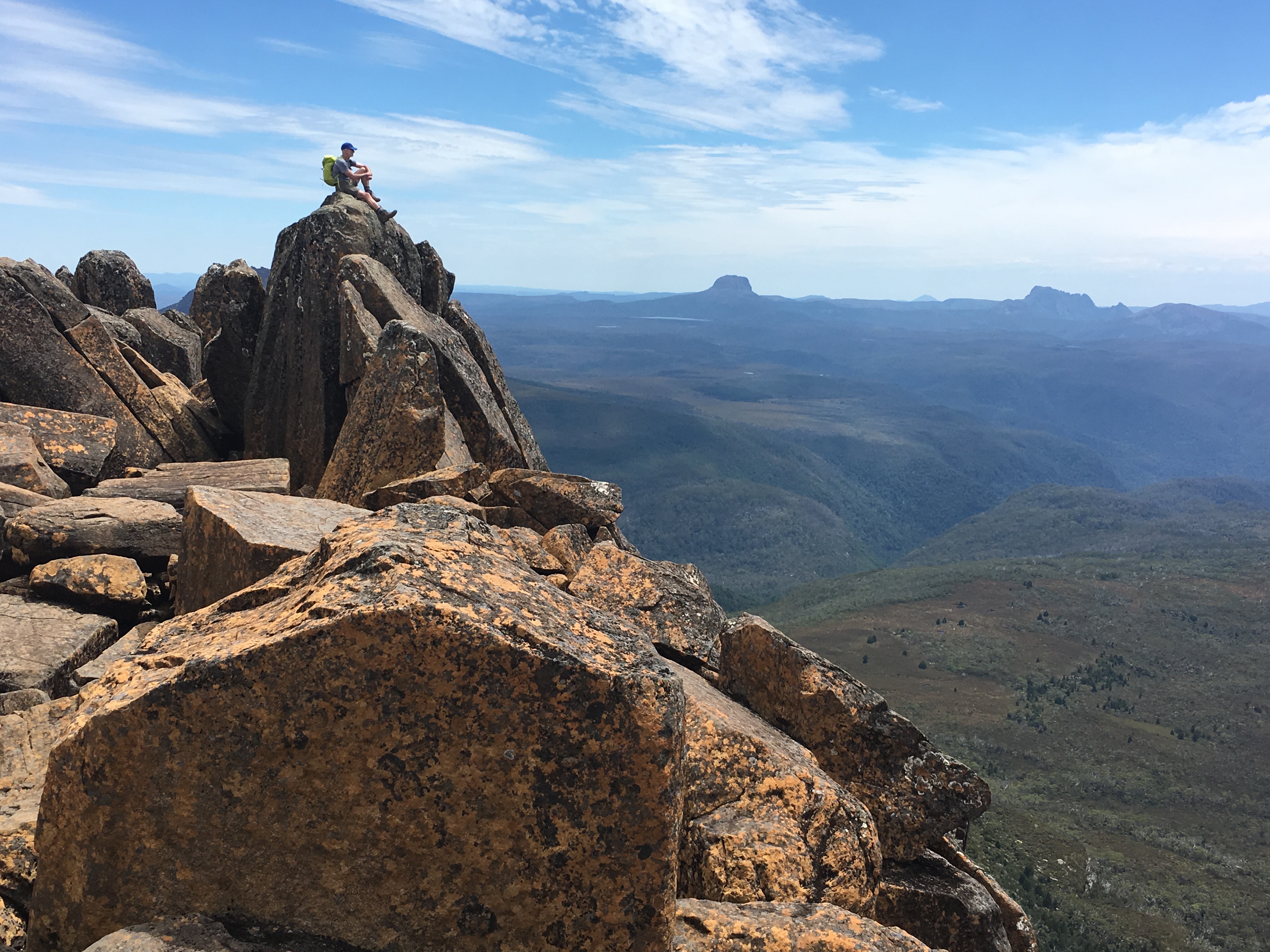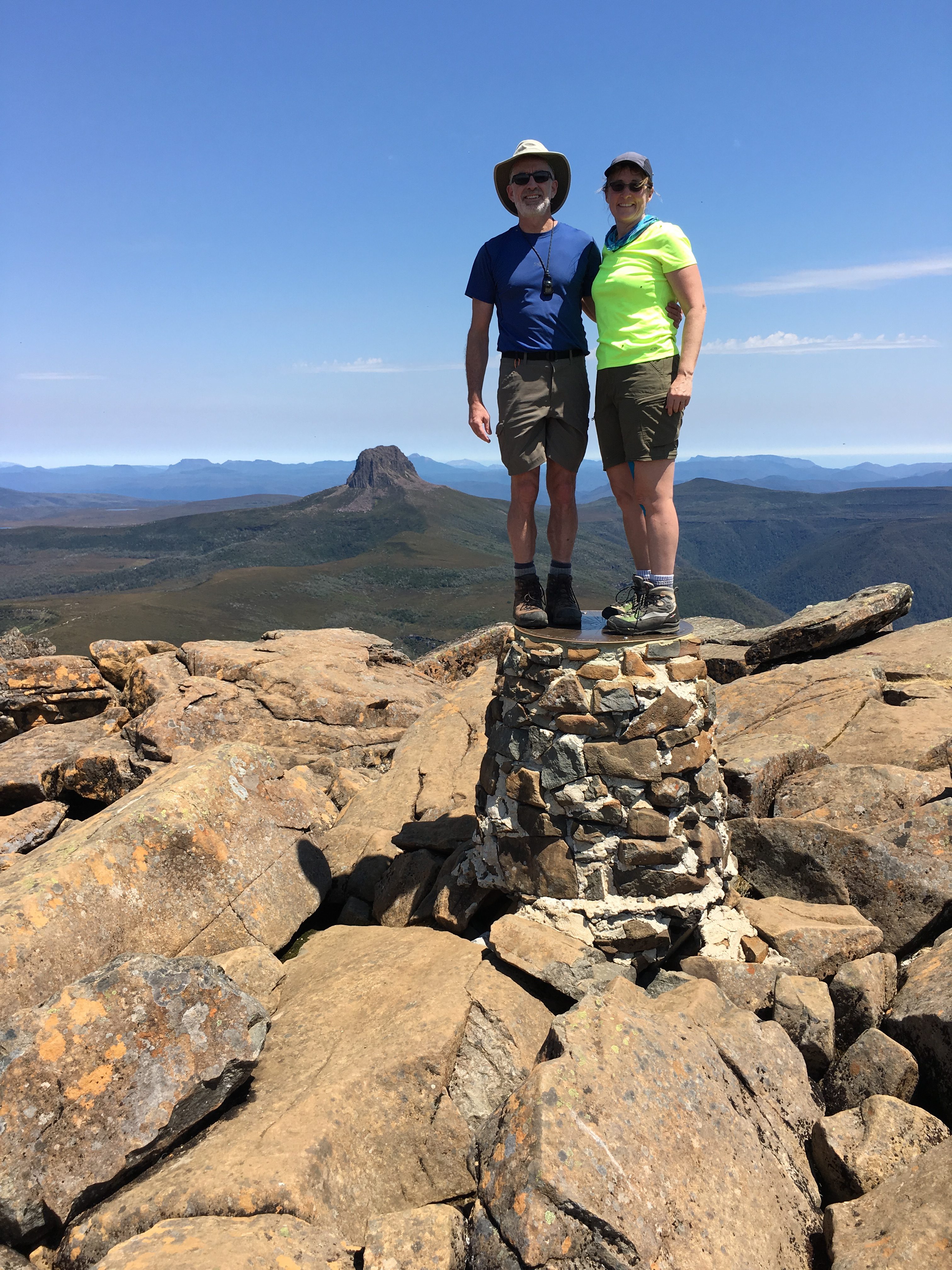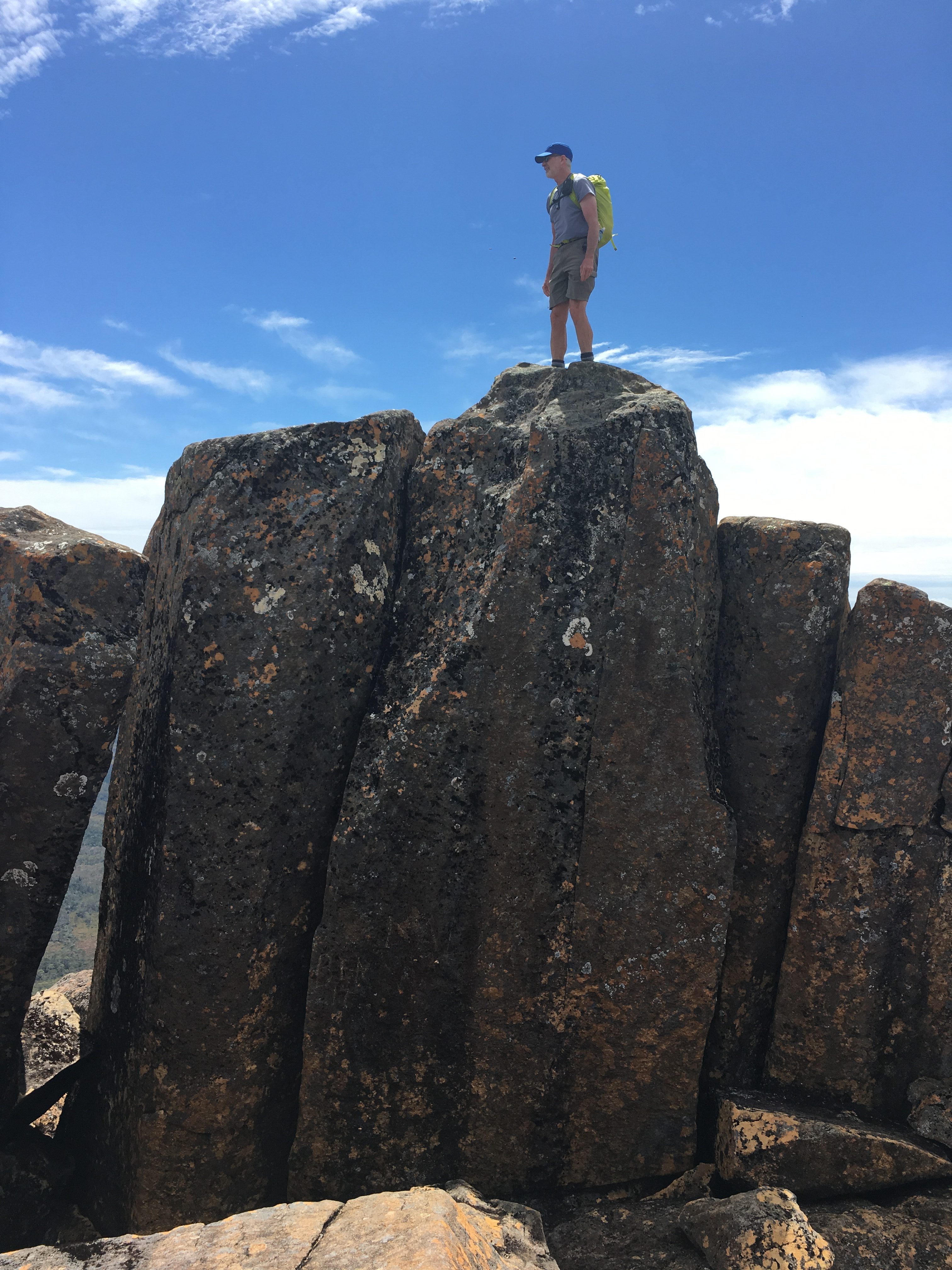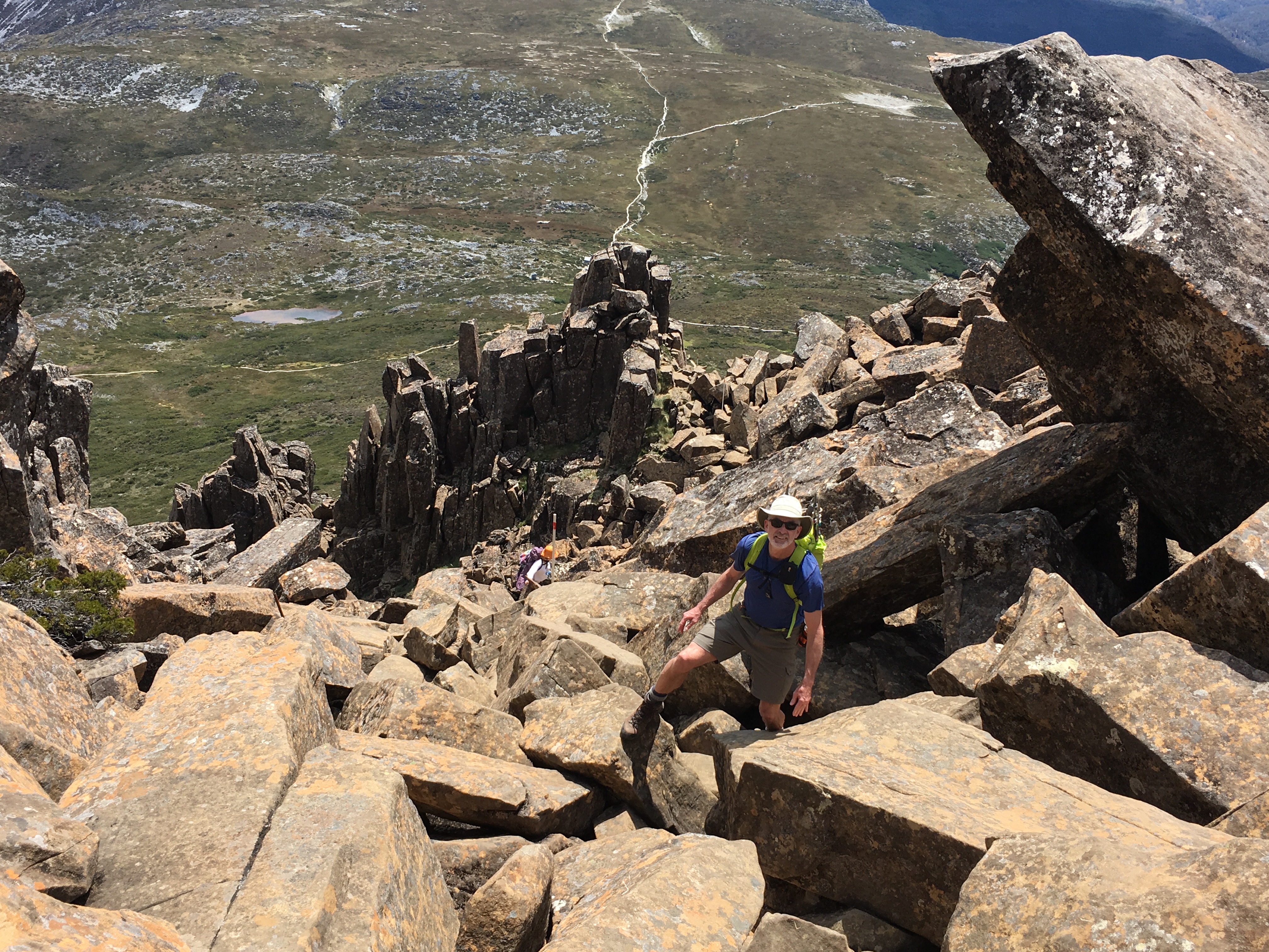 The climb of Barns Bluff was mostly boardwalk to the base of the peak then boulder fields followed by some class 2-3 scrambling. The route was convoluted so we were glad to find lots of carins including a few key arrows etched in the rock. Without all the route help, Jim and I could have turned this climb into an epic.