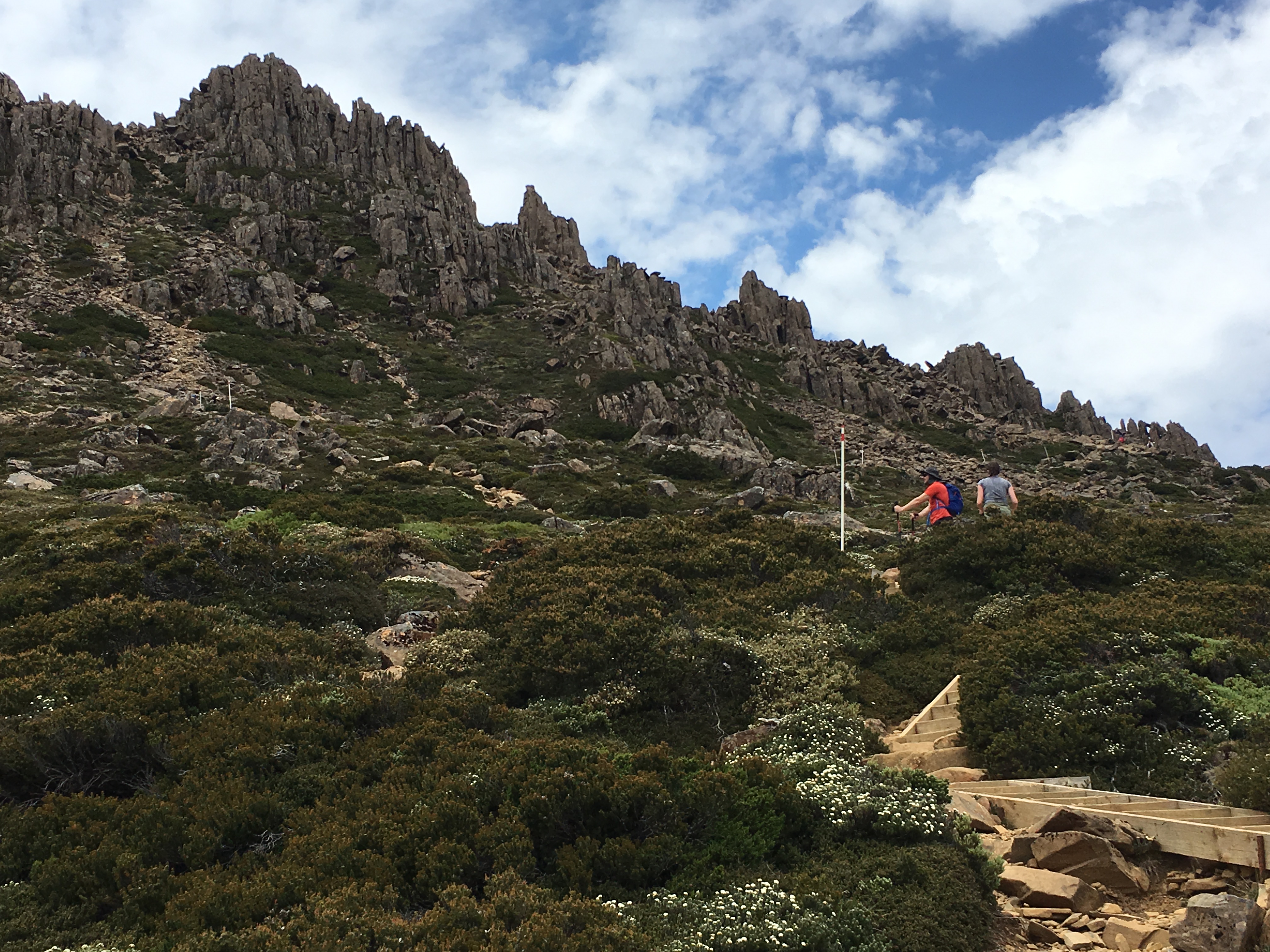 Within a half hour, the rain had stopped, the sun was out, and we had reached our first side trip. Our goal was to climb Cradle Mountain. This was also the goal for a hundred other people on day trips from the Visitor Center.