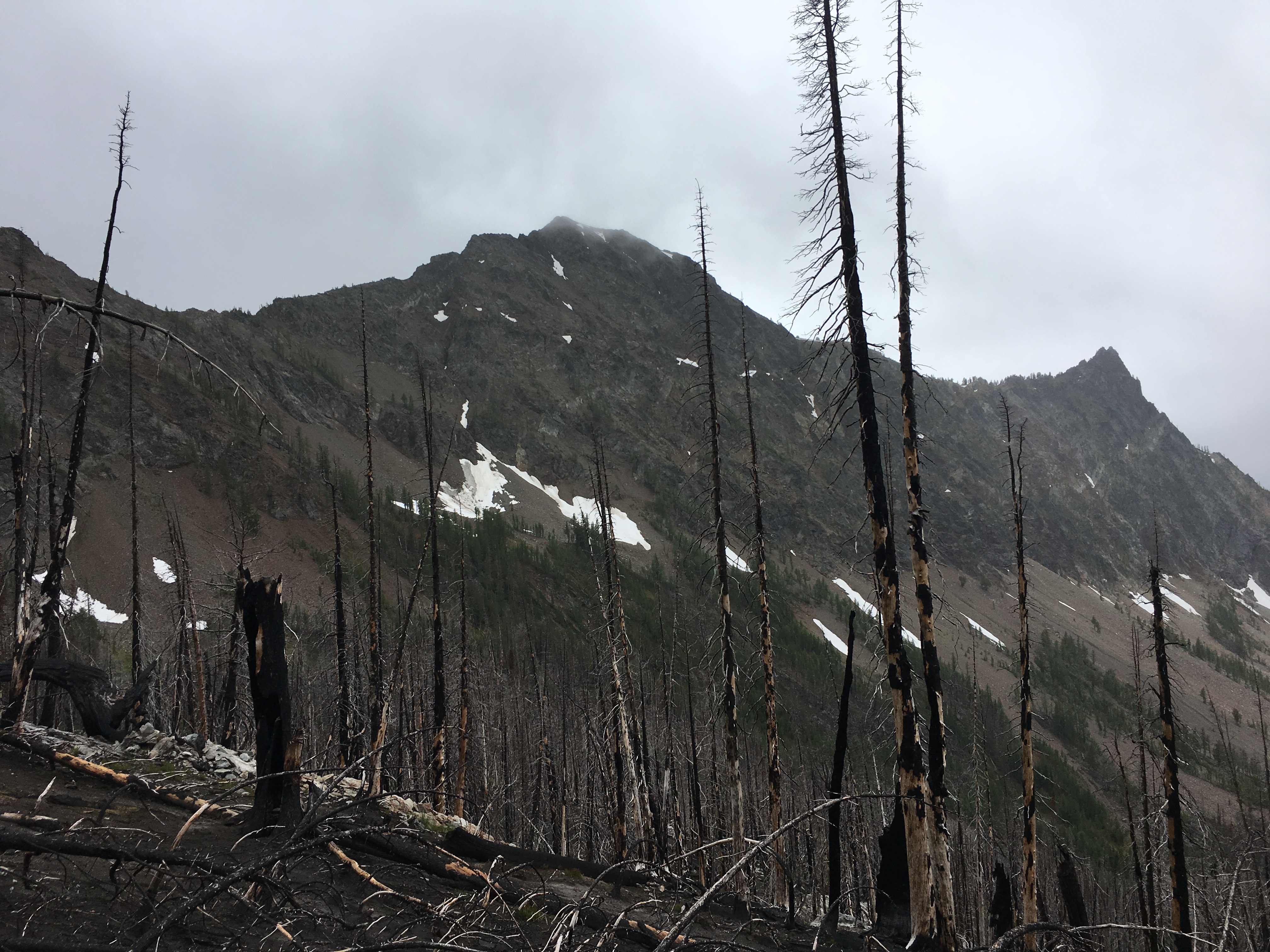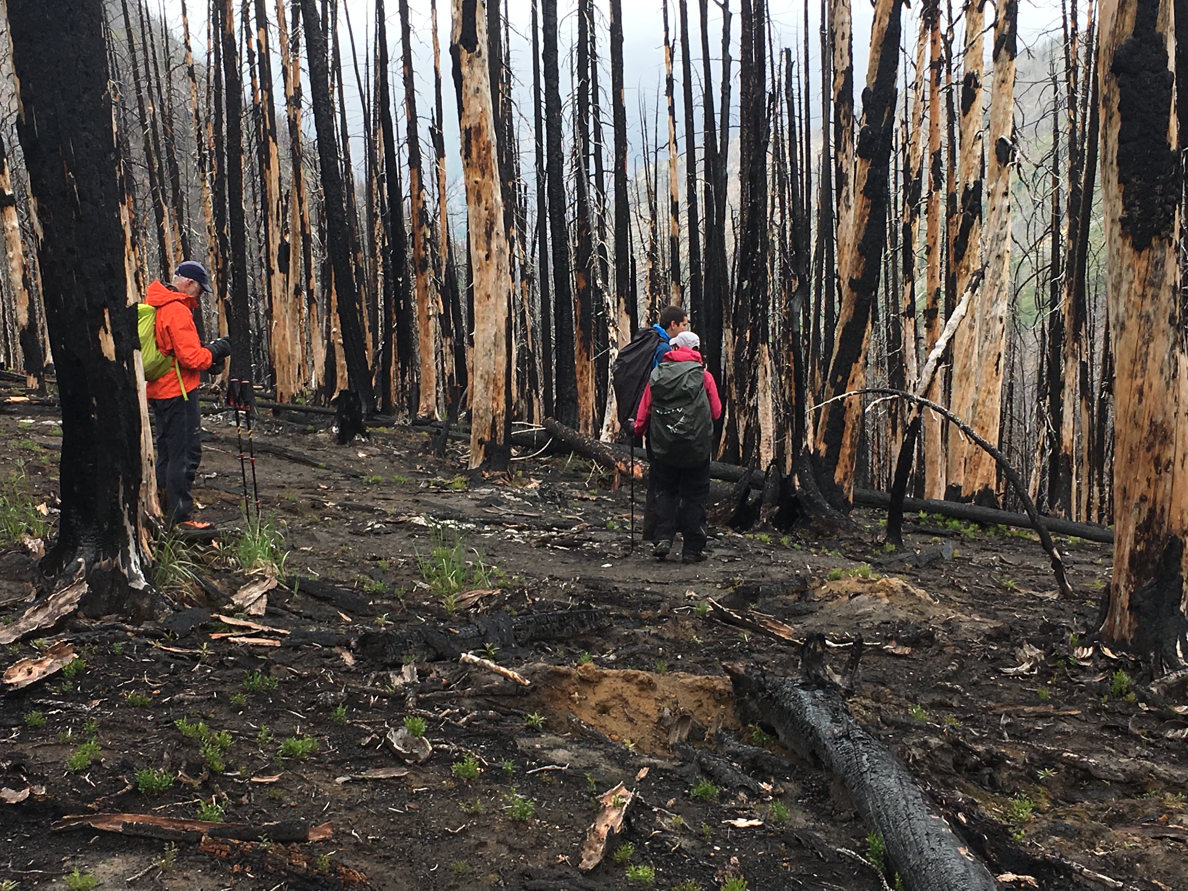 After a hour, our hiking group had dwindled down to Lisa, Eric, Jim, and I. We decided to try and follow the trail to Emerald Park. This would mean hiking through the burned forest from the Wolverine Fire in 2015. It was shocking how some parts of the trail are still ash. The fire must have been so hot when it came through this area.