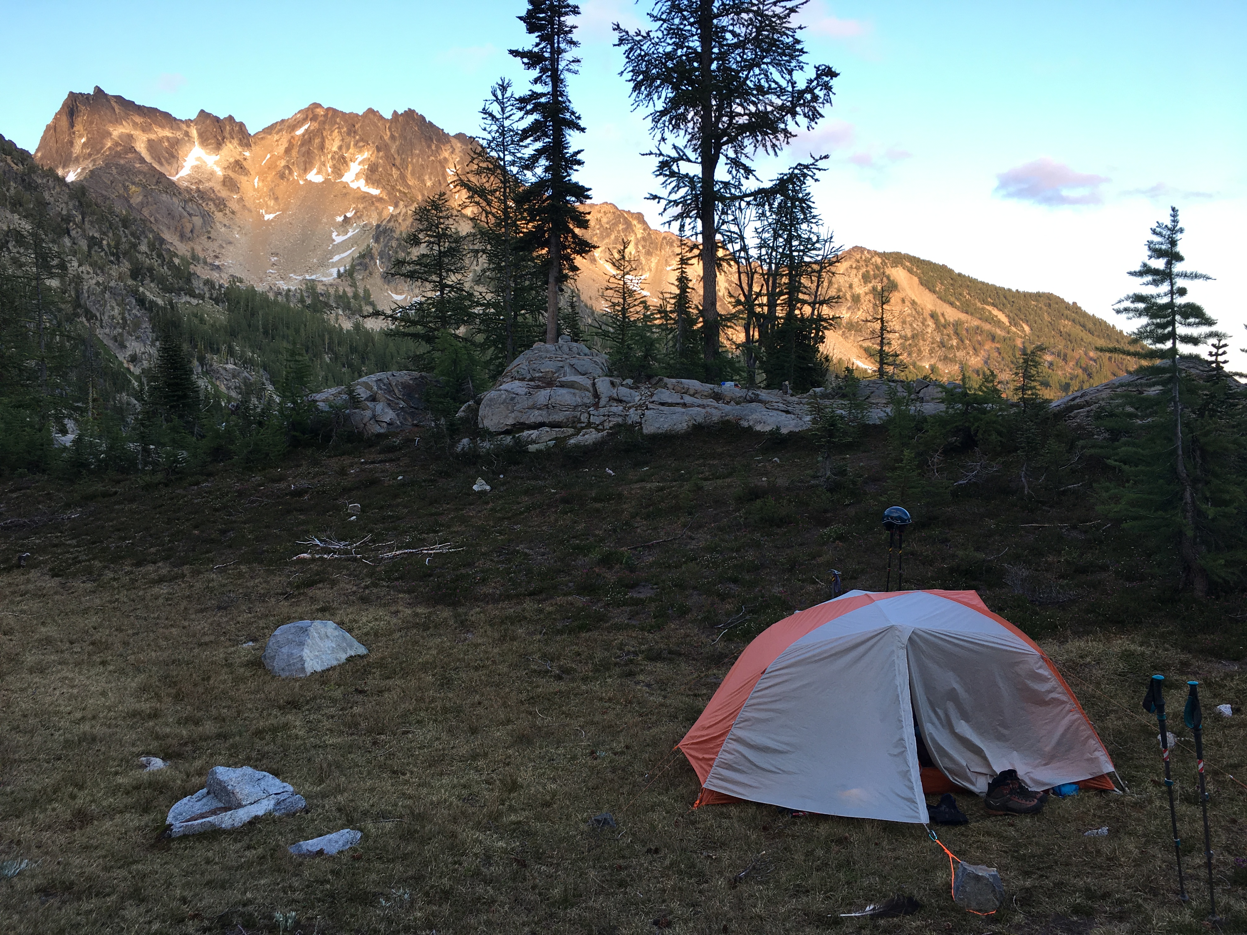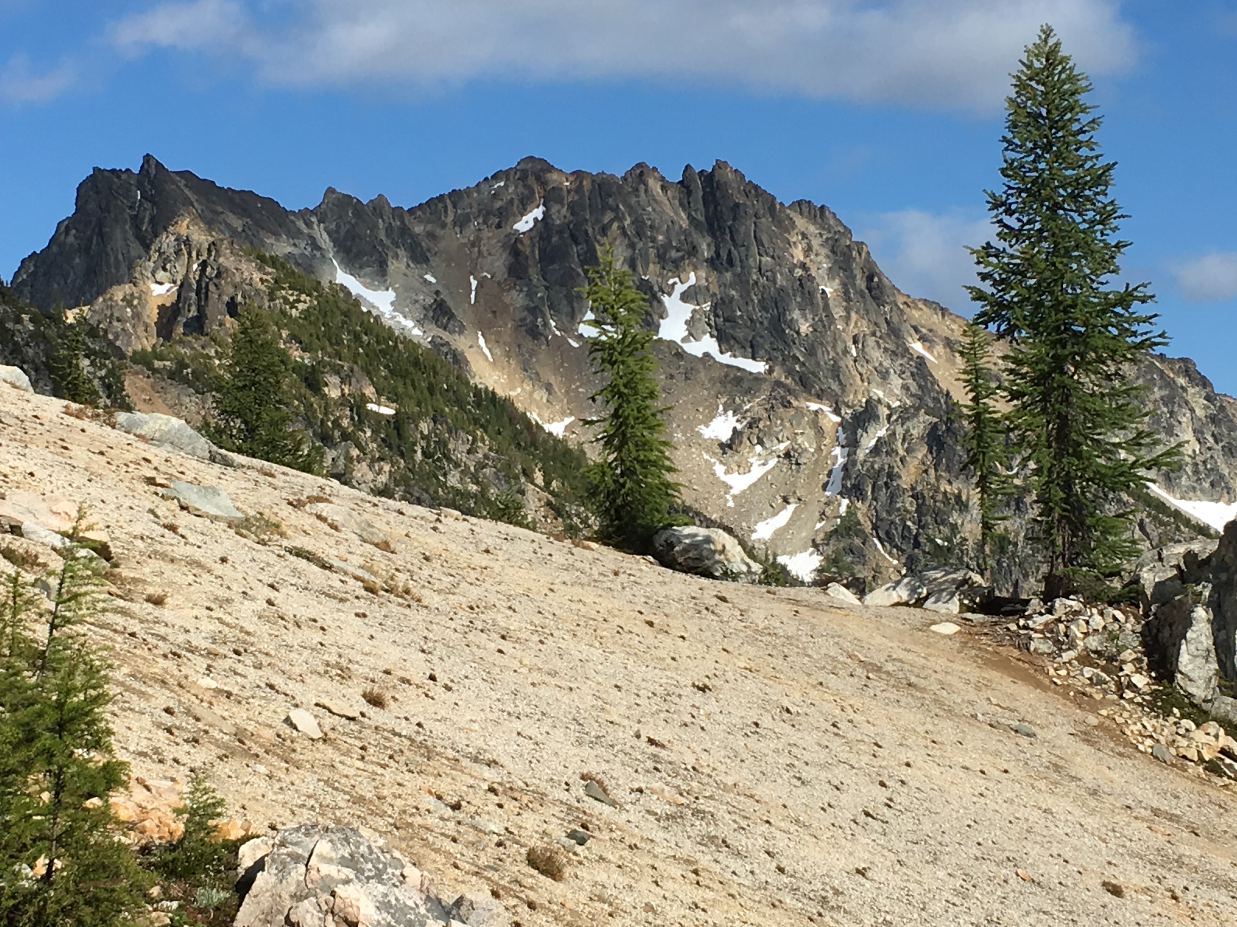 We all meet in Wenatchee for lunch on Saturday as it was centrally located: Tony, Suzie, and Eric came from Oregon, Kevin and David from Bremerton, and Lisa, Jim, and I from Bellevue. The drive to the trailhead was almost 2 hours so we headed up the trail late in the day, happy to be hiking in the sunshine.