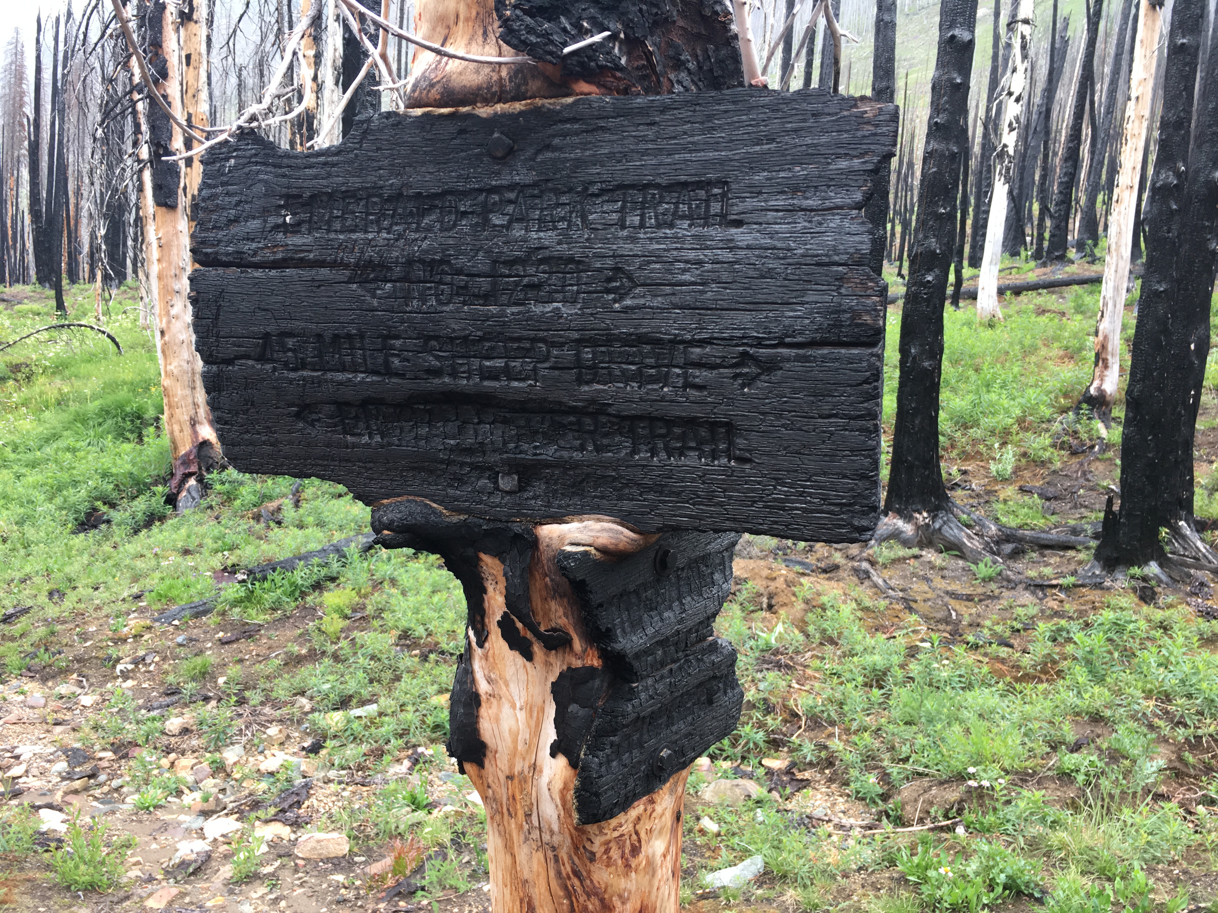 After a couple of hours, we located the trail junction to Emerald Park and the old junction sign.