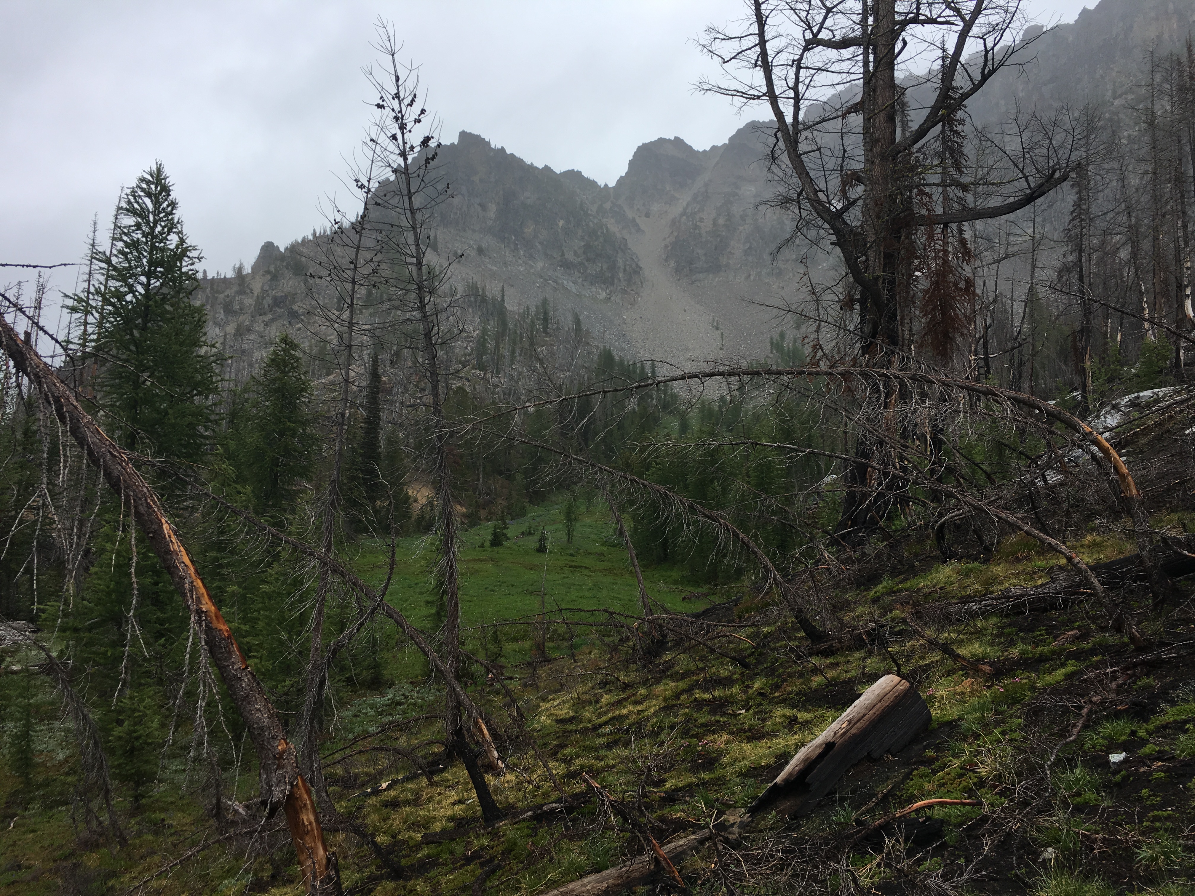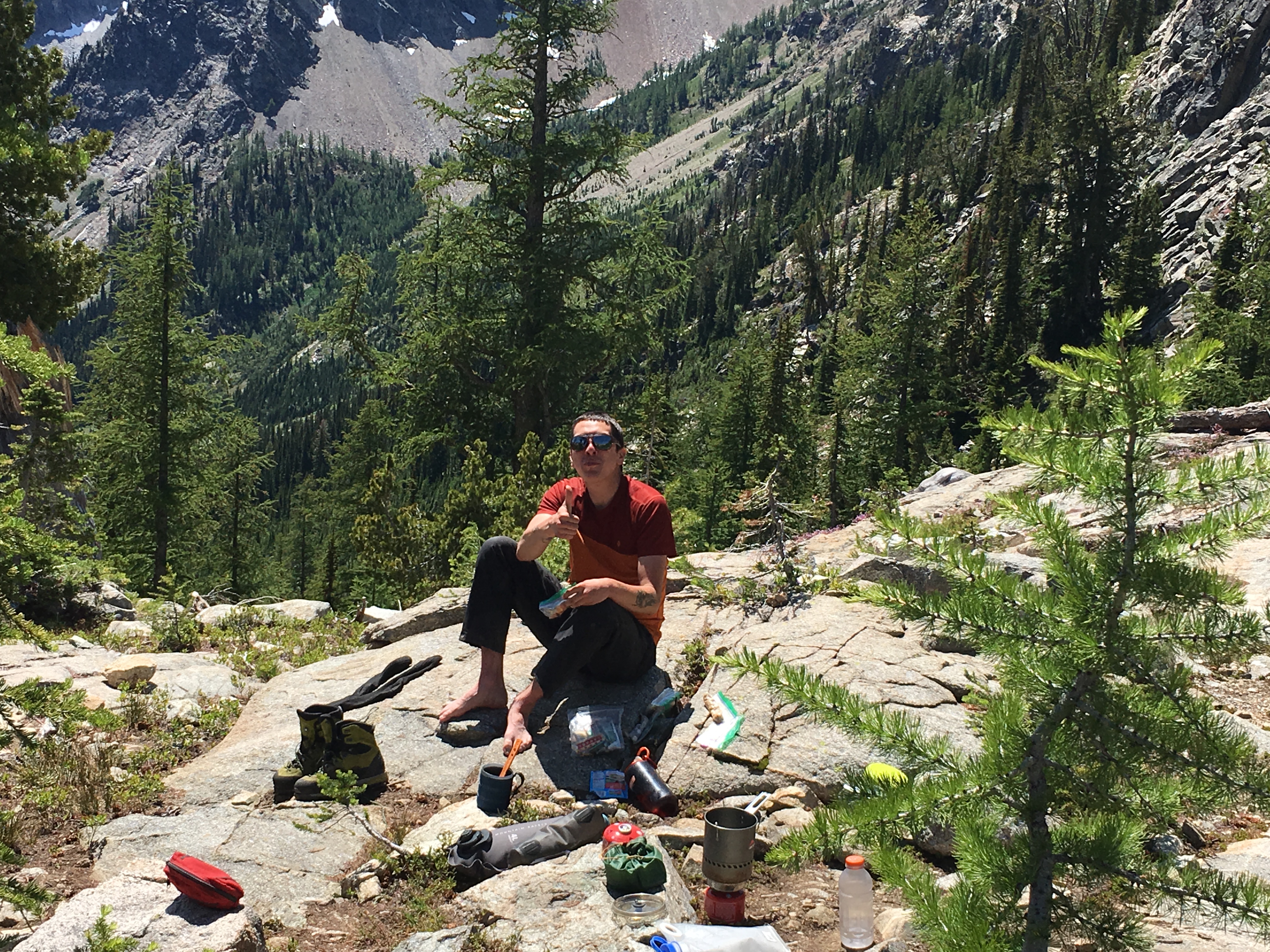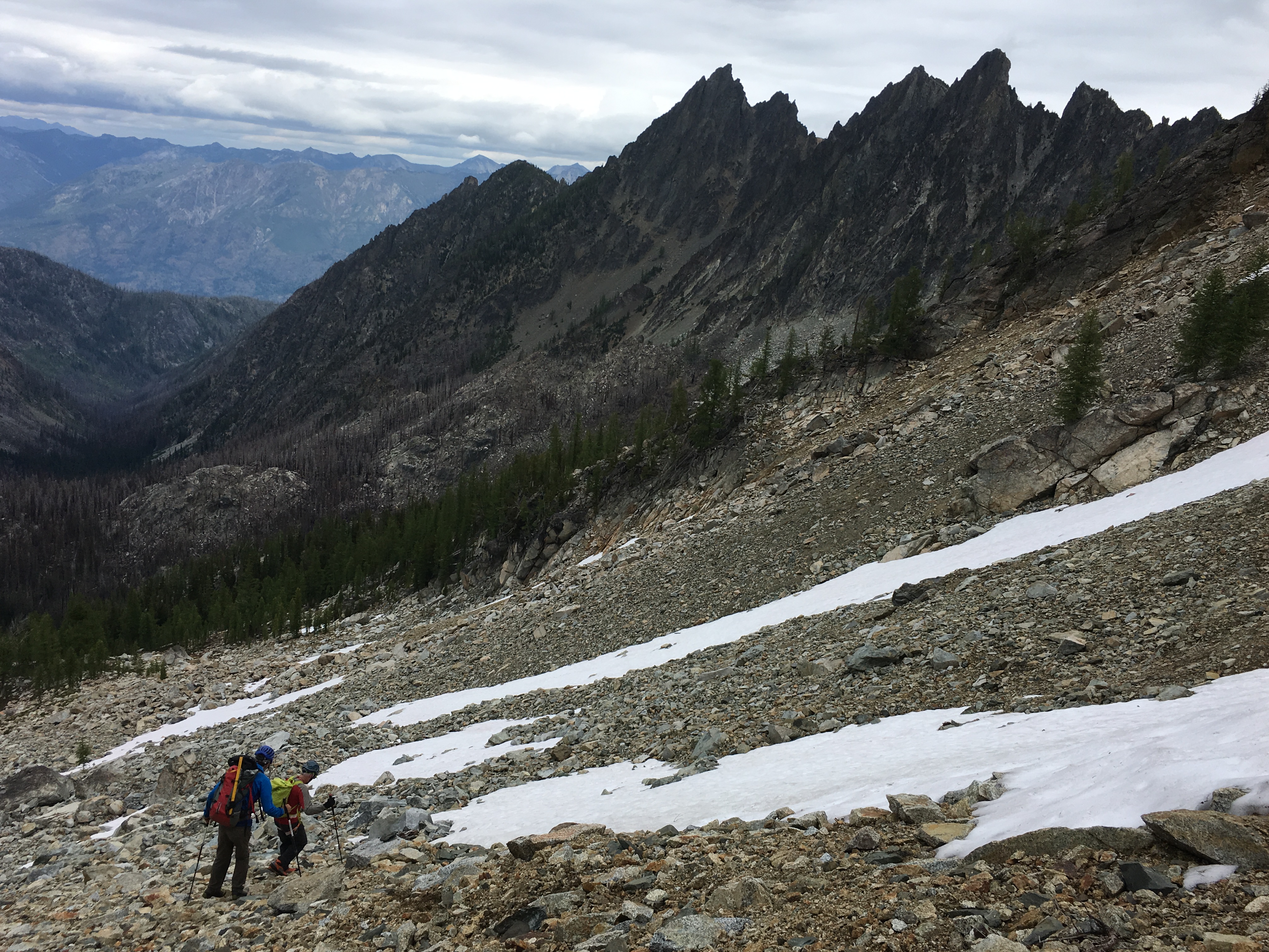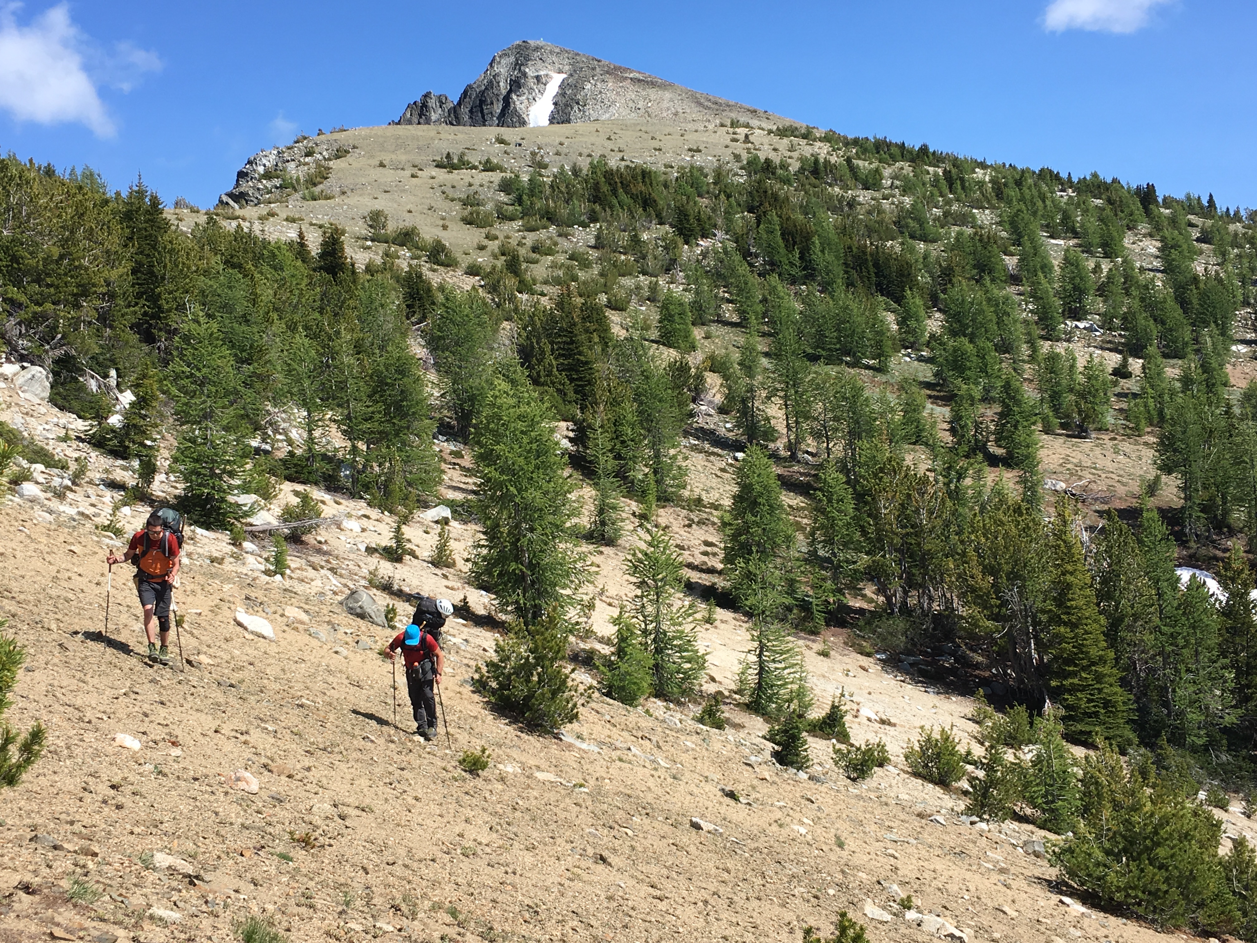 Day 2 was our big day with full packs. The plan was to hike up Pyramid Peak and then head cross-country to camp in a high basin near Grouse Pass.
