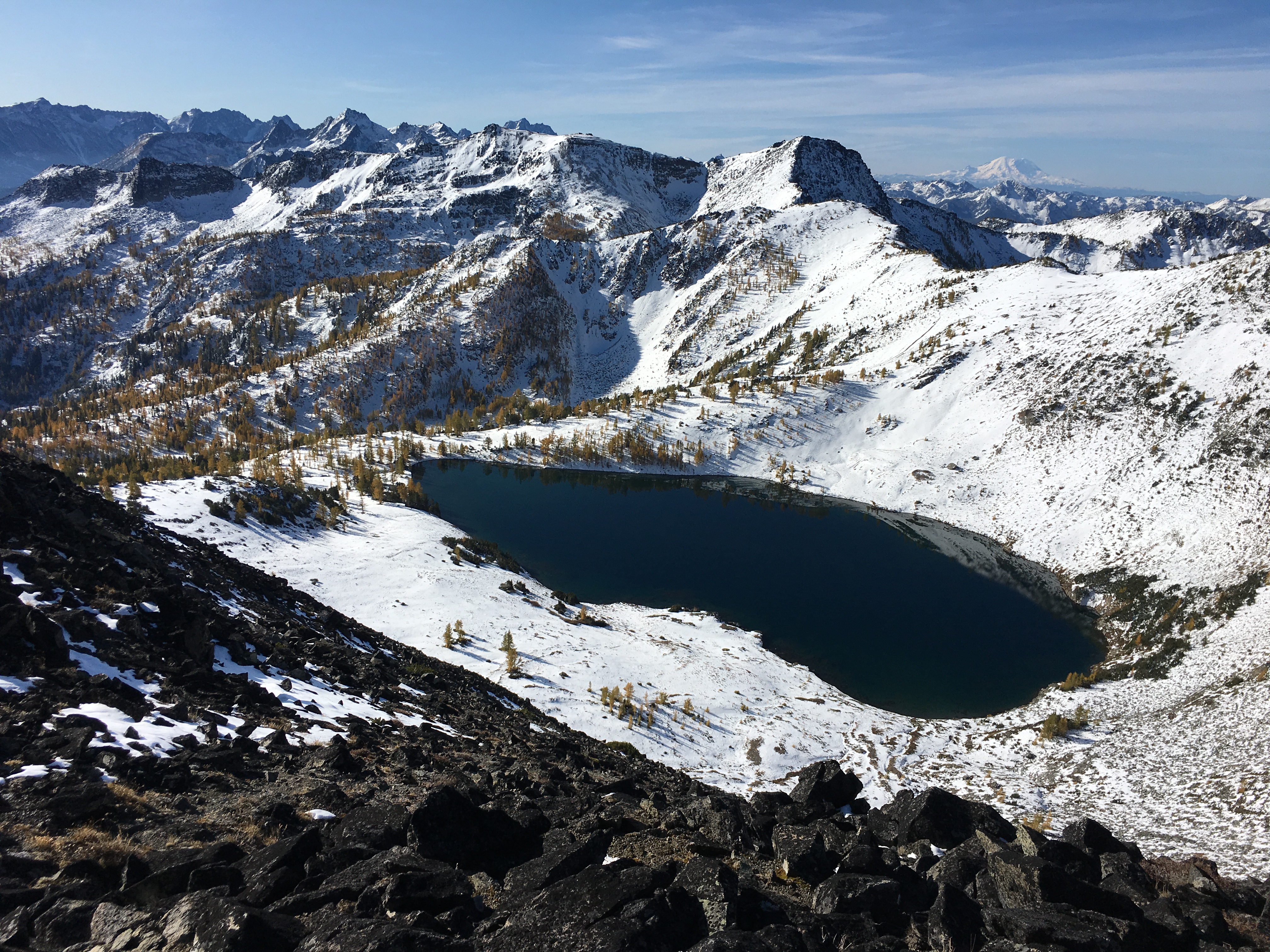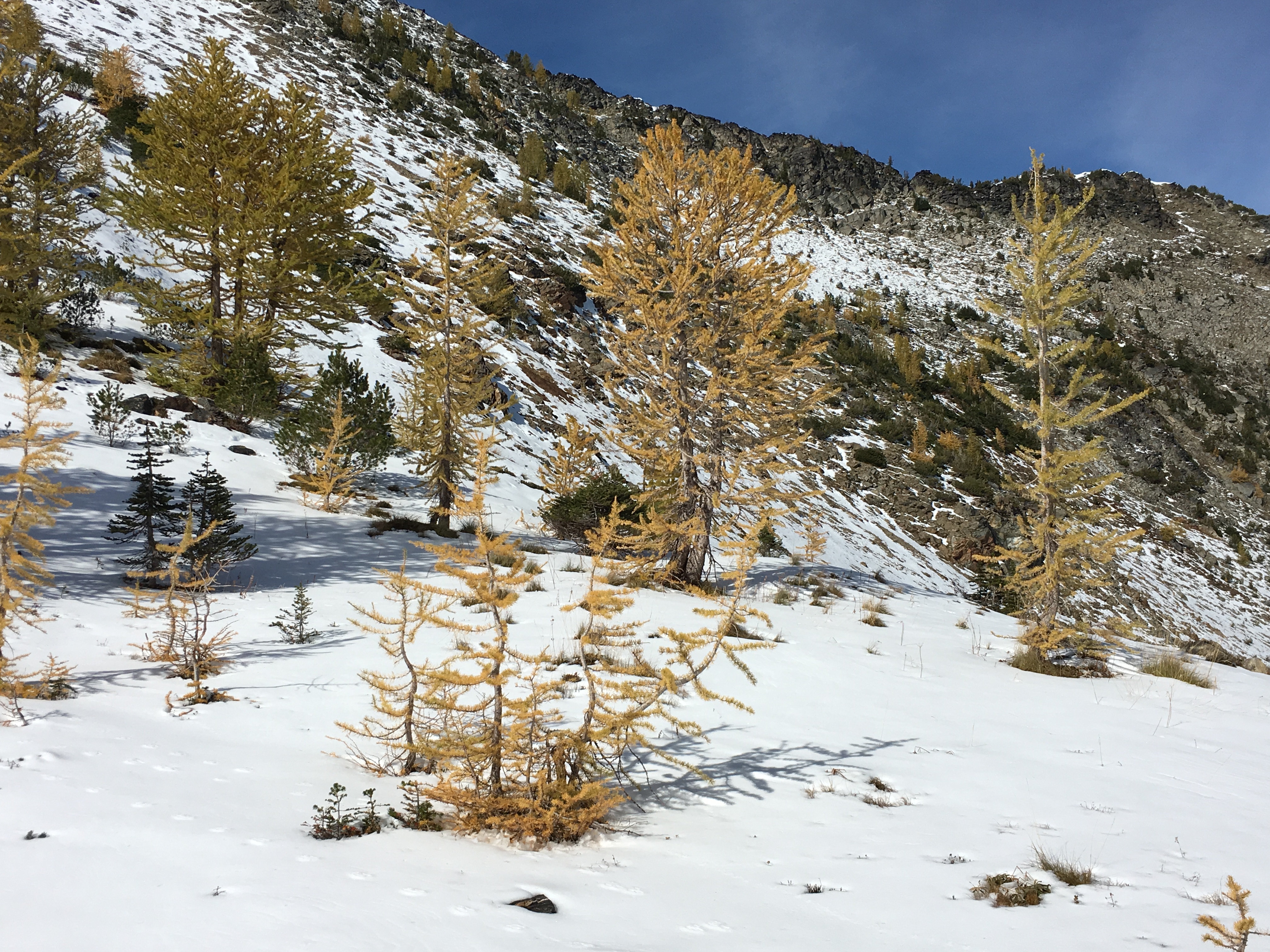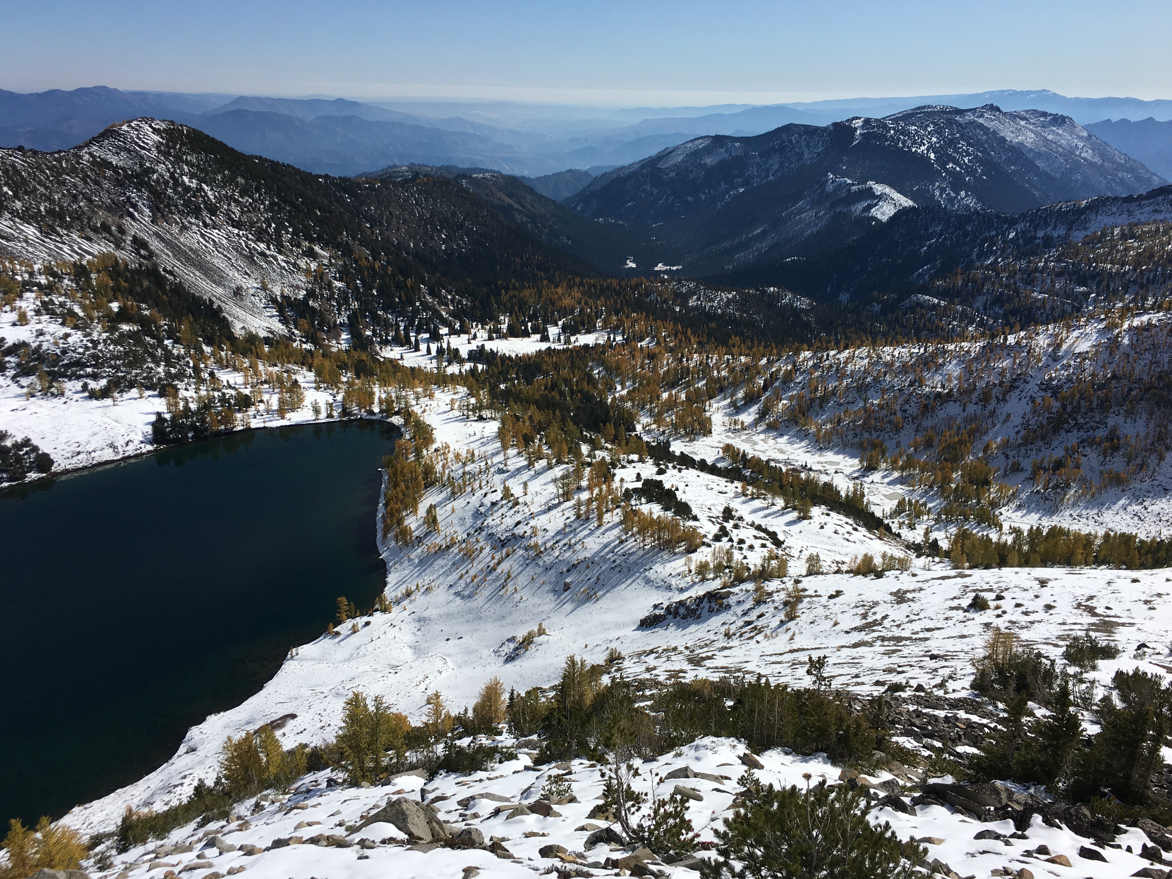 Looking down on Lake Augusta, you could see that the larch trees were not in their prime but the snow made everything so pretty.