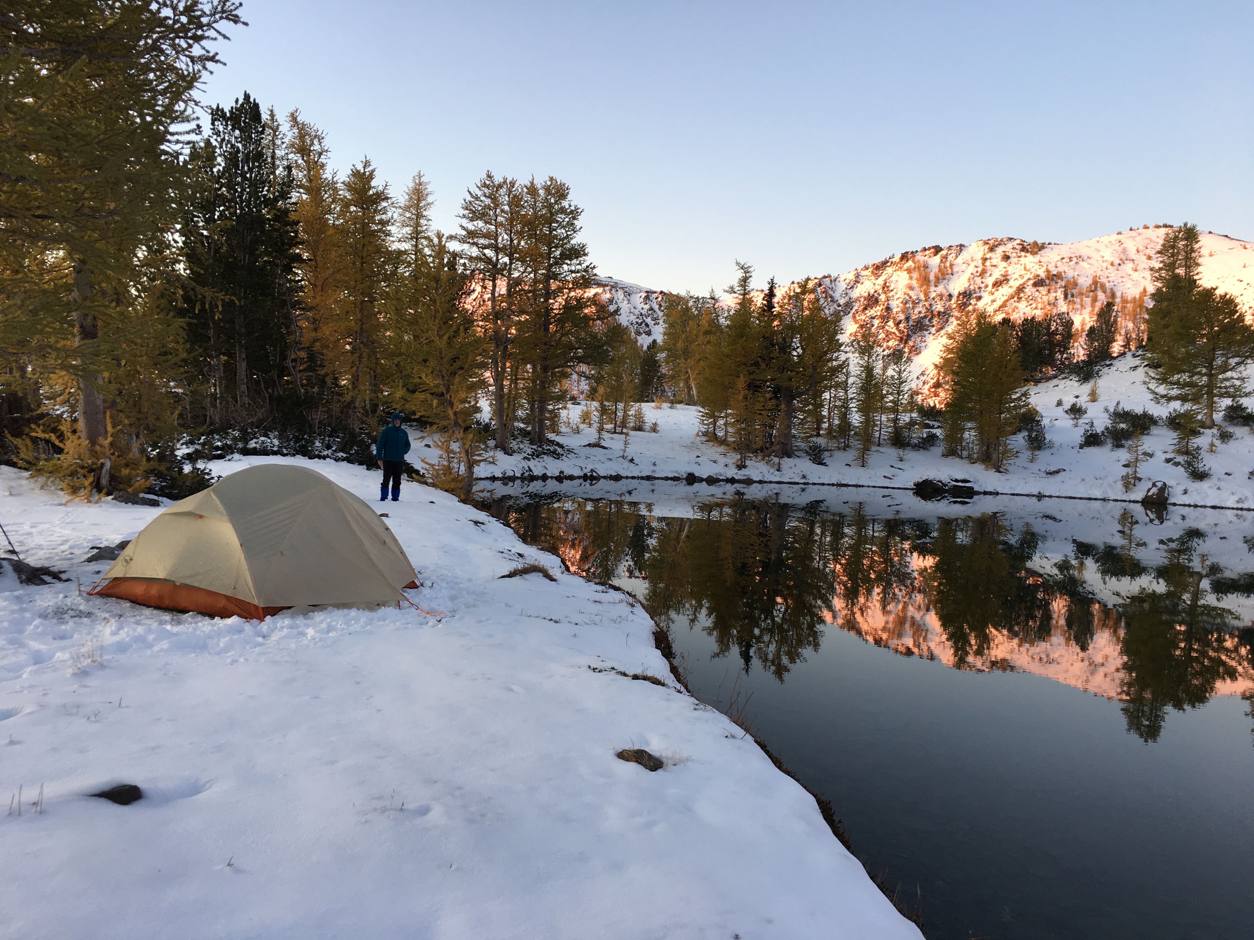 We arrived Lake Augusta Wednesday night just after sunset. Found a great campsite right next to the lake. There was only a few inches of snow so it was easy to set the tent up on bare ground. The temps were already dropping so we jump in the tent, had dinner, and made a couple of hot water bottles. The night was cold with a nearly full moon. Not a puff of wind.