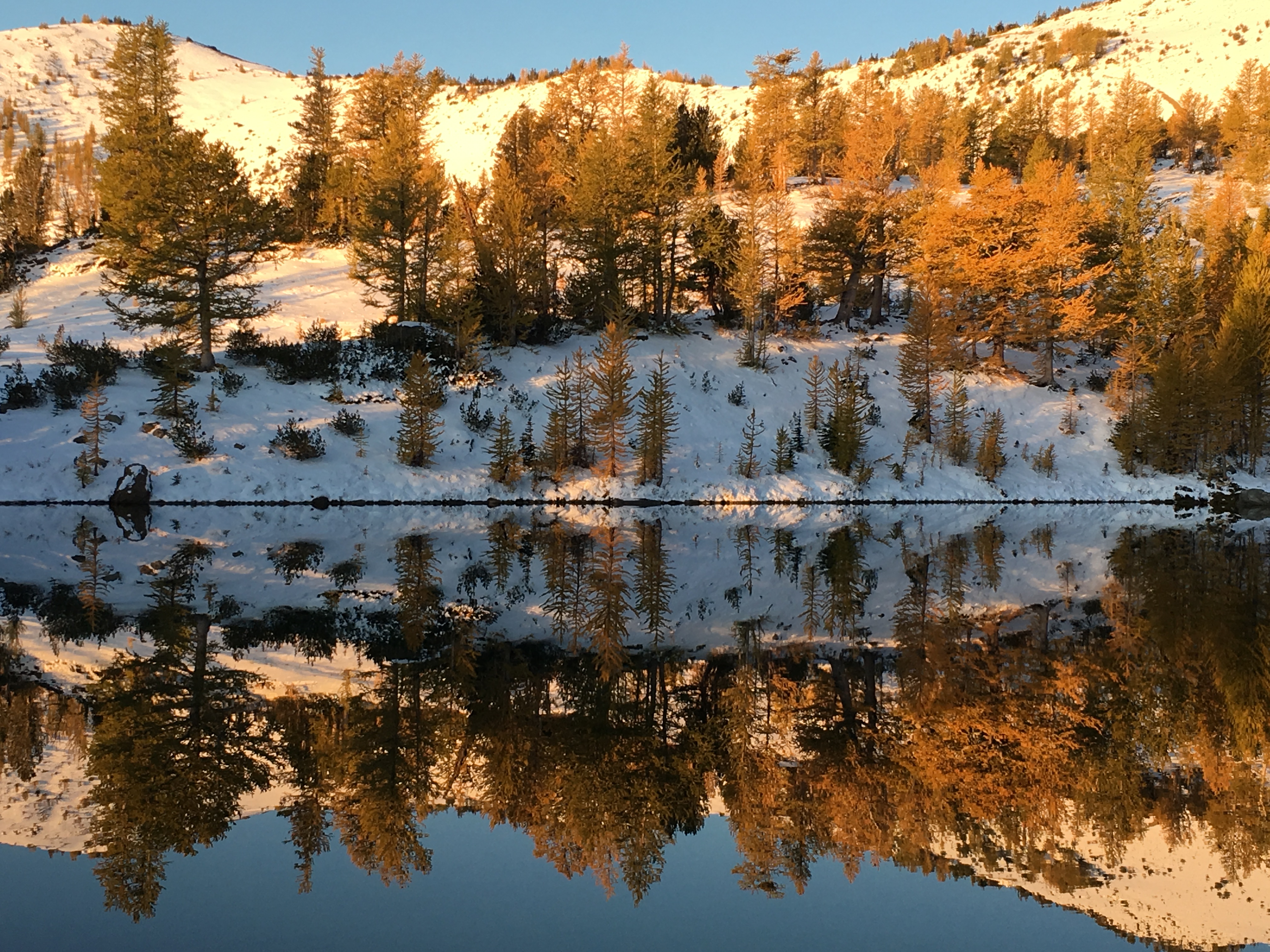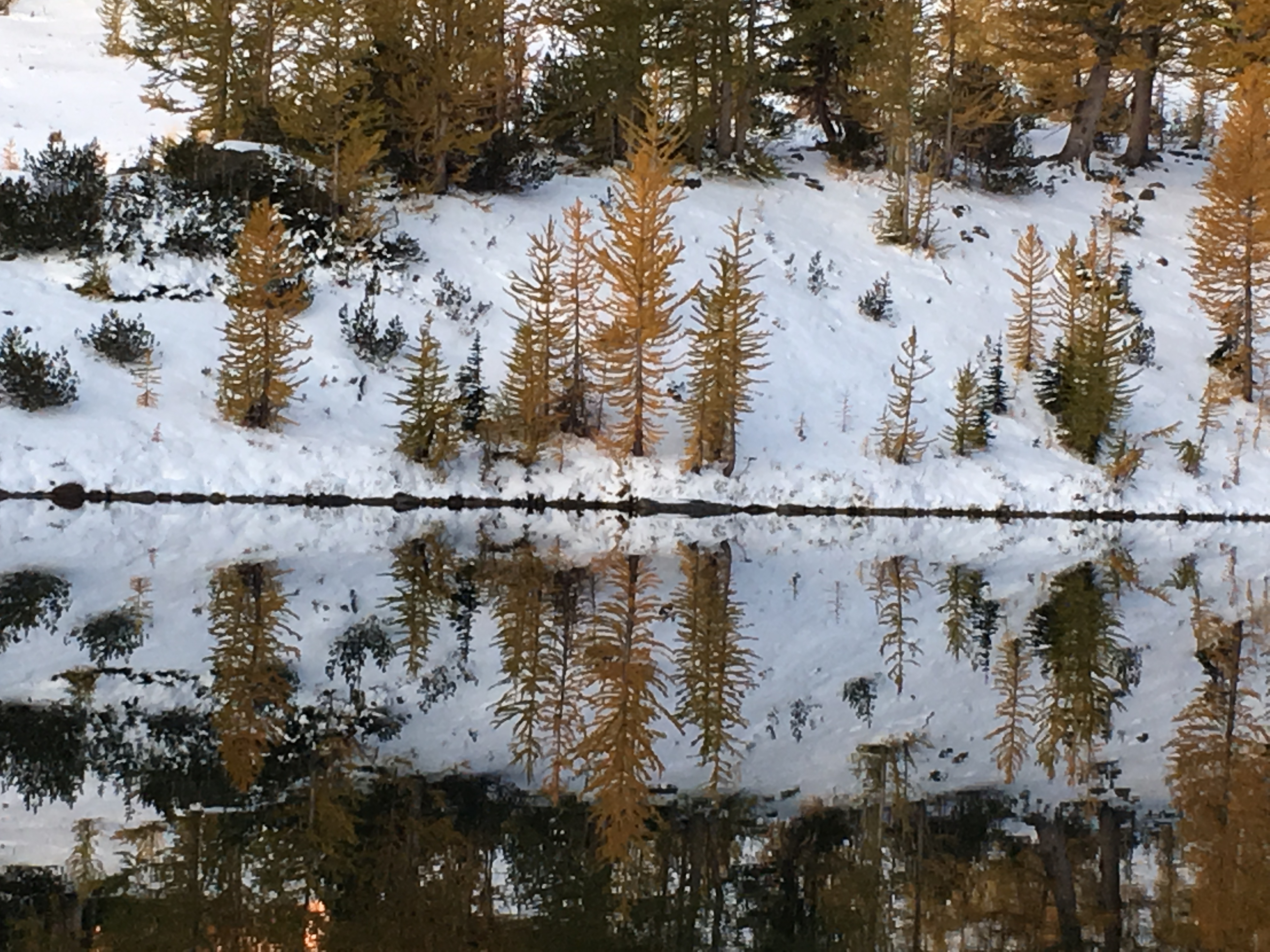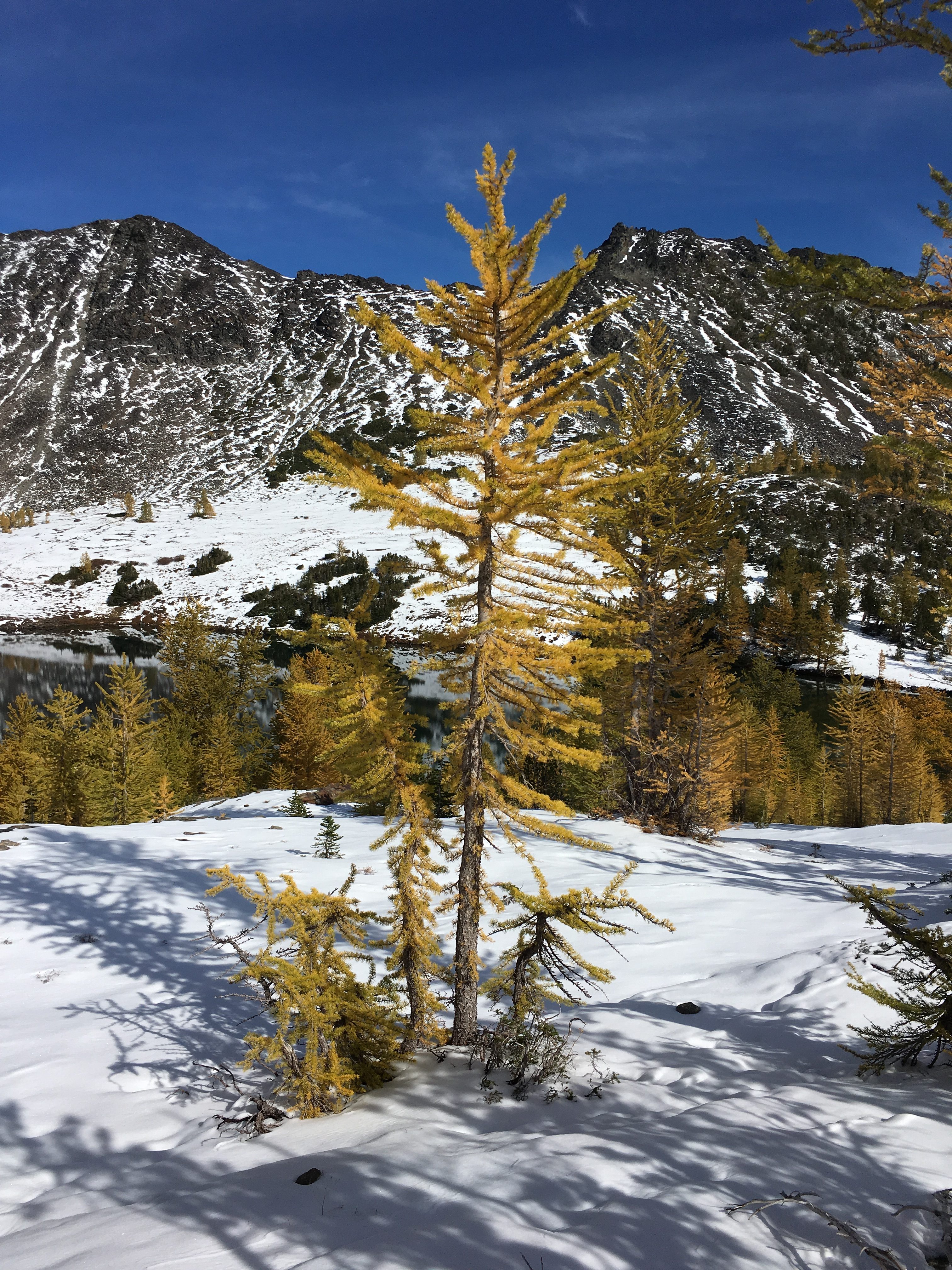 Then dropped down to the lake shore. I couldn’t resist hiking back to camp through the Golden Larch trees. Very magical.