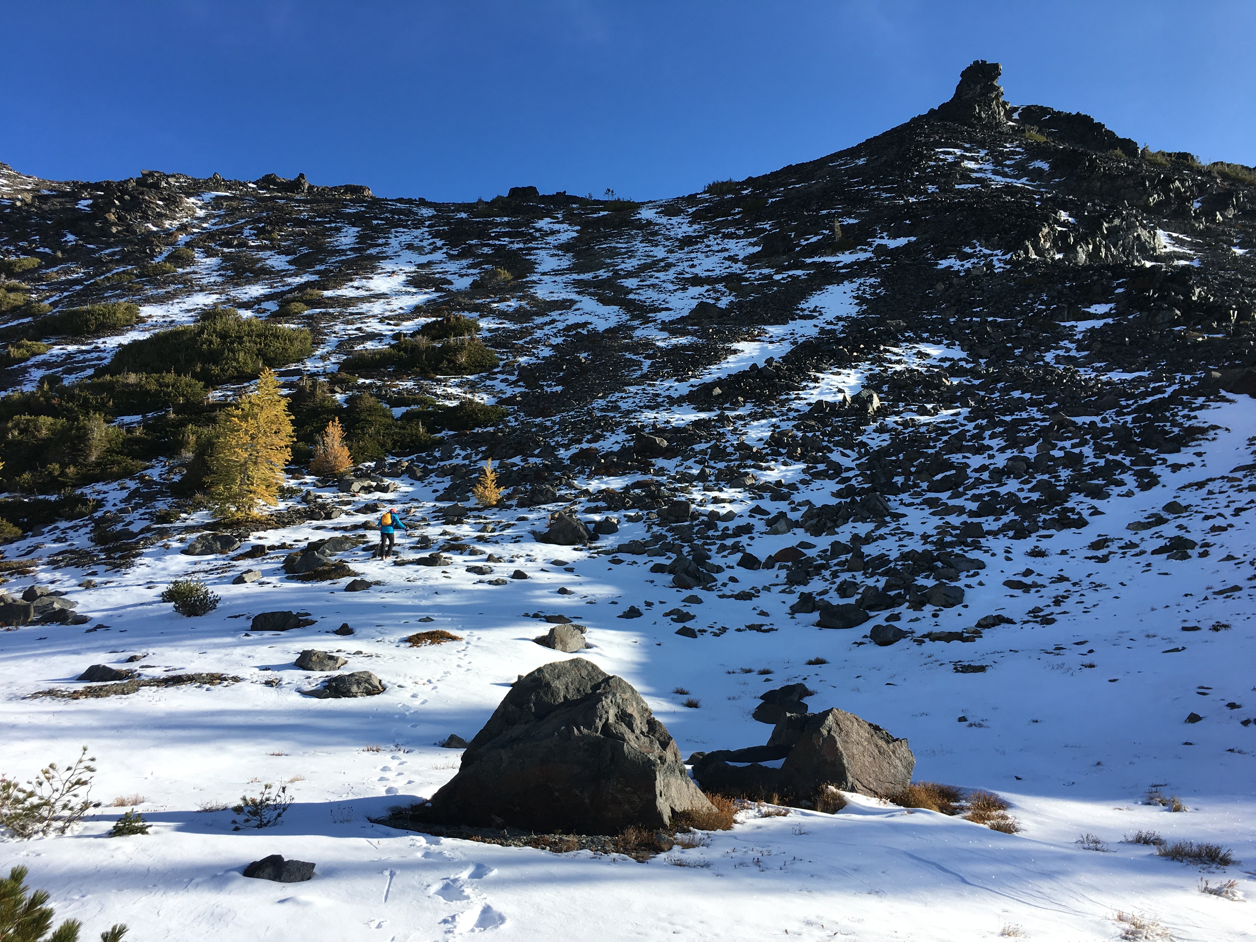 As we ate breakfast, we decided to do a loop and gain the ridge to the right of Big Jim Mountain and come down the ridge to the left of the lake.