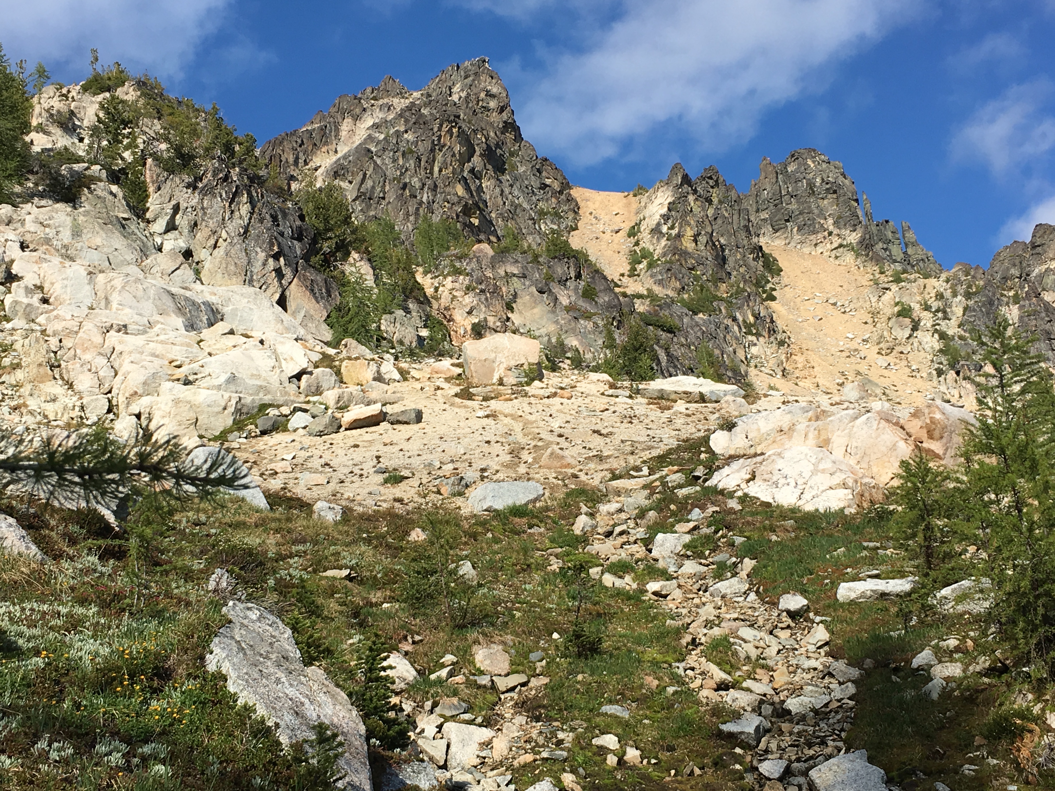 Day 2 was our big day with full packs. The plan was to hike up Pyramid Peak and then head cross-country to camp in a high basin near Grouse Pass.