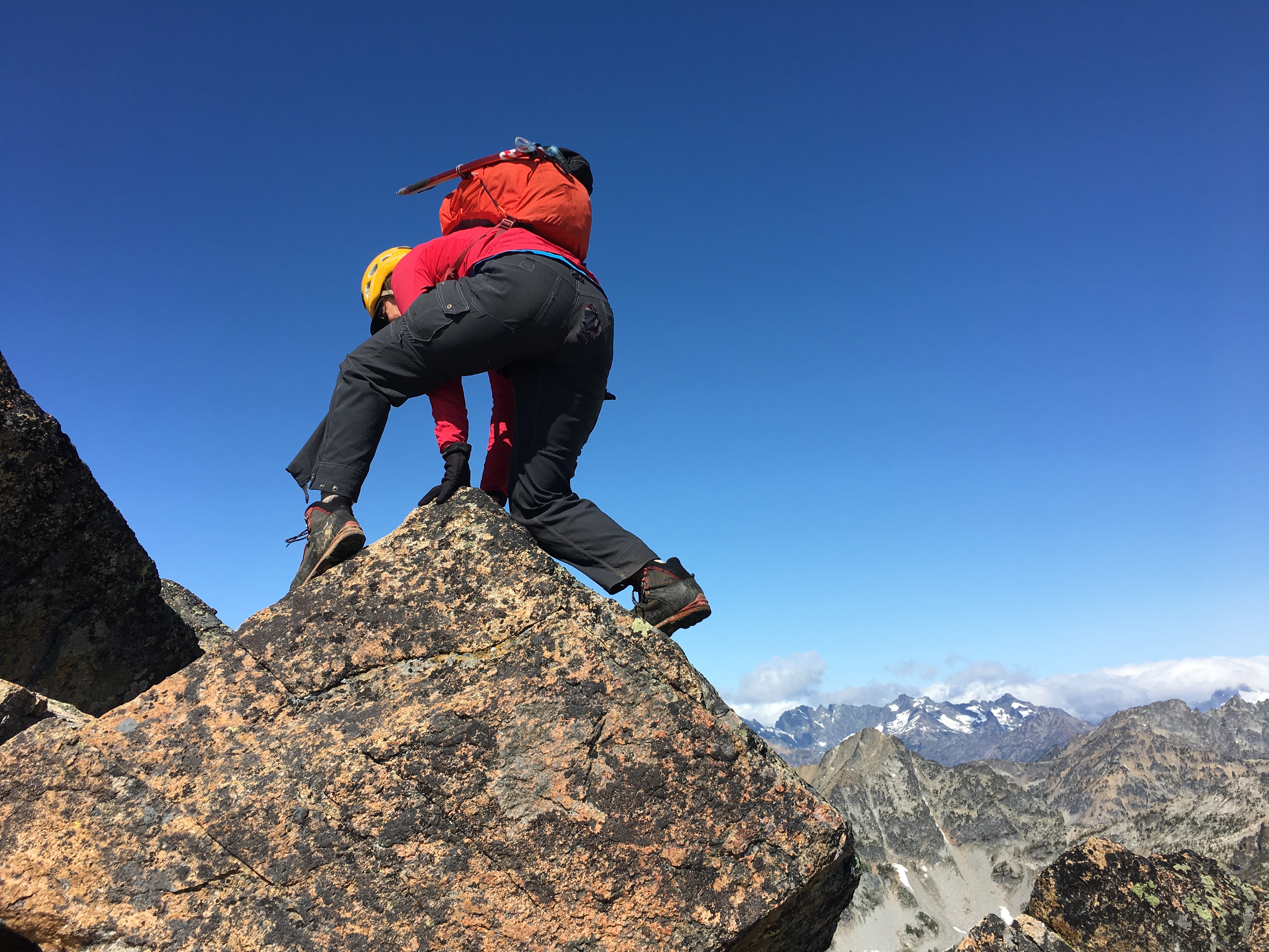 On Day 4, we packed up camp and headed up to Grouse Pass. At the pass, we dropped packs, pulled out our climbing gear, and headed up to the pinnacle for some morning fun.