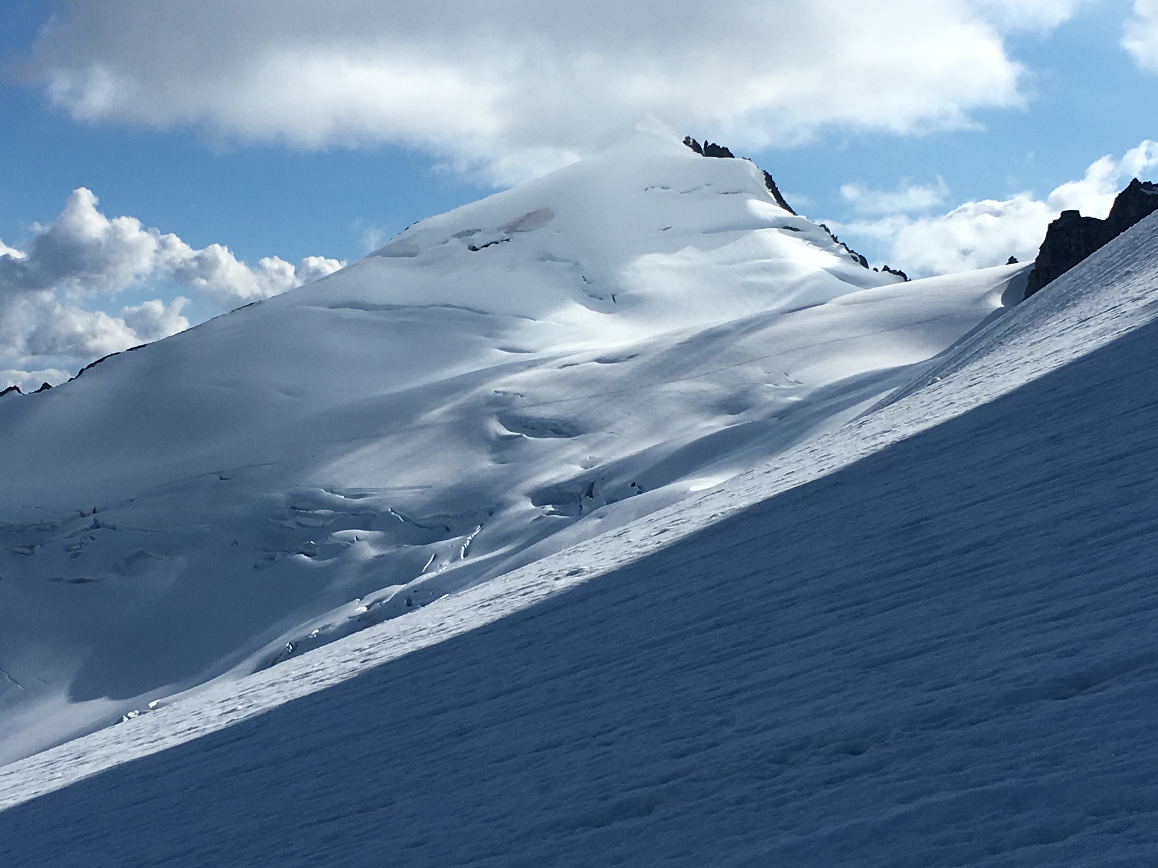 After a couple of hours, we were finally on the glacier traversing over to the col between the two peaks.