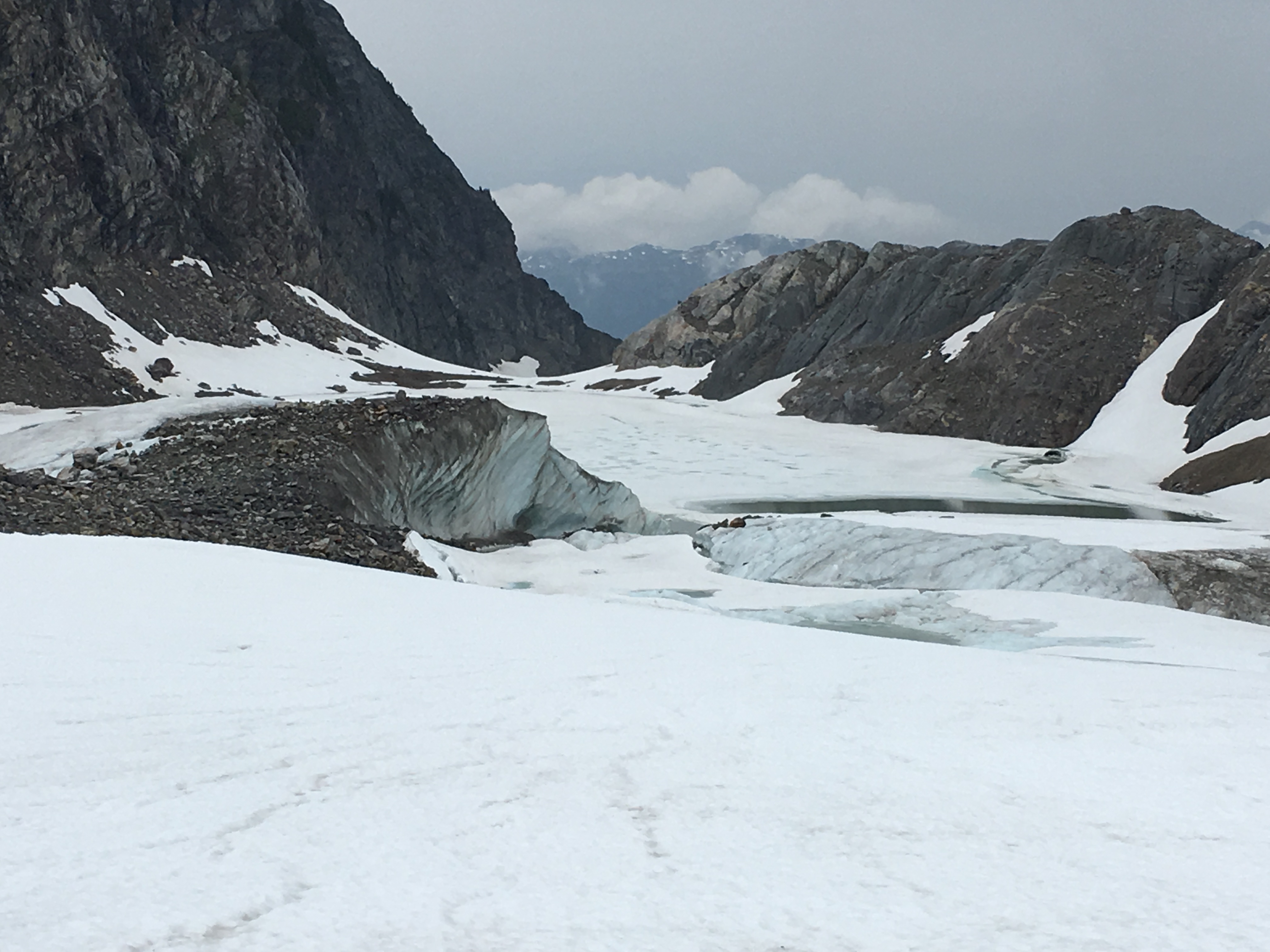 We could see a thunderstorm building in the distance so we left the summit sooner than we had wanted. We were able to get down the rocks before it began to hail. The snow field went better than we had thought and soon we were working our way back down to the col. About 200 feet from the col, it started to rain. Really rain.