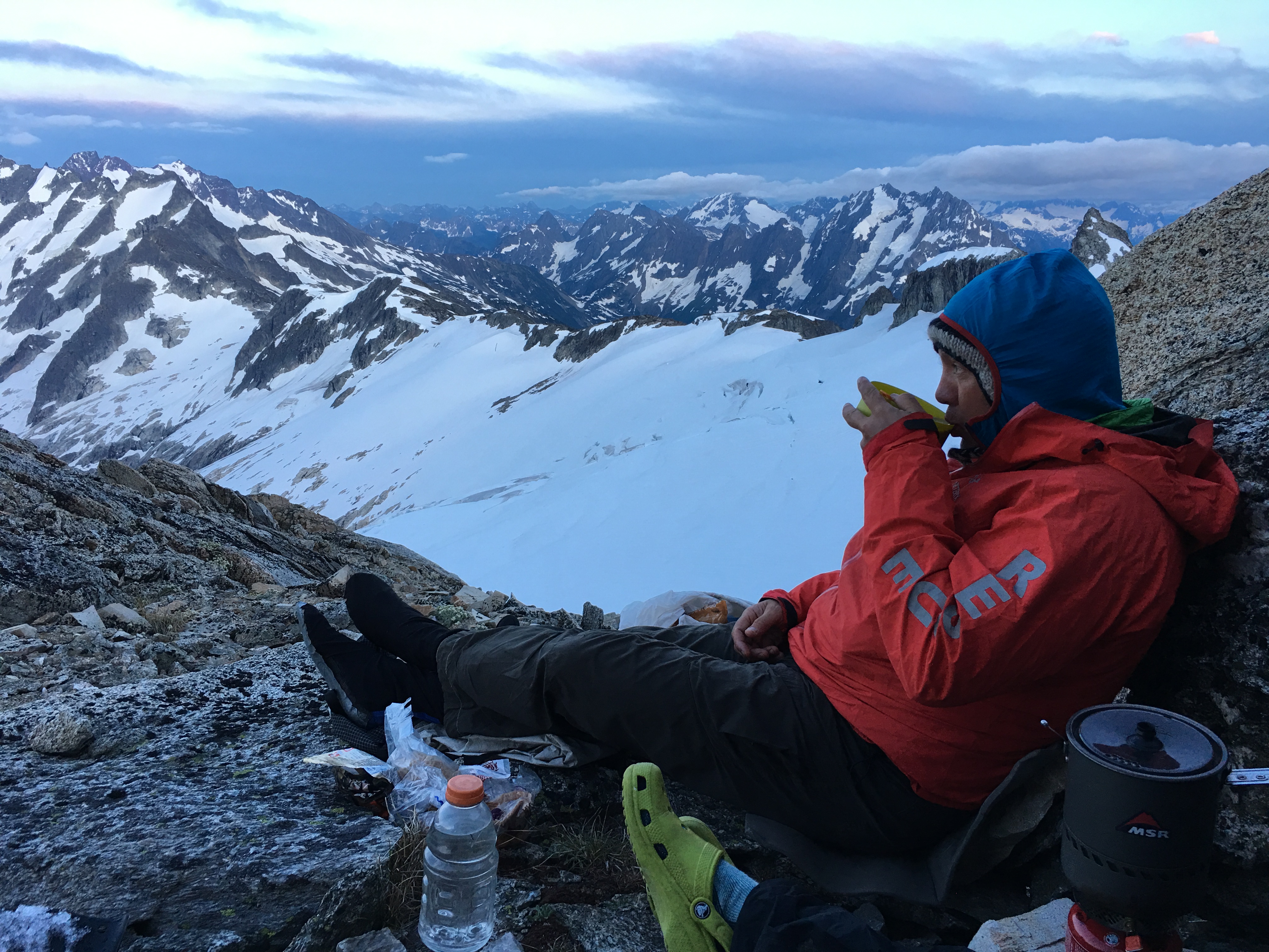 We enjoyed a wonderful dinner on a rock outcropping watching the clouds clear over the Inspiration Traverse.