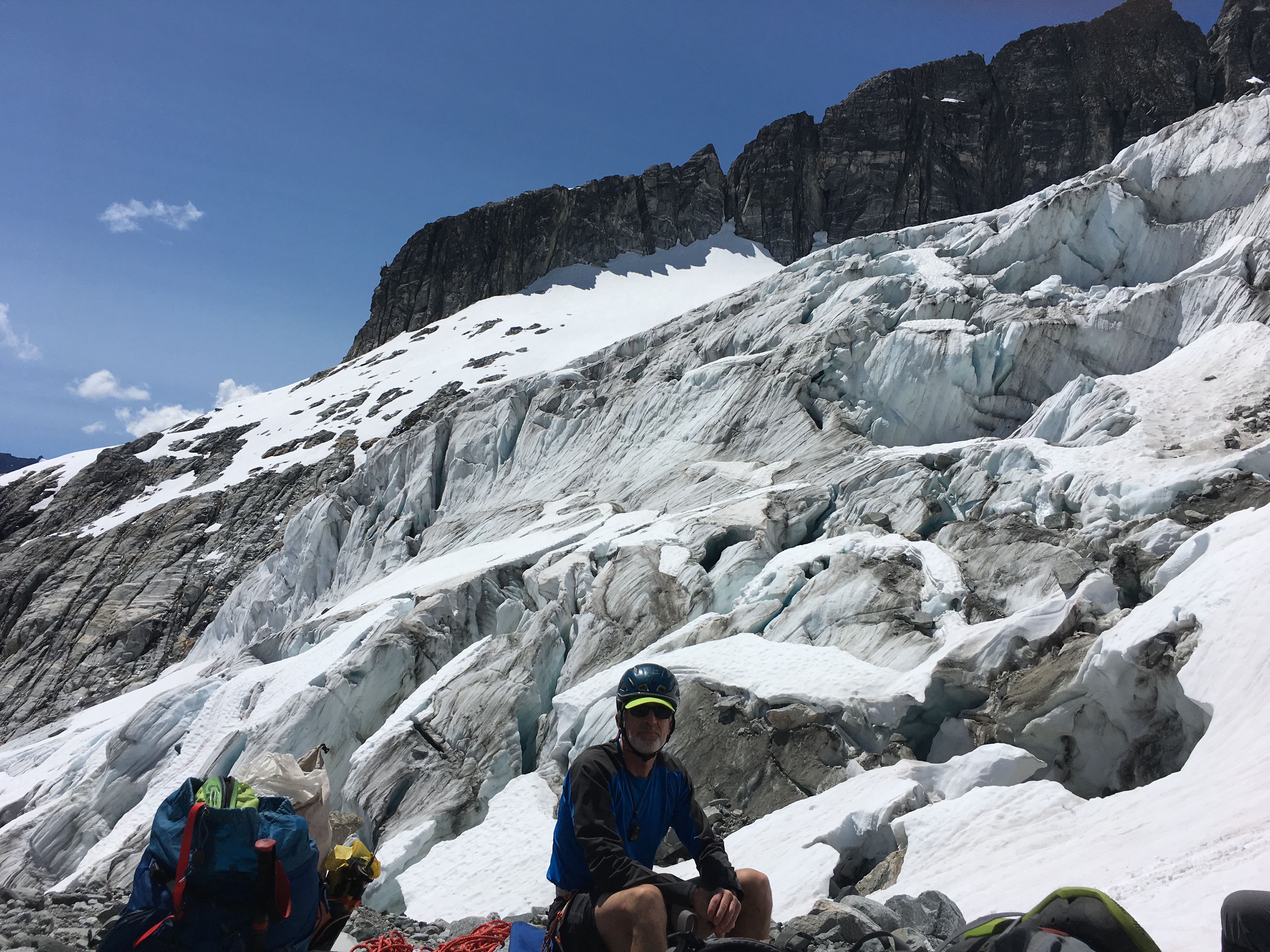 We returned to camp just as Kevin was waking up. After packing up and saying goodbye to Lisa, we headed back across the Eldorado Glacier following our steps from the day before. We arrived the gap in Tepeh Towers sooner than we expected. We were blessed with a break in the clouds.